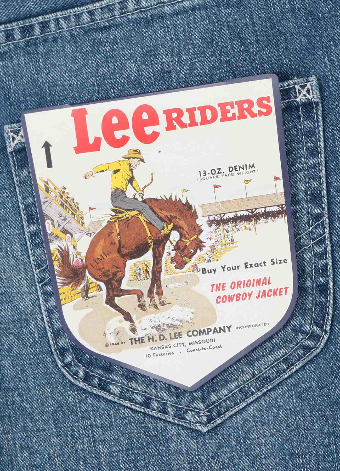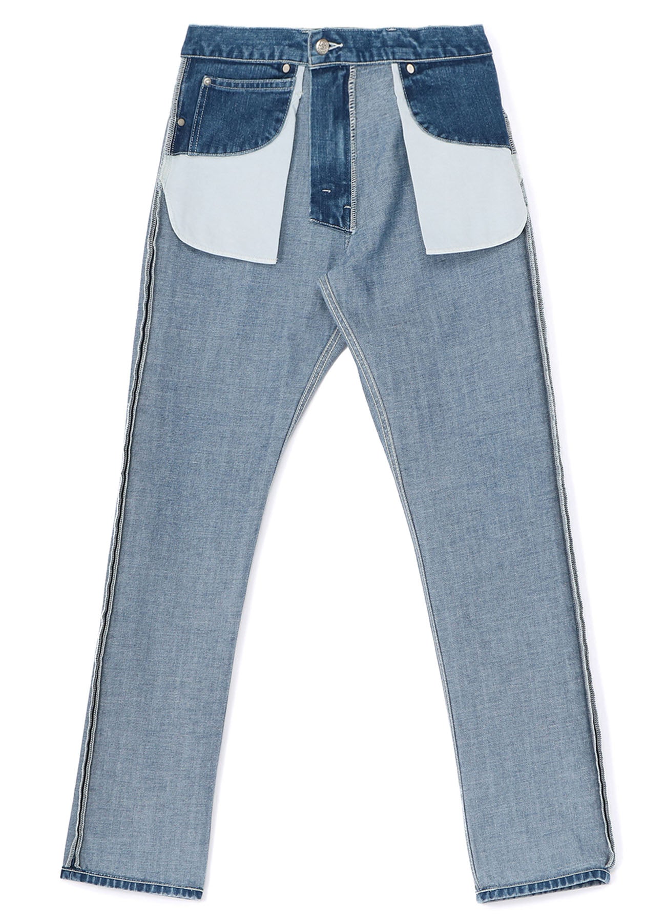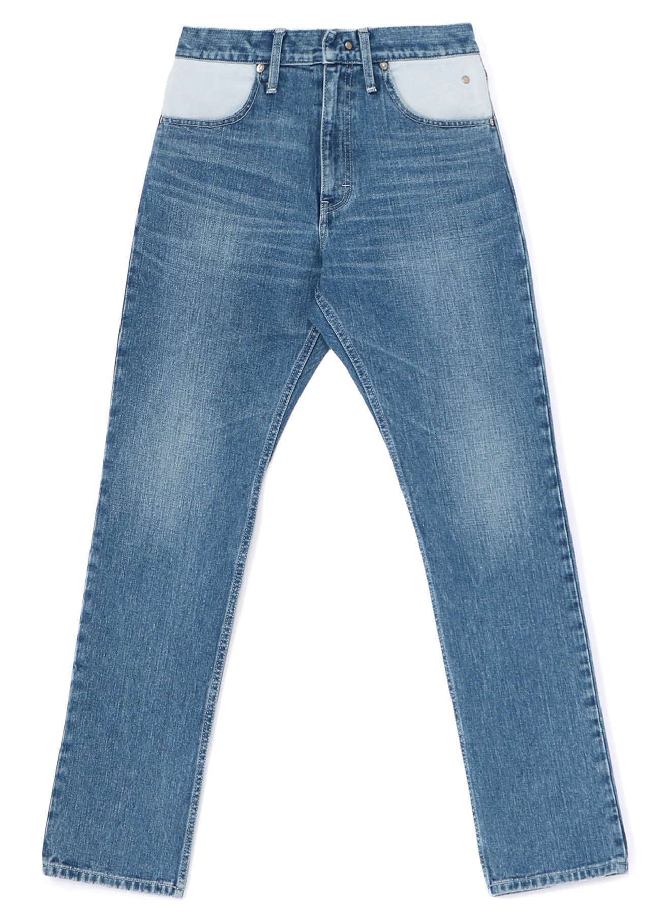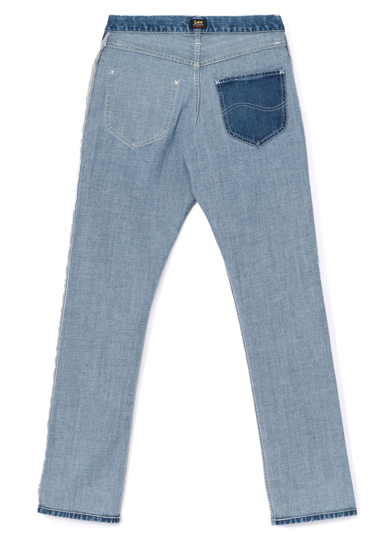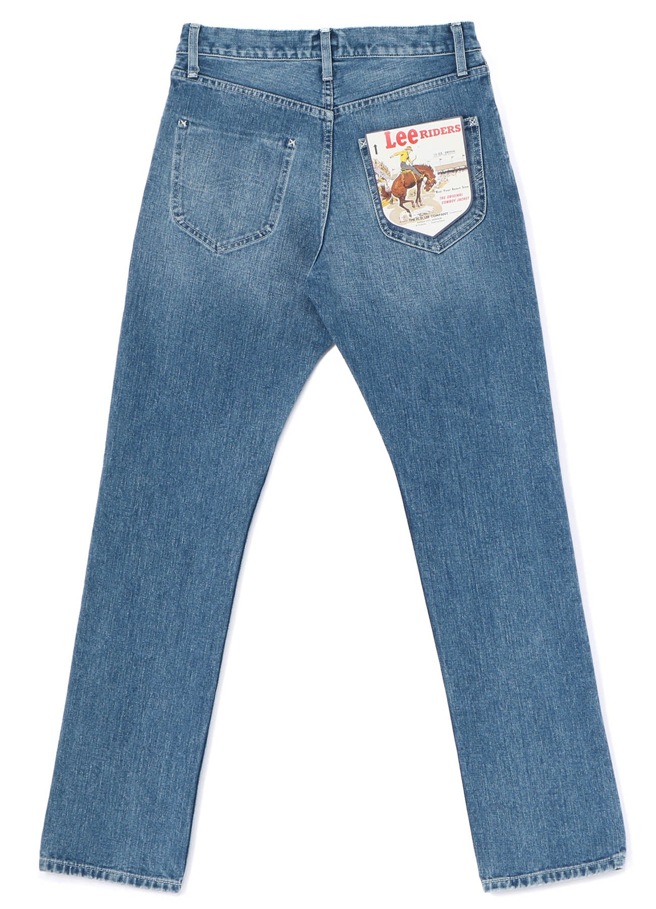The LIMI feu × Lee REVERSIBLE PANTS feature round-edged, bell-shaped back pockets with lazy S-stitches and X-shaped reinforcement stitches that prevent damage. Inside the back pocket is a LIMI feu name tag. The fabric is a 13oz Japanese-made indigo perfect for RIDERS, with a horse-riding design on the flasher.