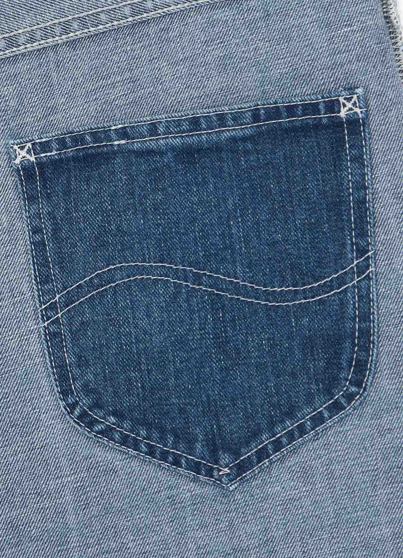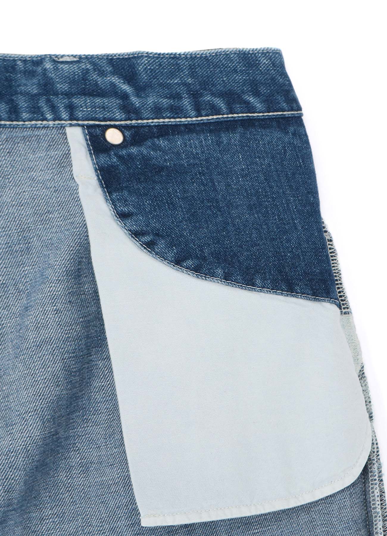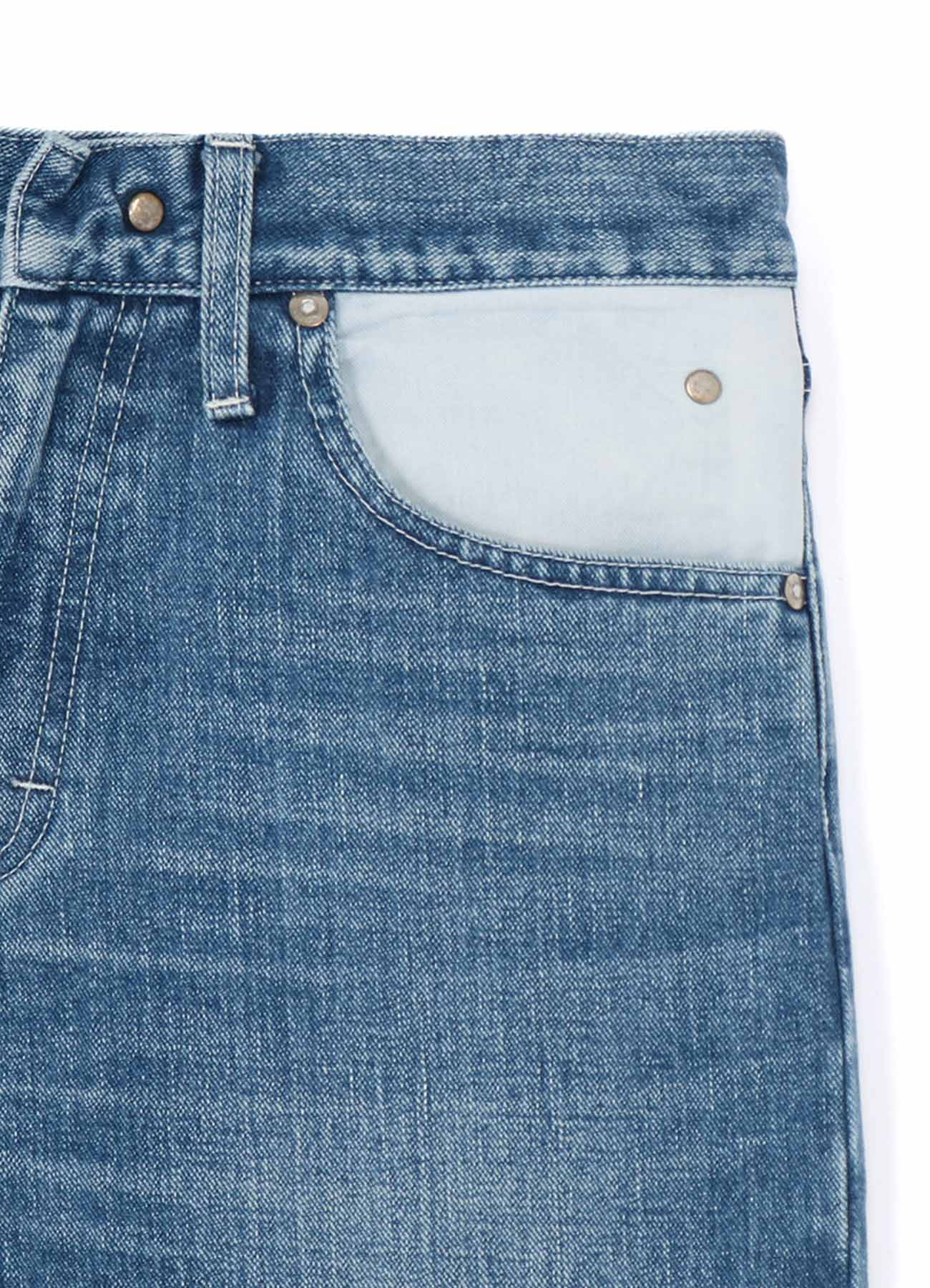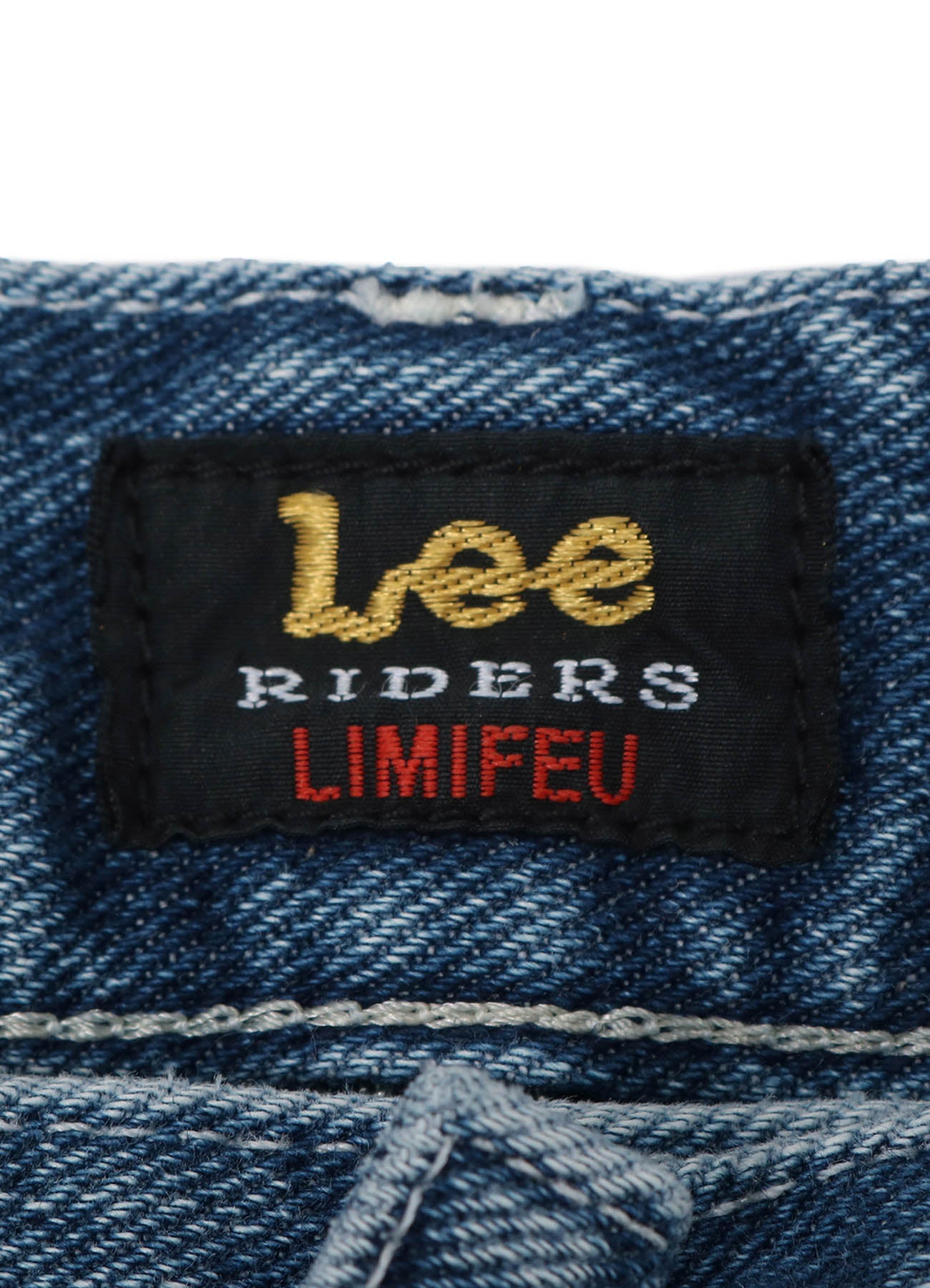 The LIMI feu × Lee REVERSIBLE PANTS feature round-edged, bell-shaped back pockets with lazy S-stitches and X-shaped reinforcement stitches that prevent damage. Inside the back pocket is a LIMI feu name tag. The fabric is a 13oz Japanese-made indigo perfect for RIDERS, with a horse-riding design on the flasher.
