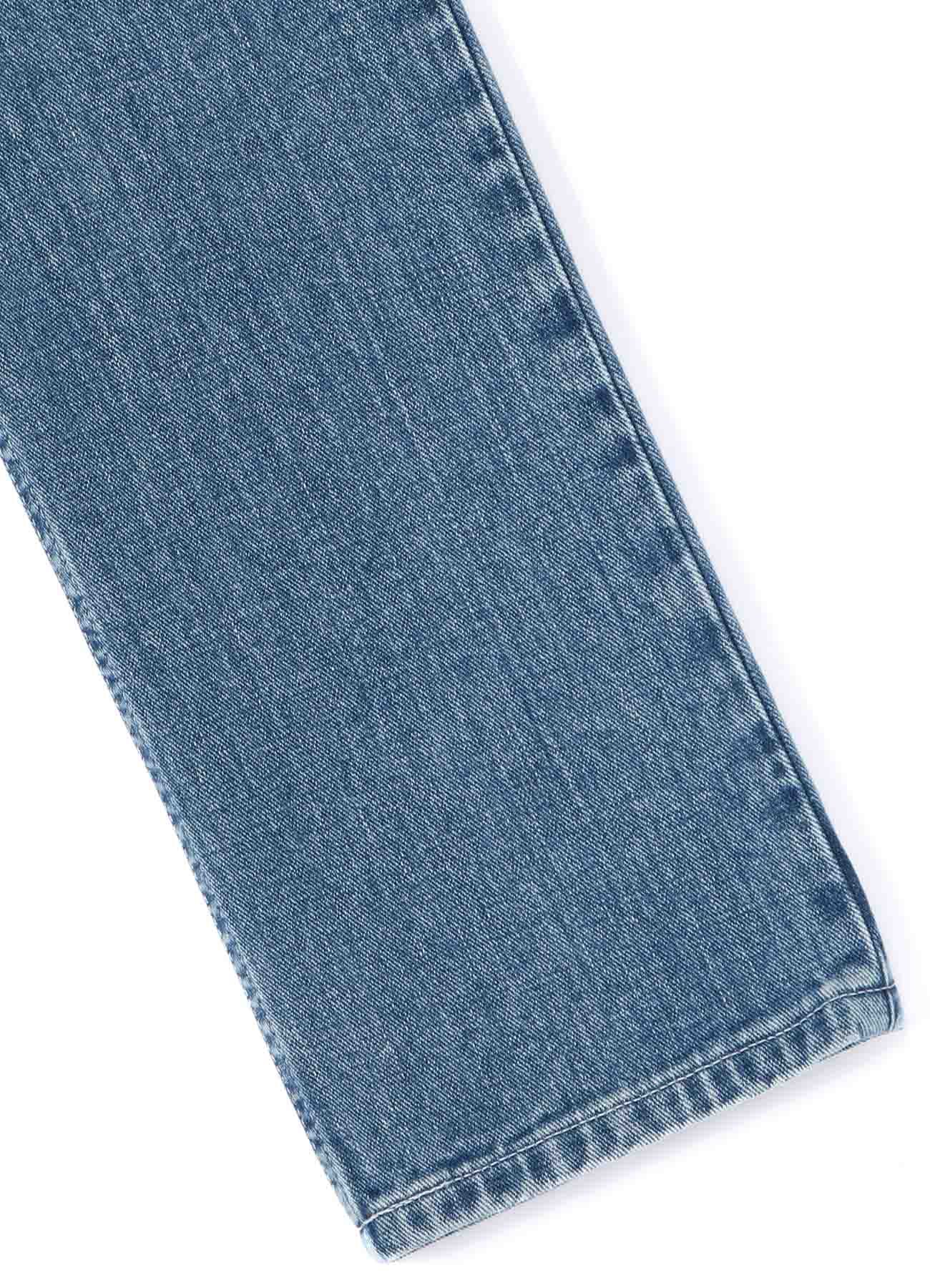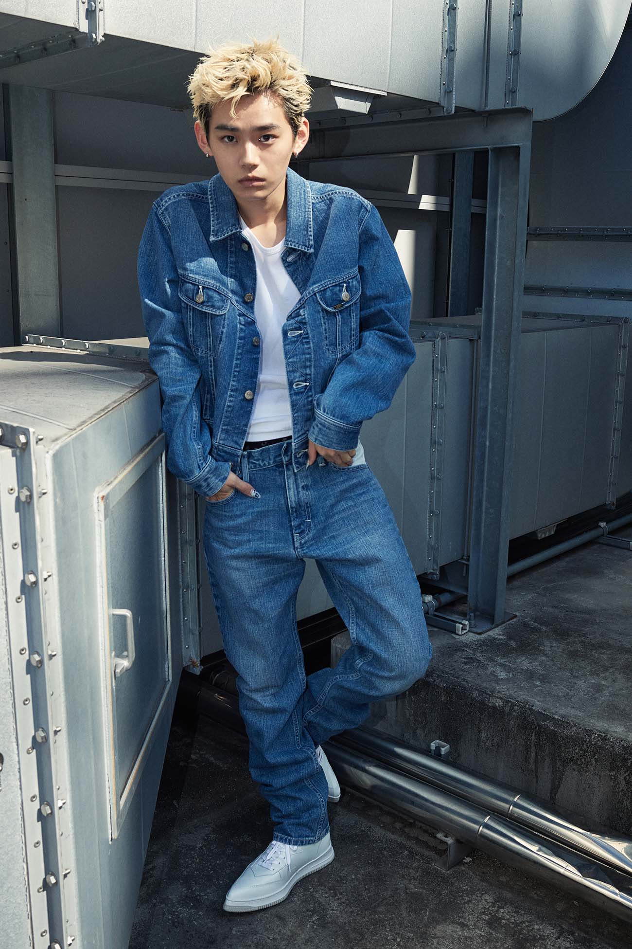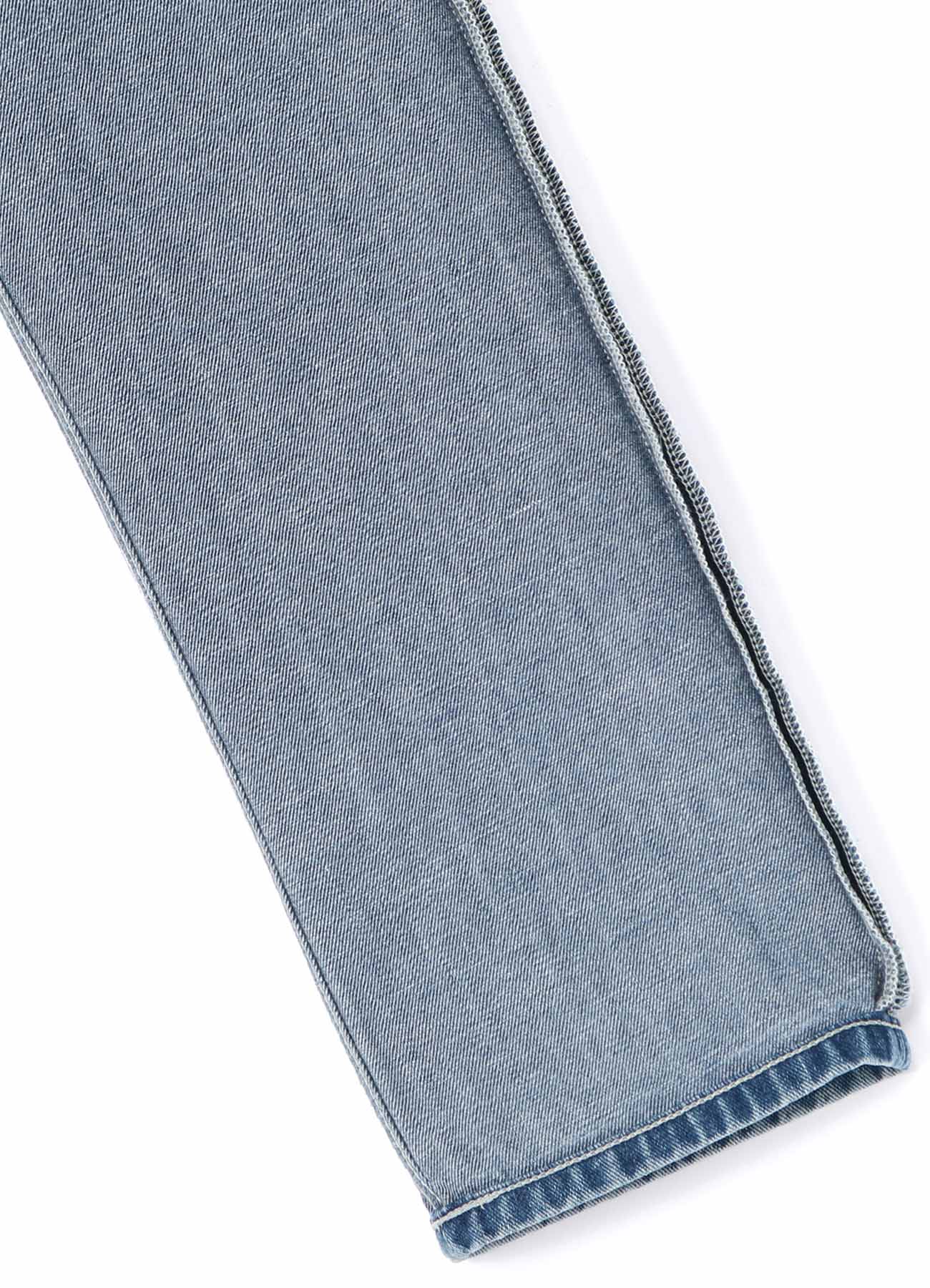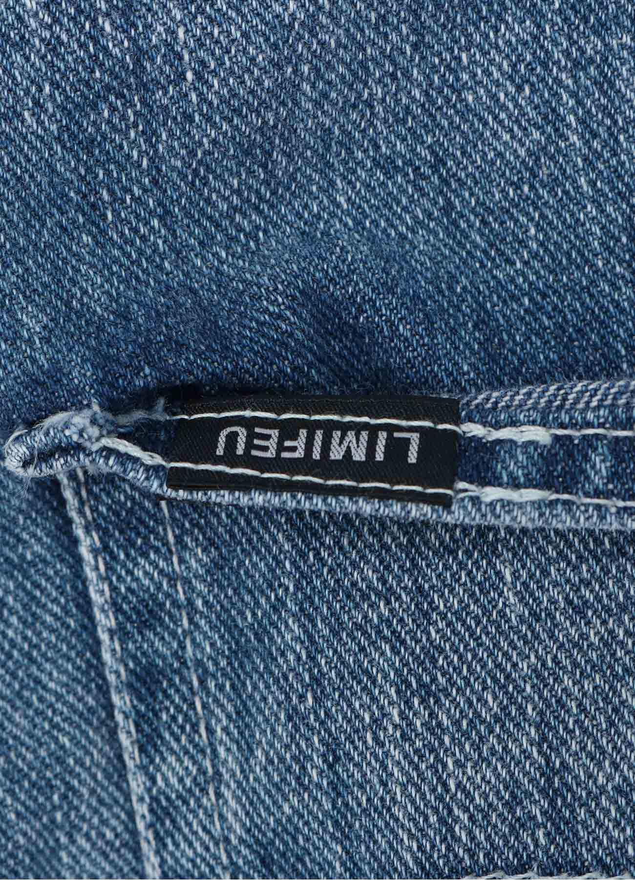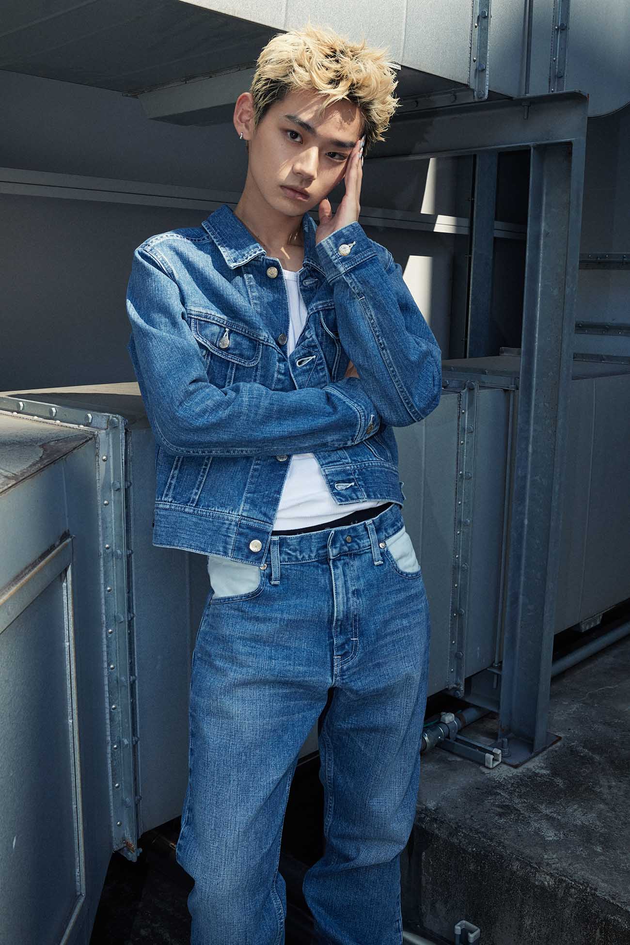 The LIMI feu × Lee REVERSIBLE PANTS feature round-edged, bell-shaped back pockets with lazy S-stitches and X-shaped reinforcement stitches that prevent damage. Inside the back pocket is a LIMI feu name tag. The fabric is a 13oz Japanese-made indigo perfect for RIDERS, with a horse-riding design on the flasher.