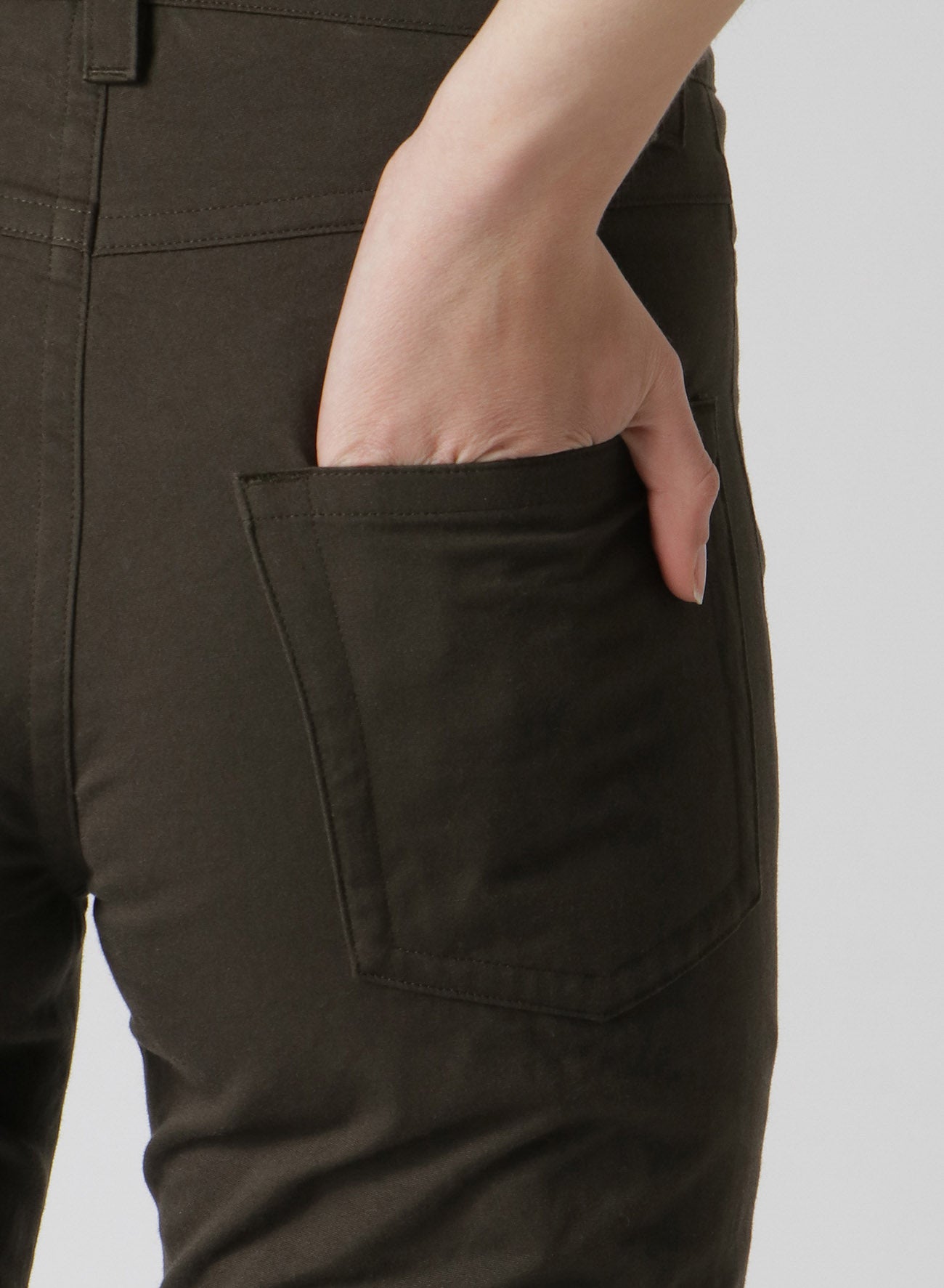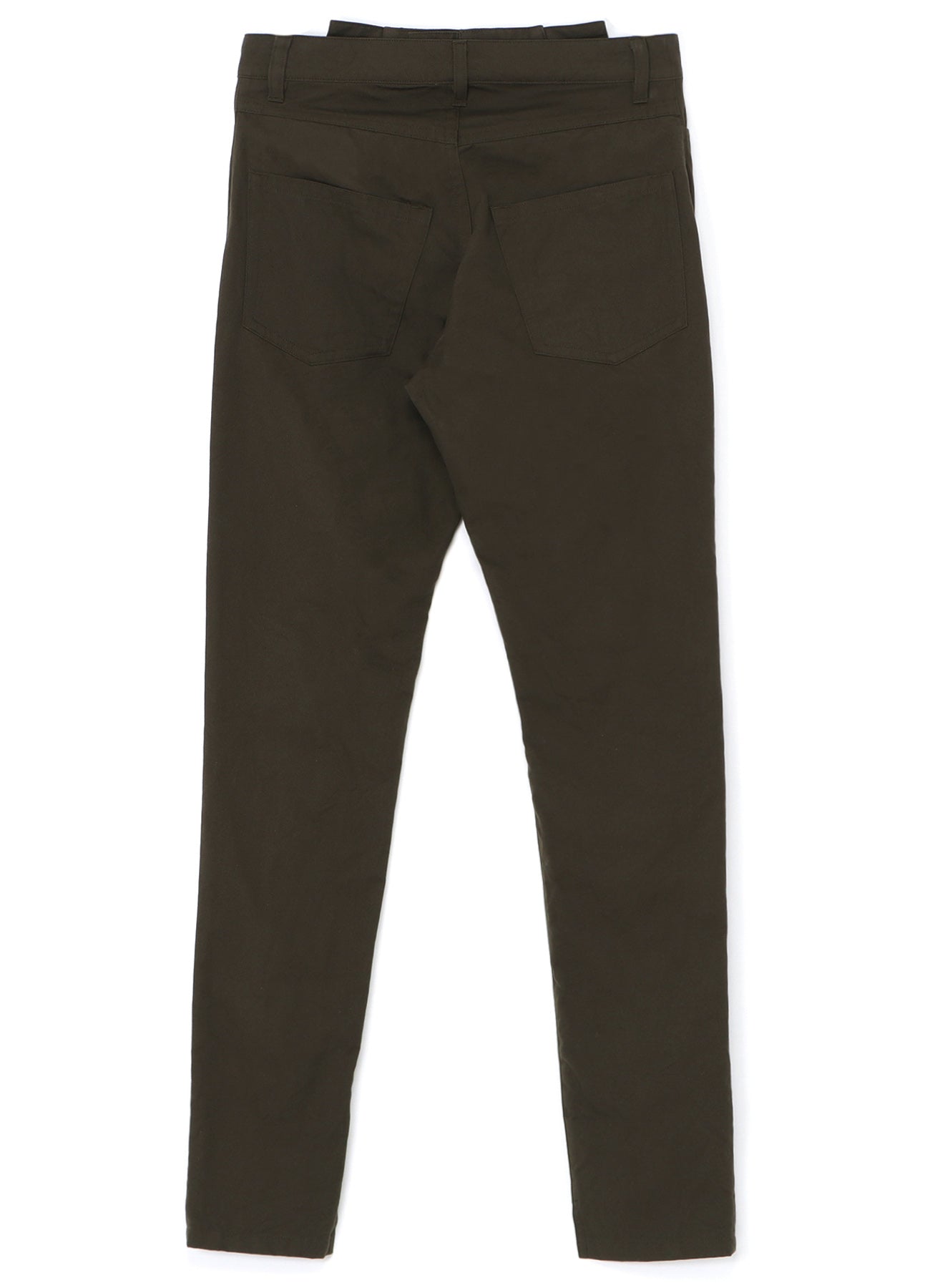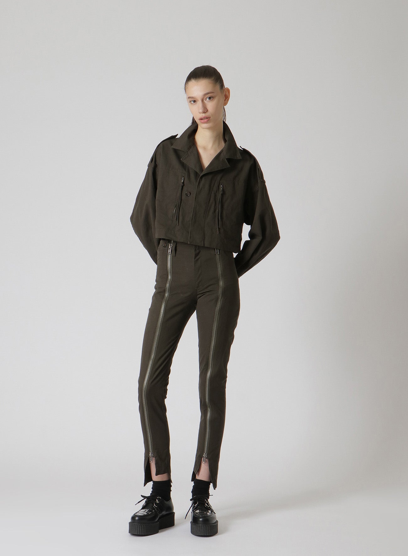 This weather cloth is high-density woven cotton with a moderate sheen and a firm texture, finished with soft-washed processing to create a natural wrinkle effect. The front double zipper adds versatility to the pants' silhouette. Available in S and M sizes, these pants are designed to fit close to the body without excess fabric.