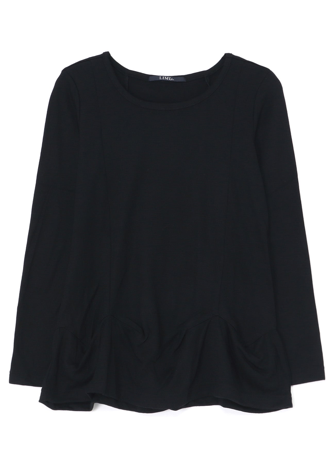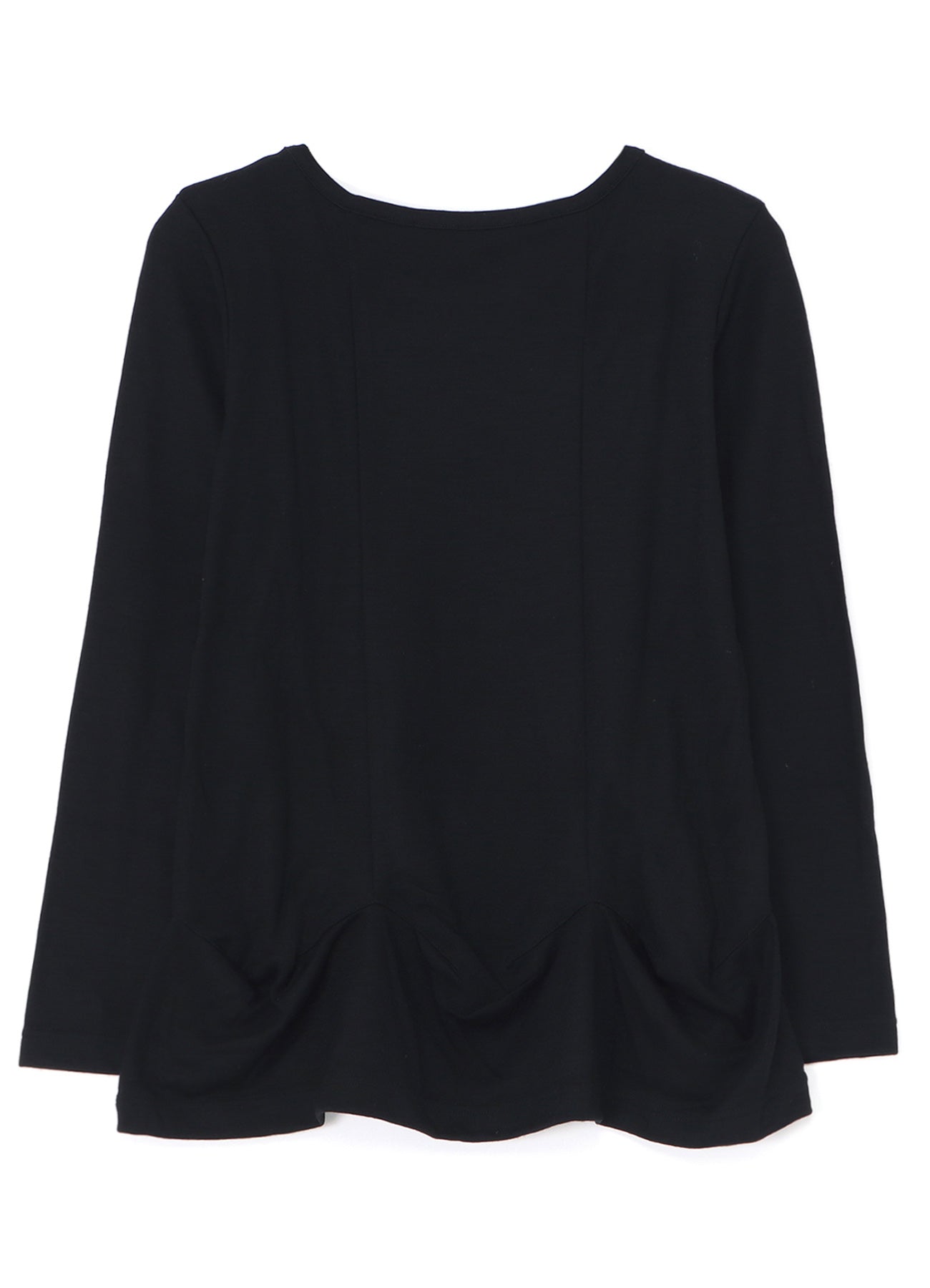 This top features a low-nap, clear-textured wool fabric with a good drape and moderate firmness. Highly stretchable, it is thin and soft to the touch. The hem has darts that create elegant drapery.