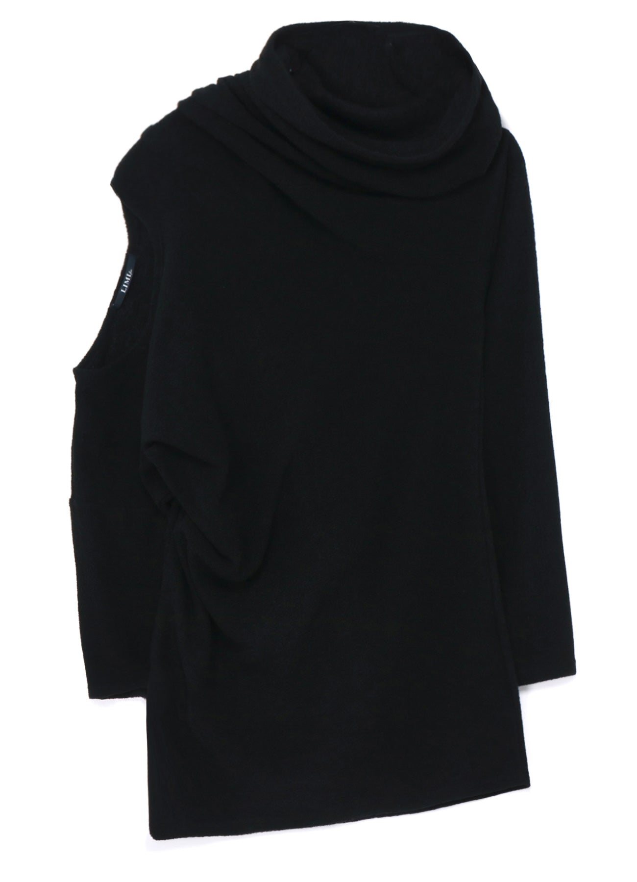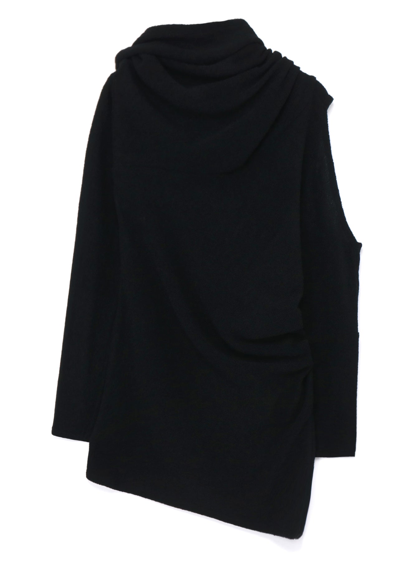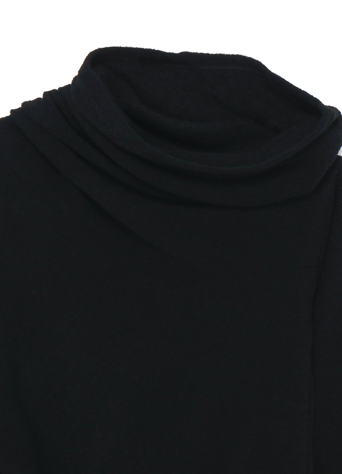 Indulge in the voluminous, soft, and warm fabric of this top. With a woolly texture ideal for casual styling, it offers two unique wearing methods. The crew-neck design features wide sleeves with draped fabric, or you can opt for a mock neck with an open right shoulder.