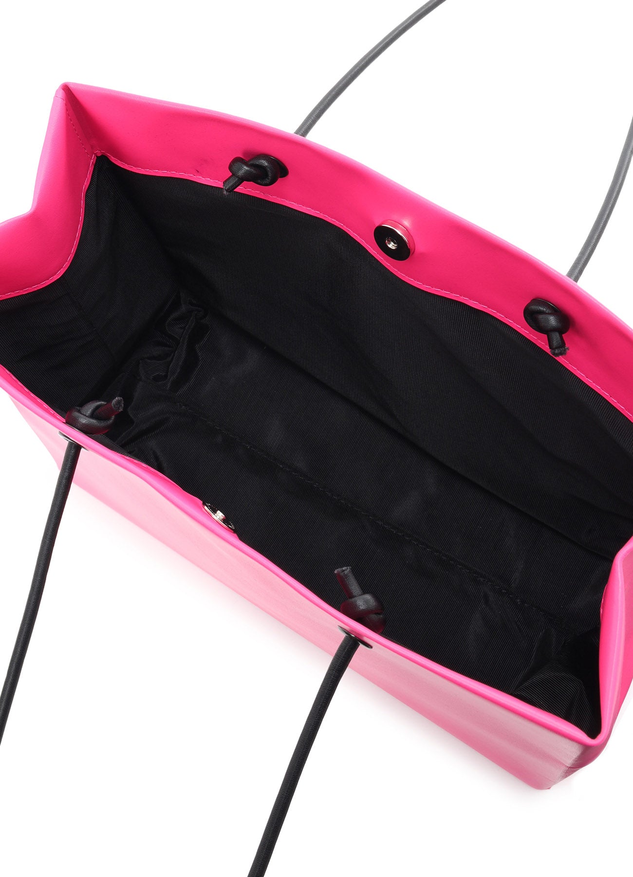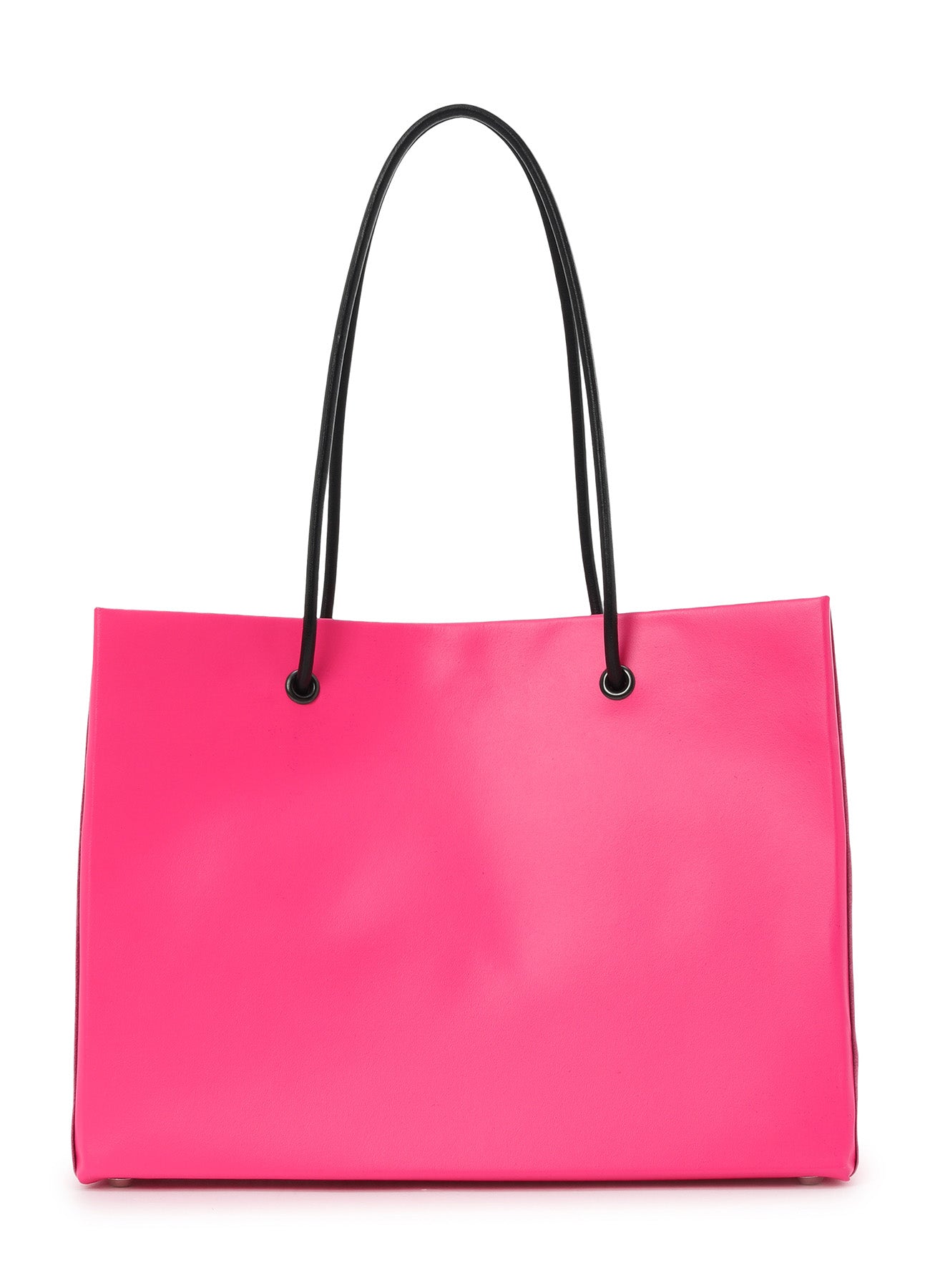 A meticulously tailored genuine leather bag mirrors LIMI feu's shopper size. Available in two sizes, it features an original neon pink color and a shoulder strap option. Includes a logo-embossed black tag with a card-sized pocket on its reverse side.