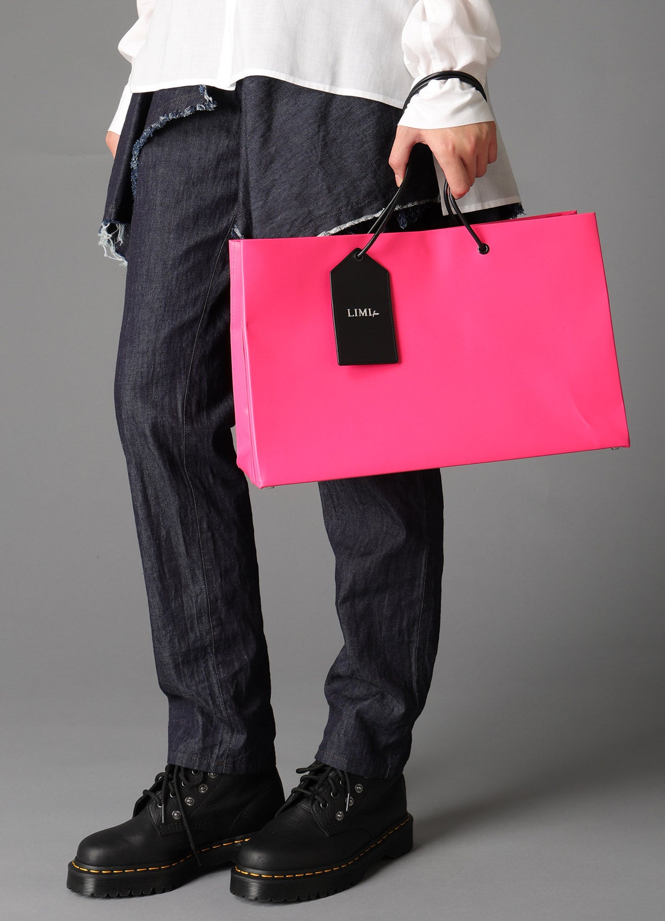 The custom-made shoulder bags are crafted in genuine leather, perfectly replicating the original neon pink of LIMI feu’s shop bags. Available in two sizes, these bags feature the same dimensions as the LIMI feu shopper. A black logo tag with a card-sized pocket on the reverse adds functionality.