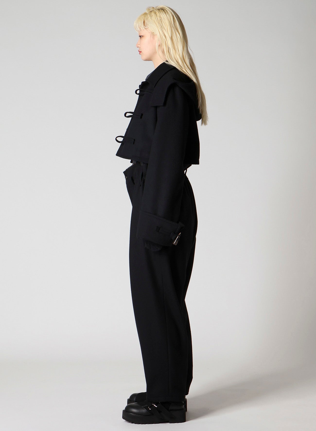 "This short duffle coat is crafted from a classic wool fabric that is woven densely with thick yarns, fulled, napped, and finished with cut peaching. Despite its appearance, the material is lightweight, warm, and characterized by a dry touch. It's an ideal piece for transitional seasons.