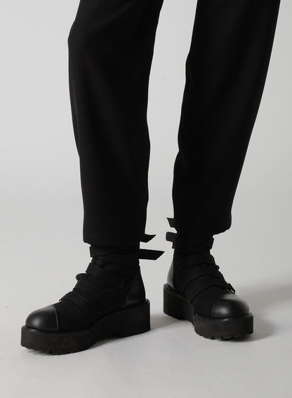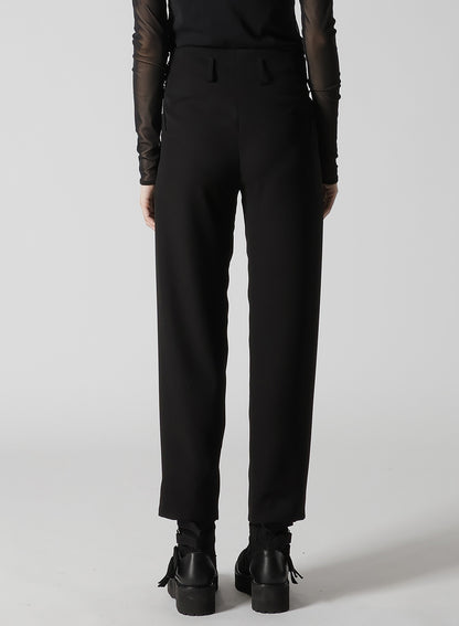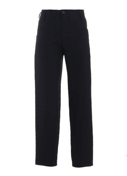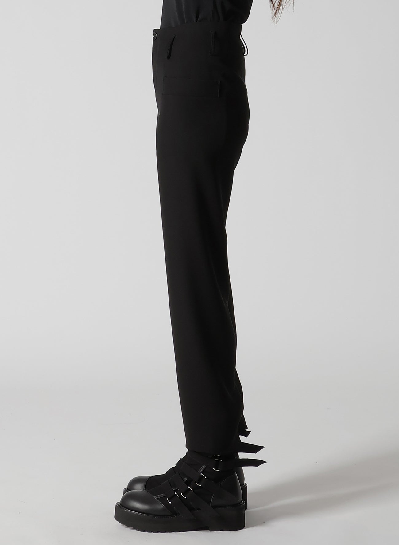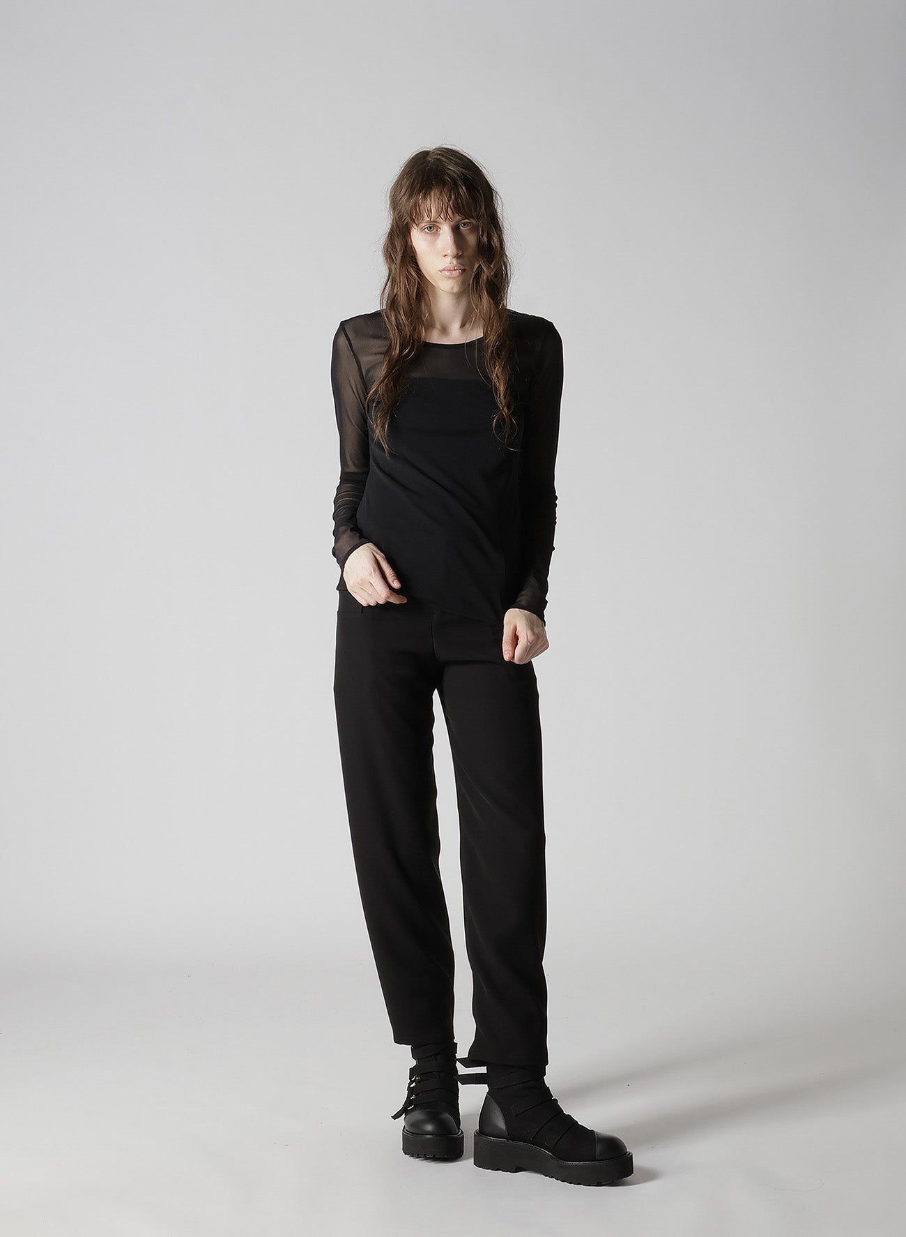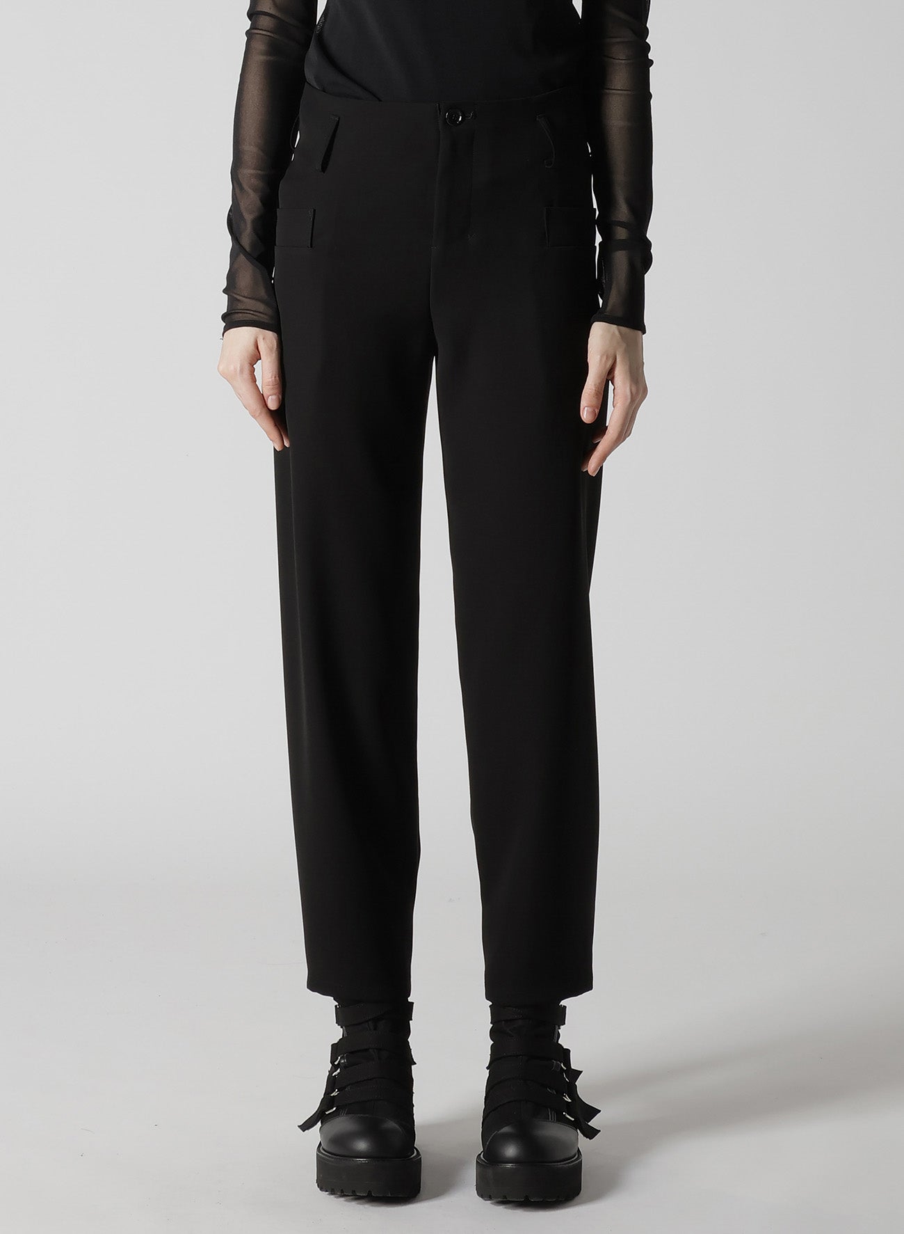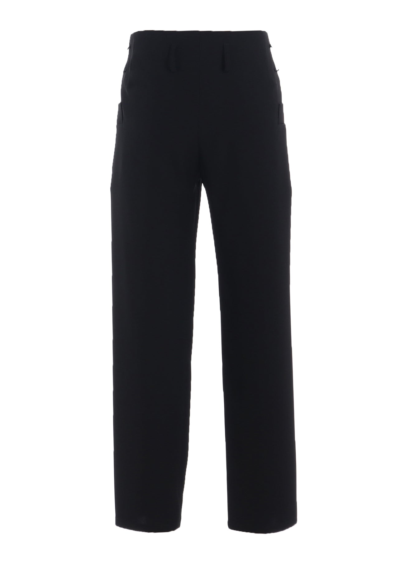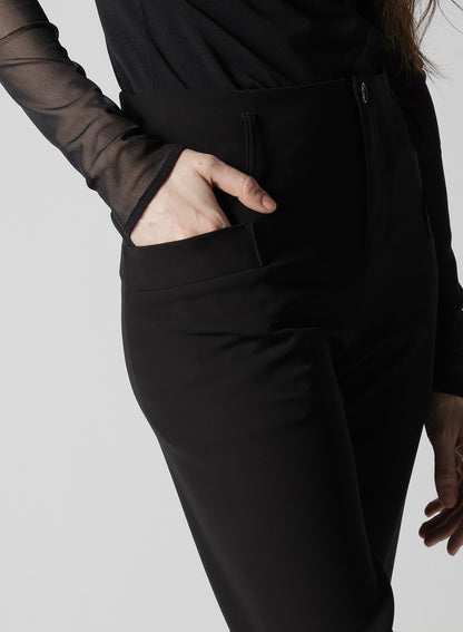 This mid-weight double satin polyester fabric is strong yet stretches, rebounds, and feels light. It features a smooth reverse satin texture and a soft, comfortable touch. The deep black is achieved through special dye processing. The pants have a slim, straight silhouette with a versatile basic style and cropped length for pairing with boots.