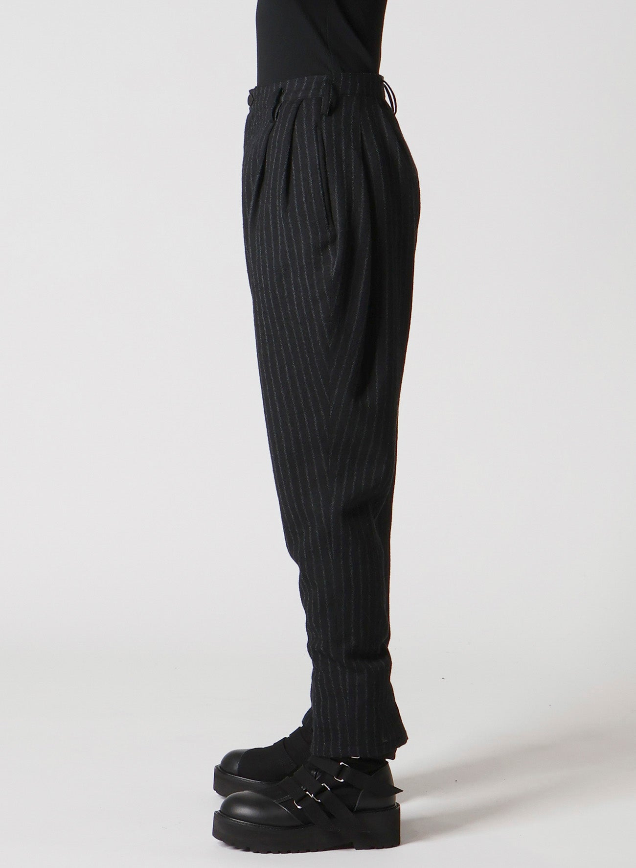 This product features a loosely woven gauze-like stripe fabric, fulled for a light, soft texture. The cutting-edge sewing yields a rag-like look with intentional fraying unique to each piece. The pleated pants boast a rounded silhouette above the knee, tapering to a slim straight line below.