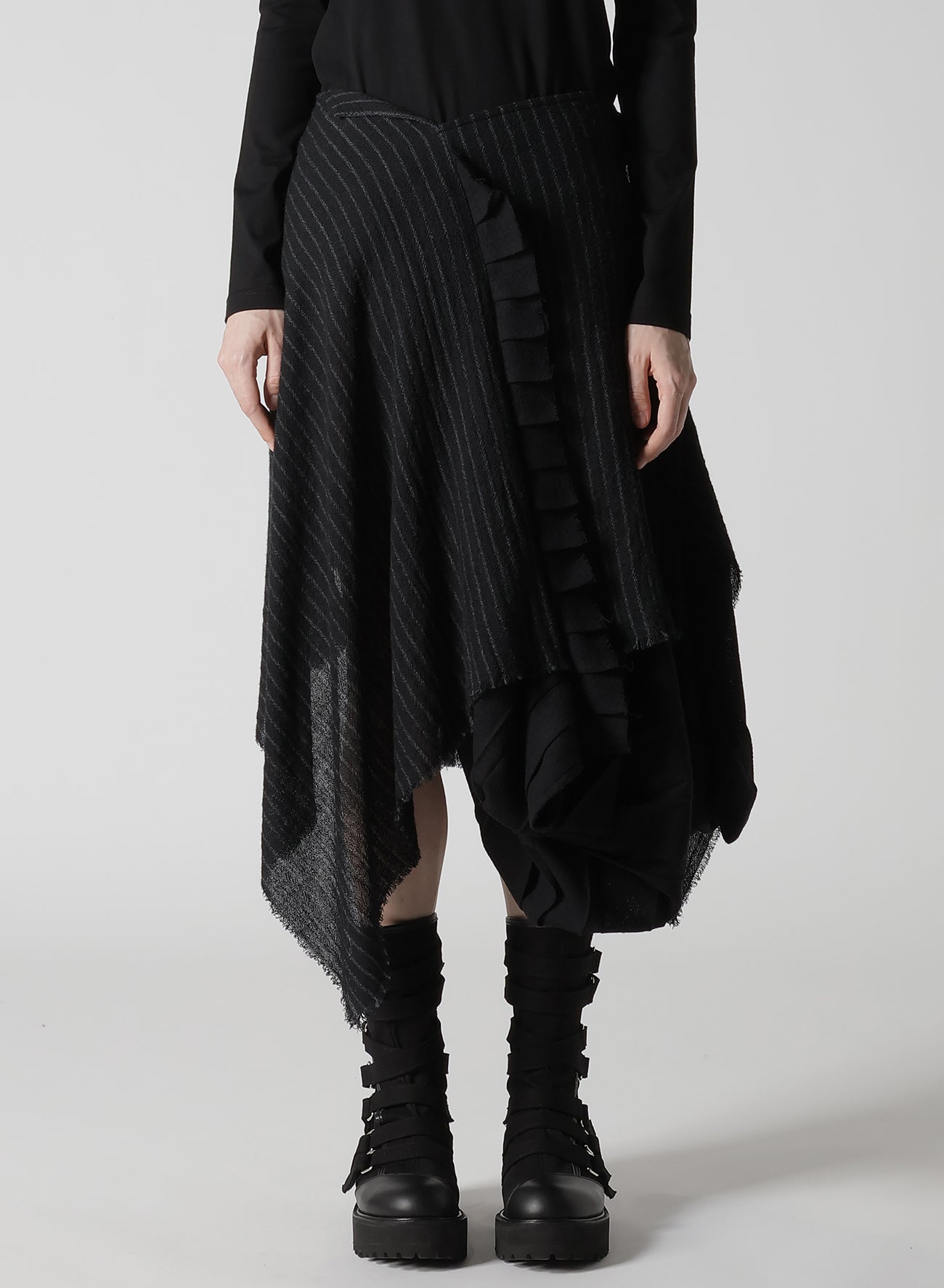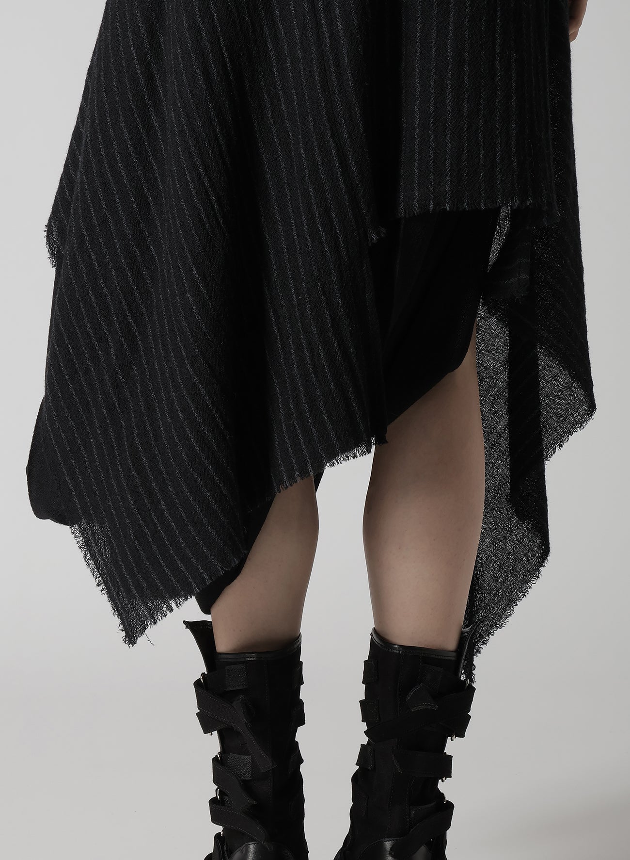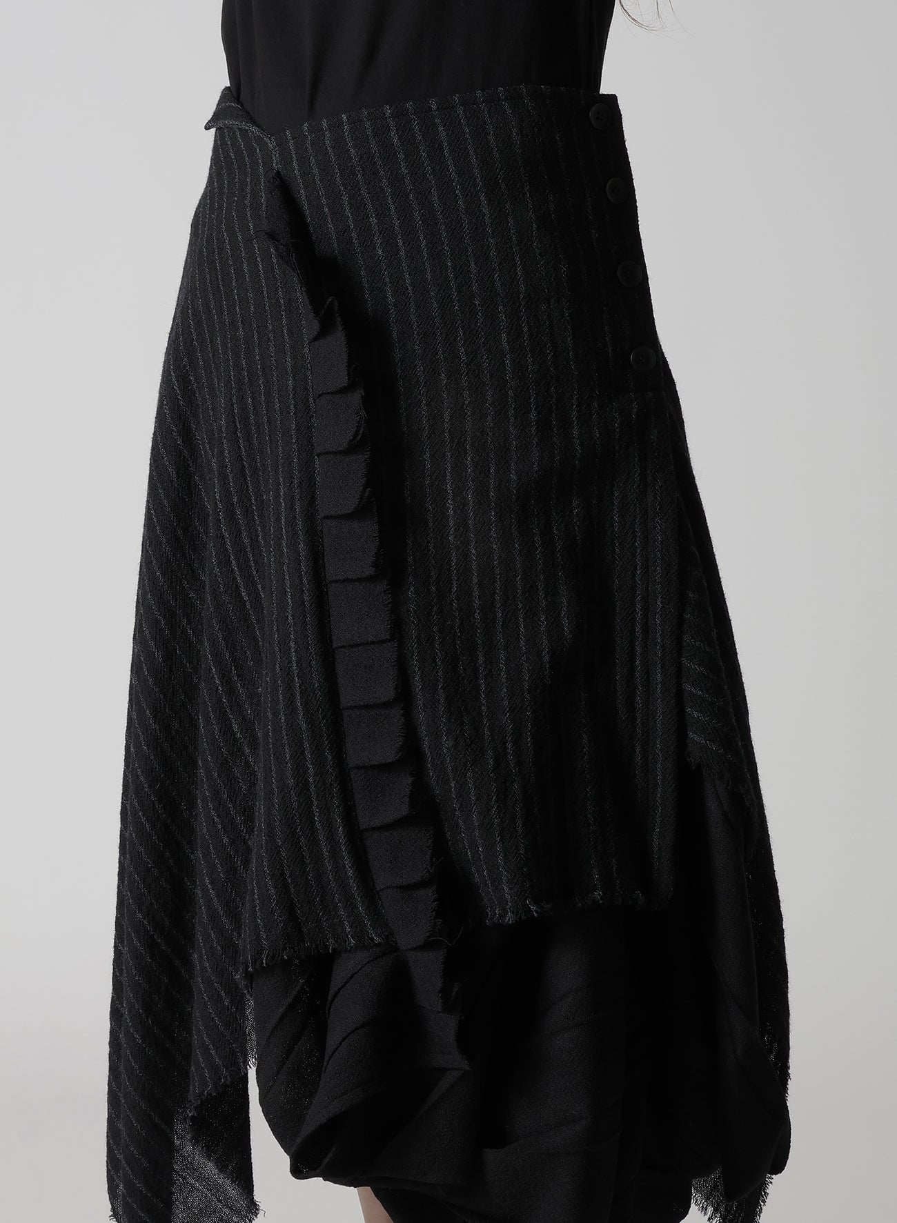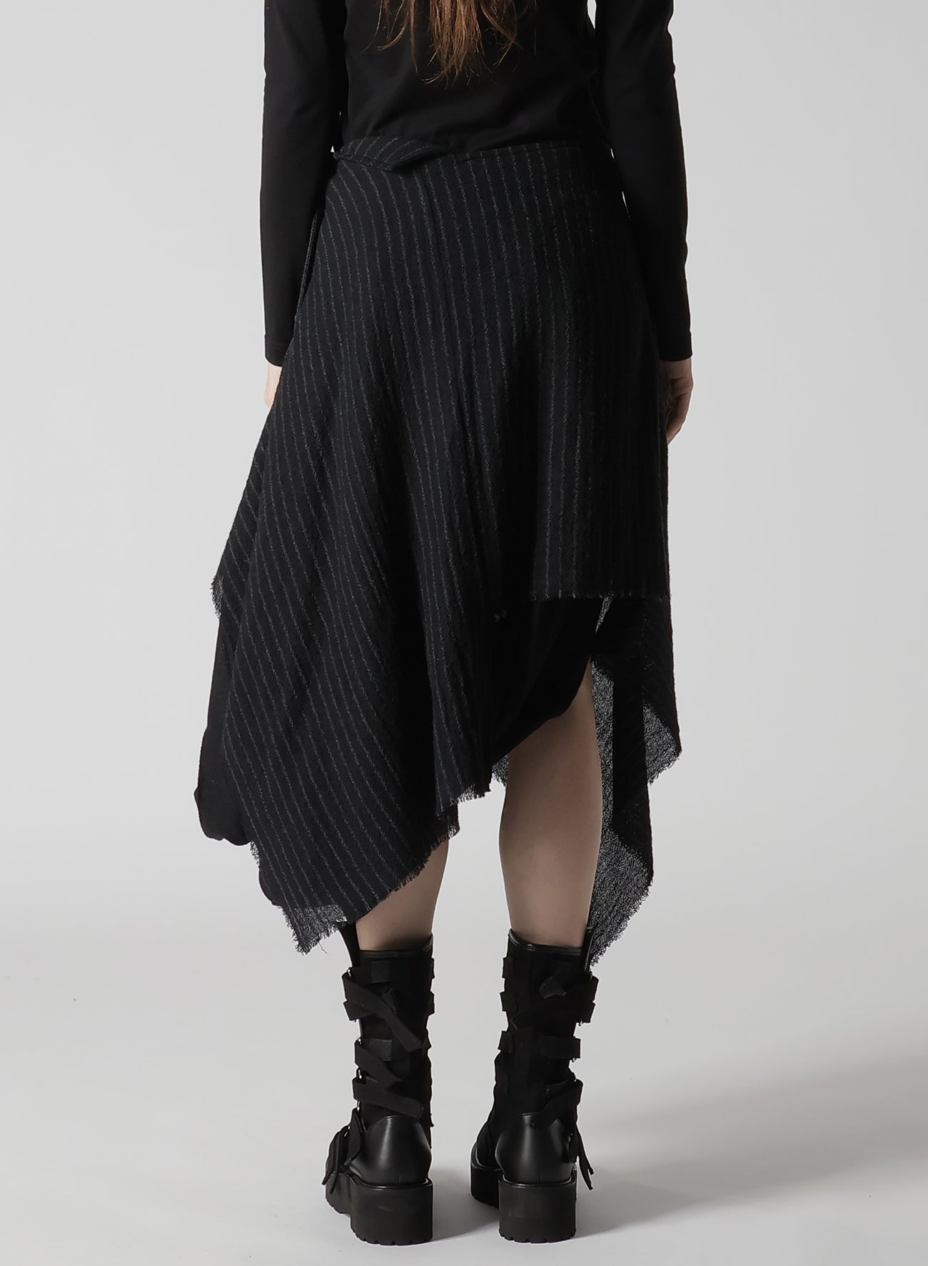 The fabric described is a loosely woven, fulled stripe gauze that offers a soft, light texture. Skirts crafted from this material feature pleats and a 3D pattern, which create a dynamic appearance. Each piece is uniquely cut and frayed, adding a rag-like look that evolves over time.