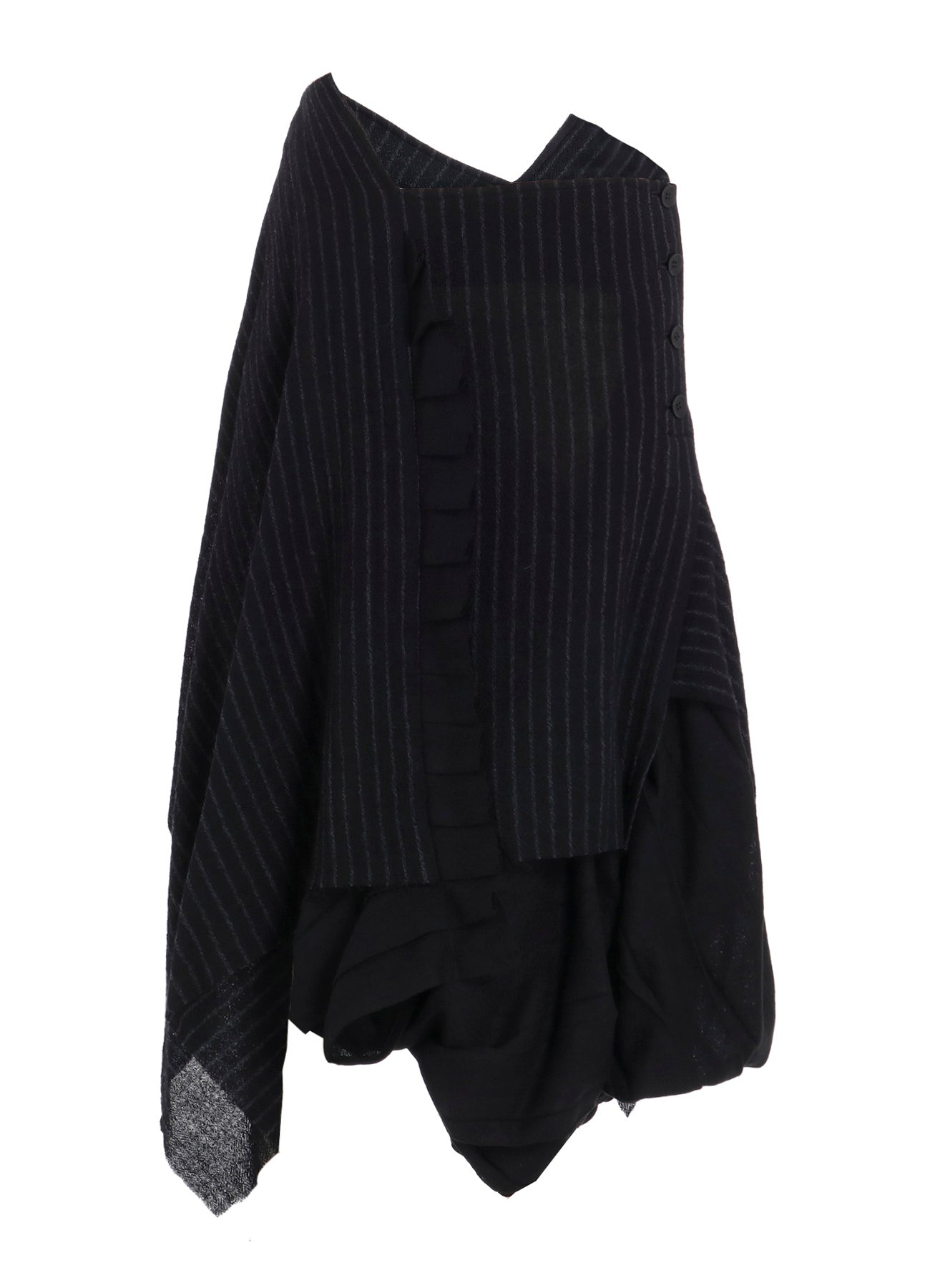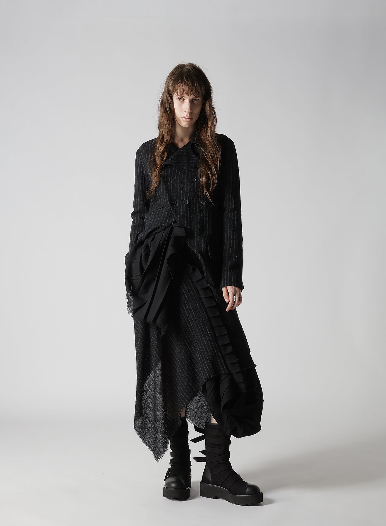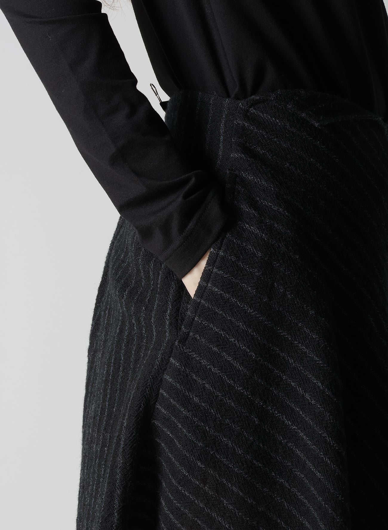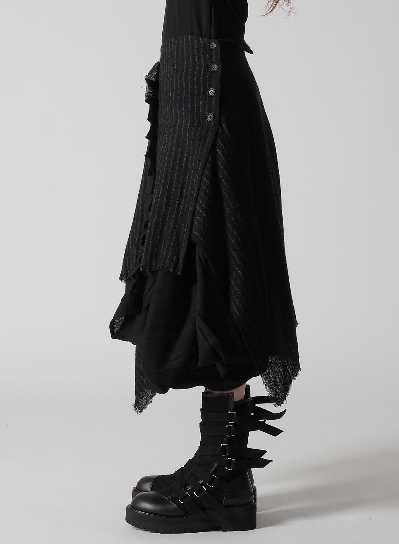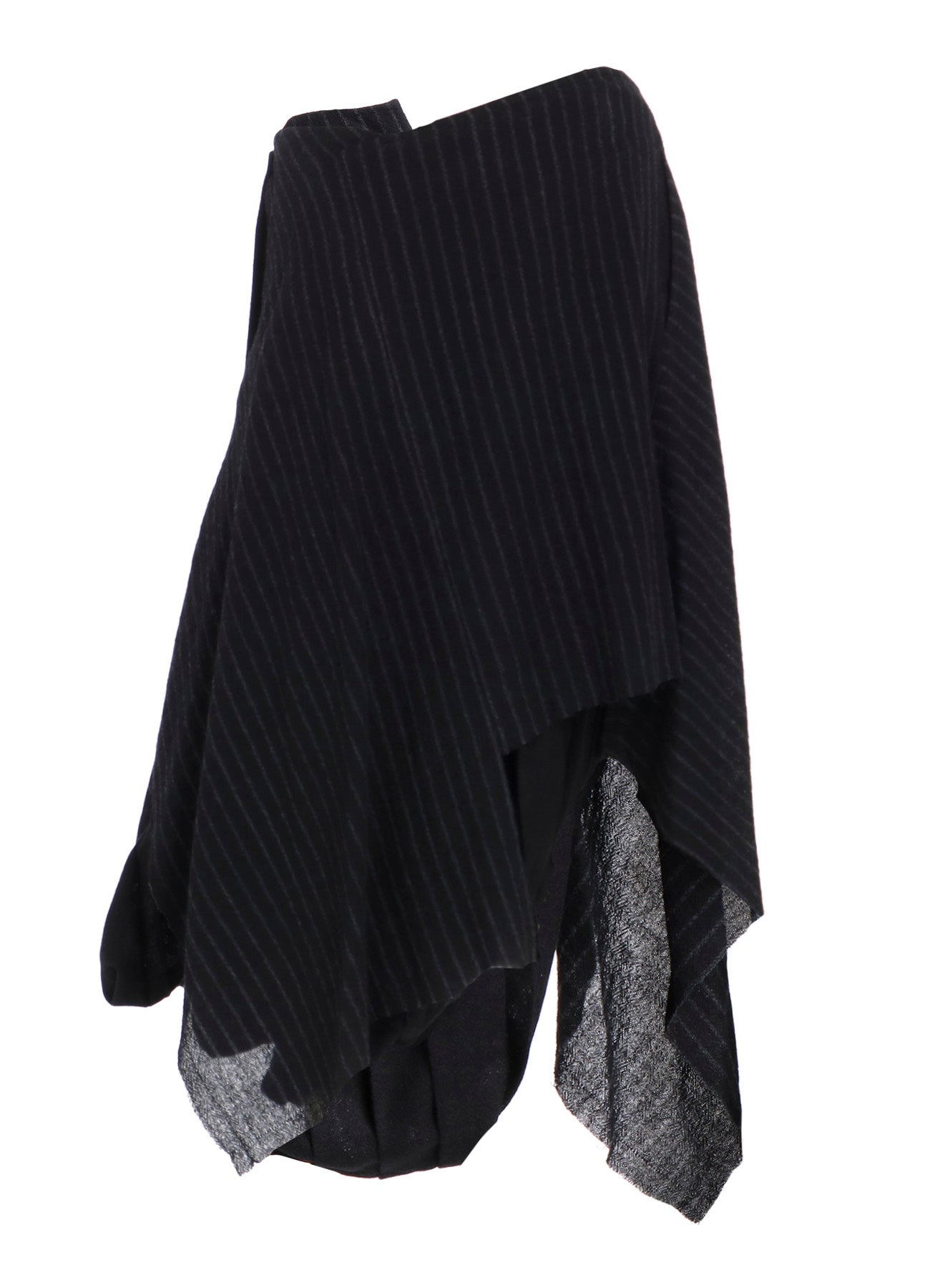 The fabric described is a loosely woven, fulled stripe gauze that offers a soft, light texture. Skirts crafted from this material feature pleats and a 3D pattern, which create a dynamic appearance. Each piece is uniquely cut and frayed, adding a rag-like look that evolves over time.