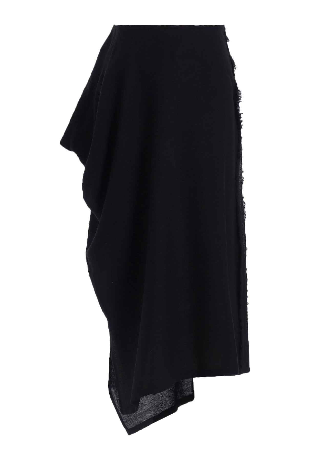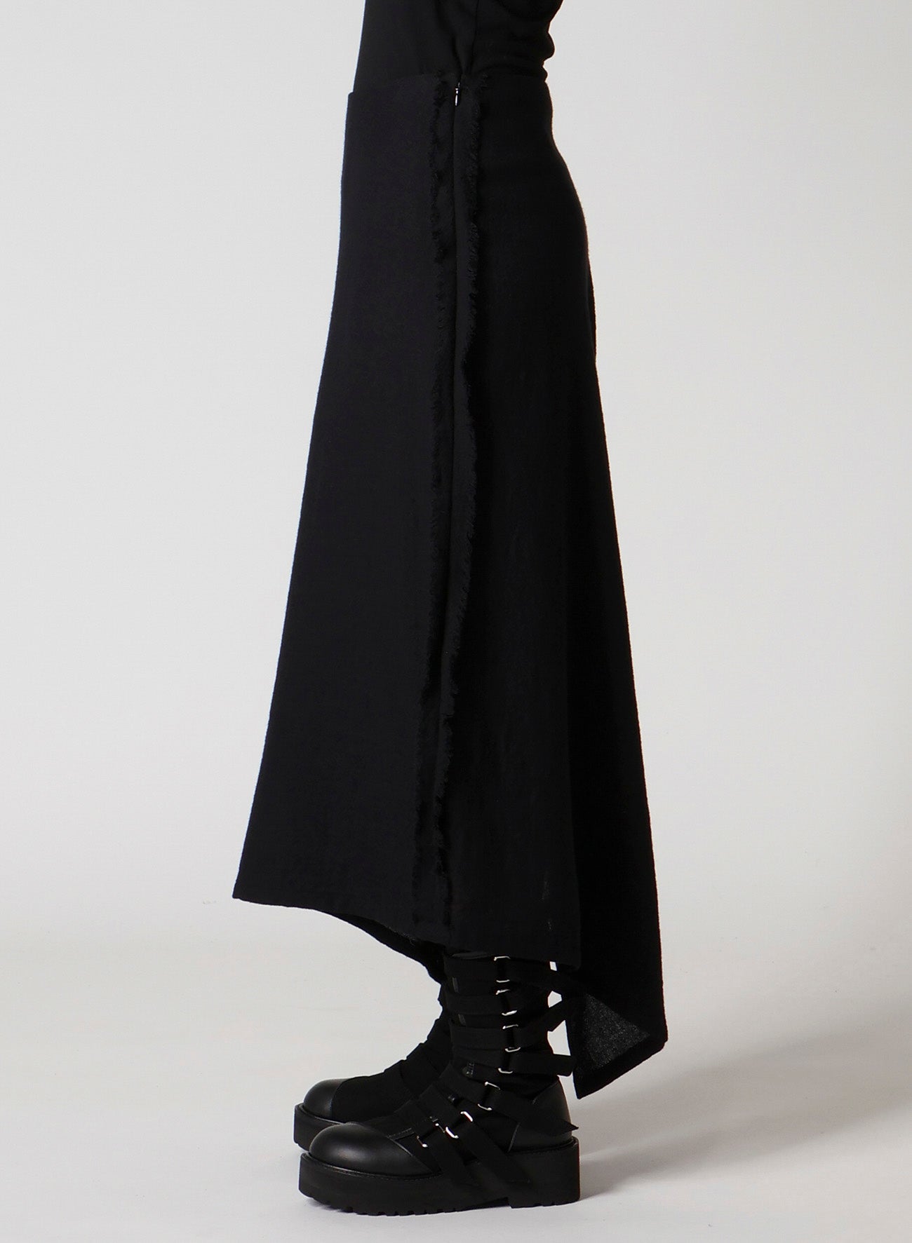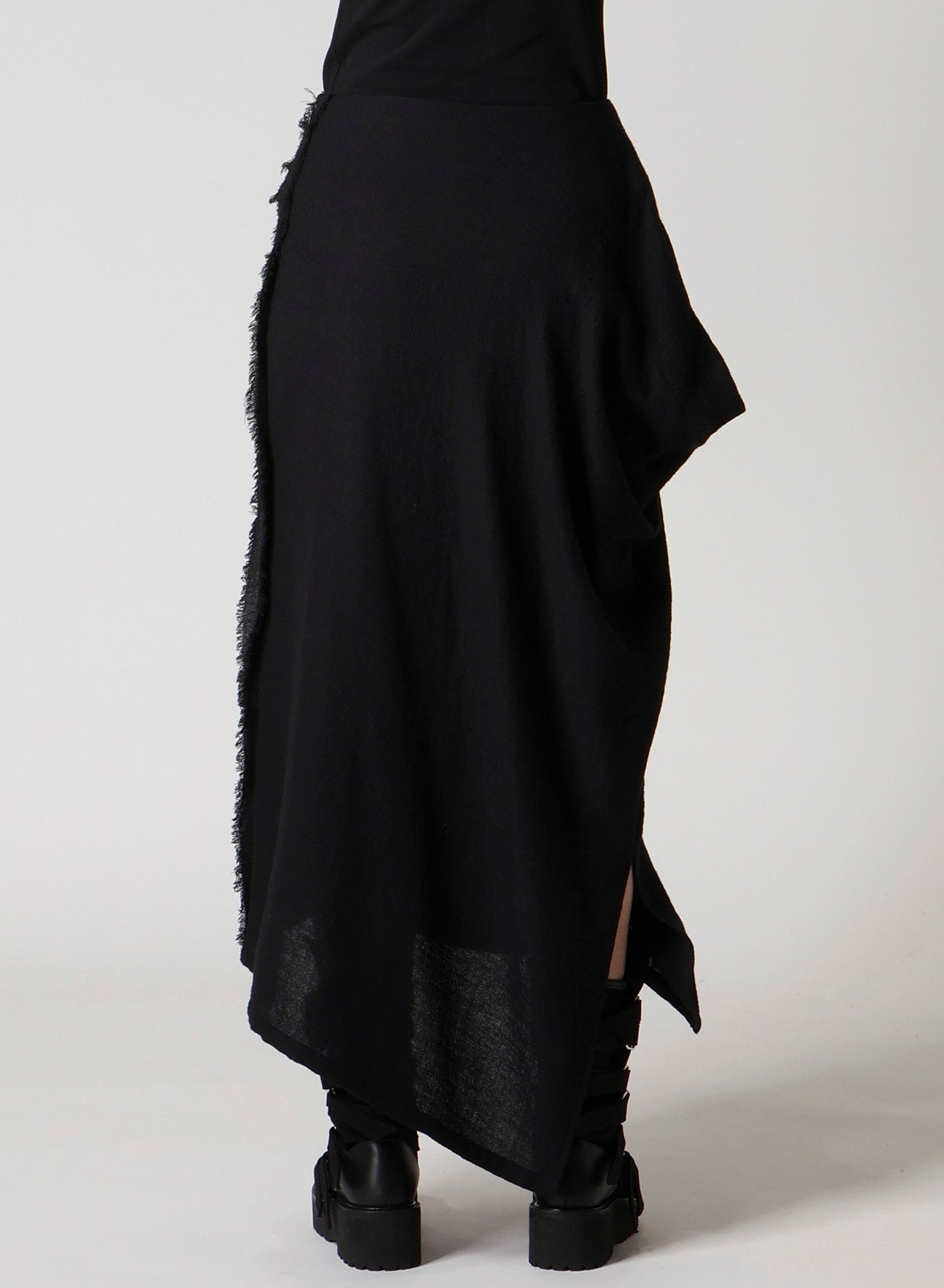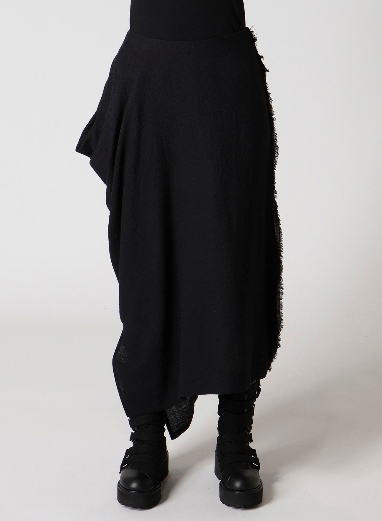 This skirt uses high-quality yarn woven into a gauze-like serge and fulled for a light, soft texture. Each piece is unique, with raw edges that may fray over time. The skirt features right-side drapery in an I-line silhouette, enhancing elegance, with a slit for easy movement.