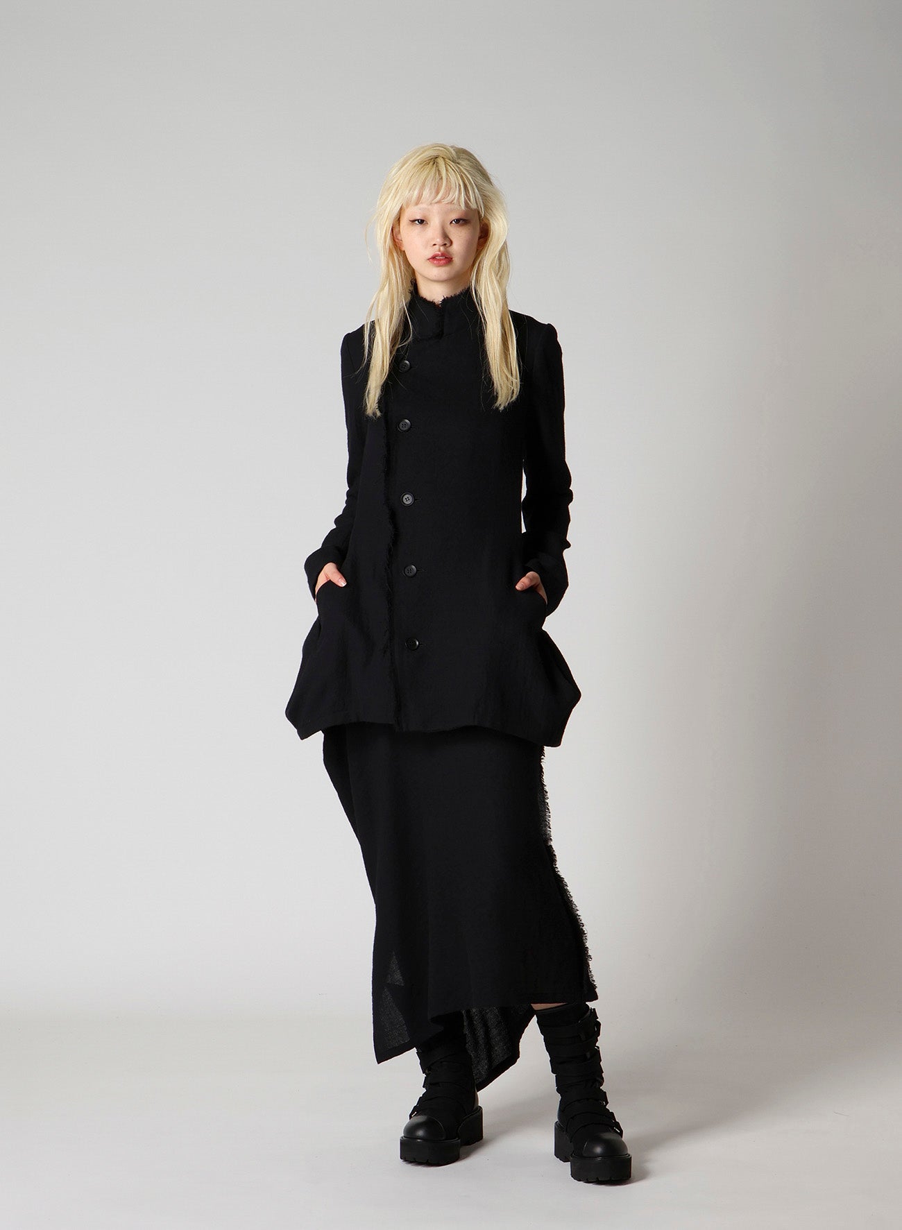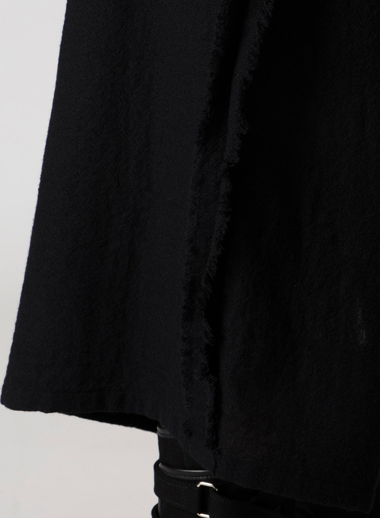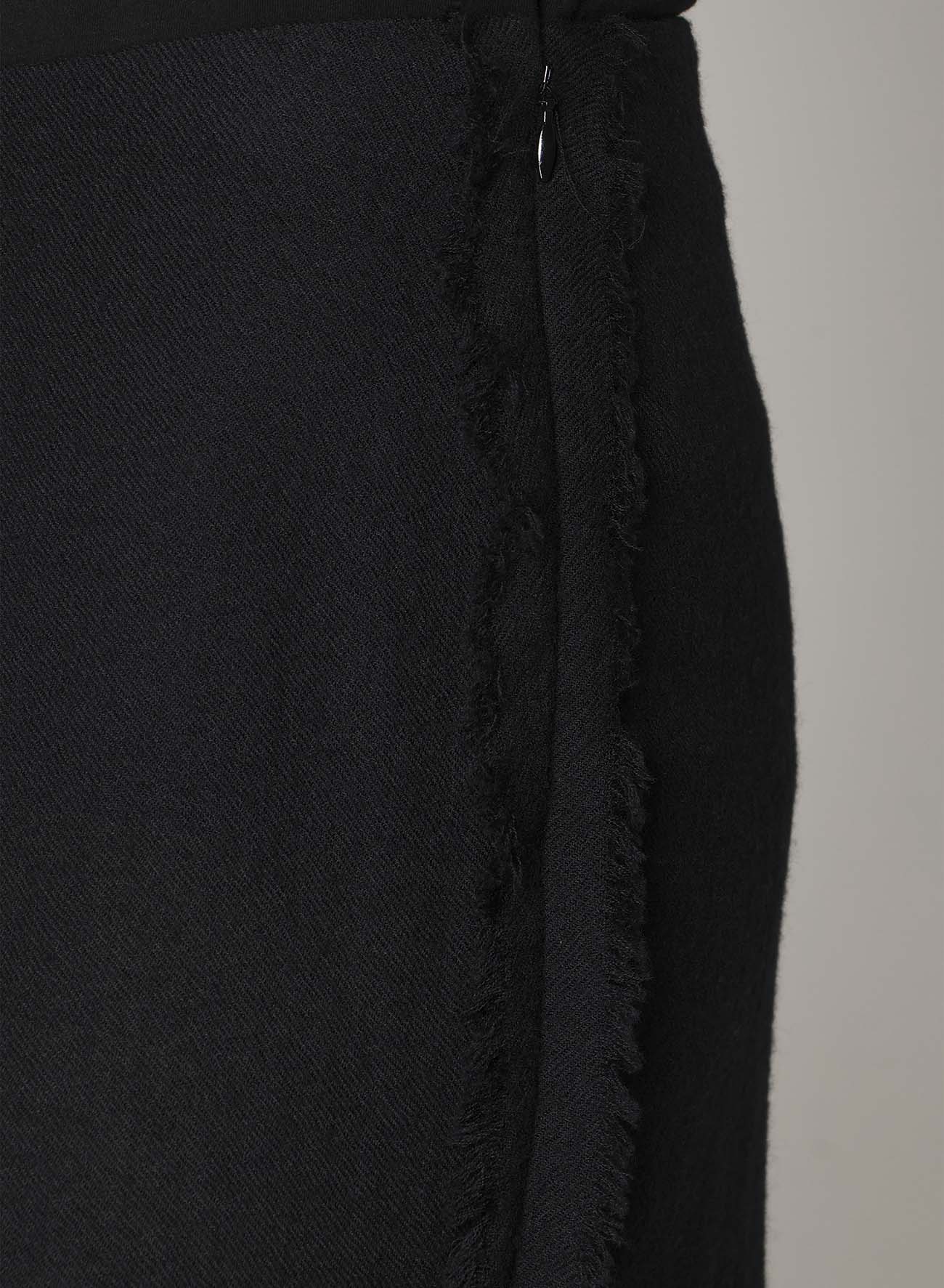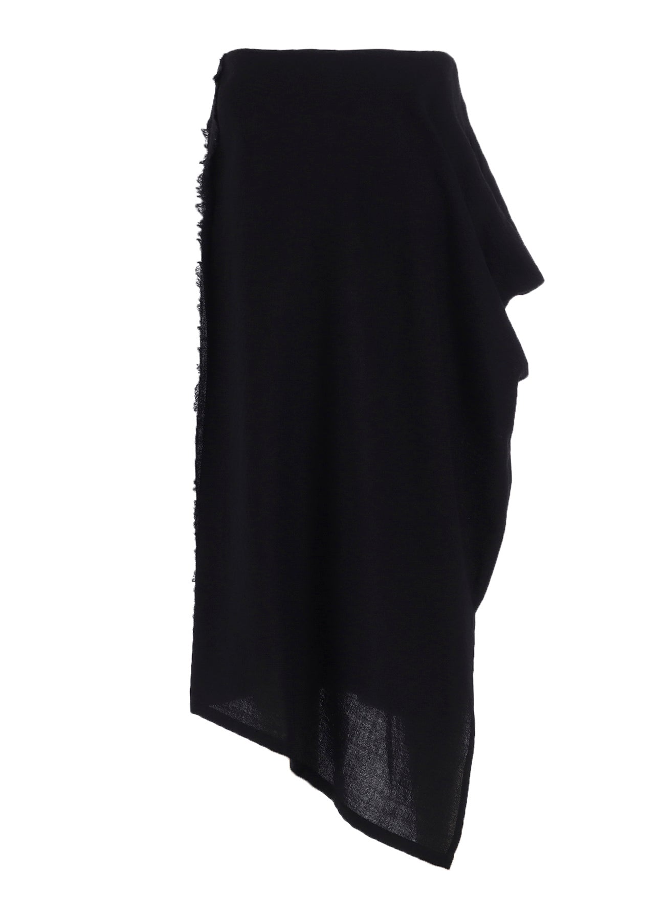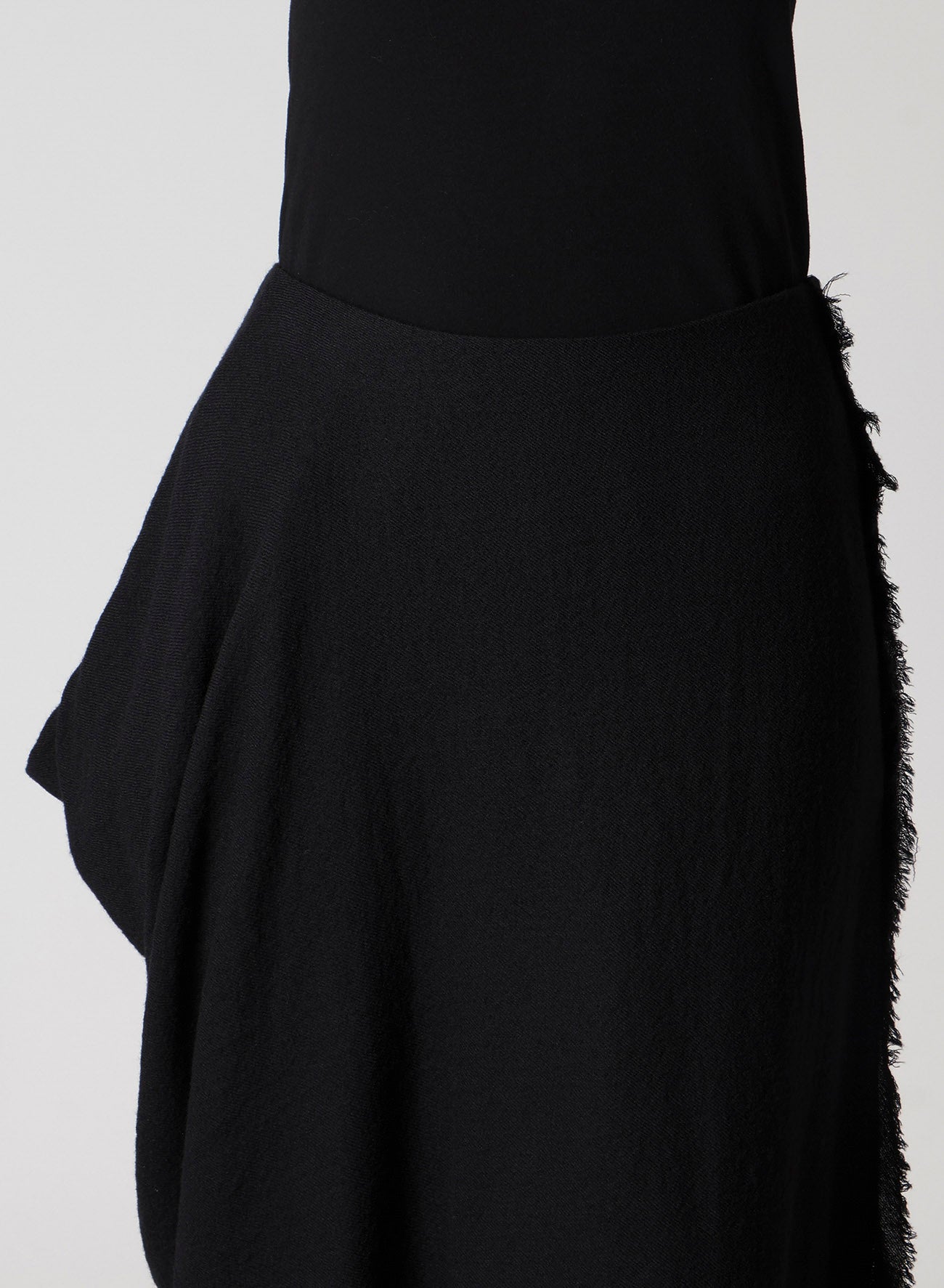 This skirt uses high-quality yarn woven into a gauze-like serge and fulled for a light, soft texture. Each piece is unique, with raw edges that may fray over time. The skirt features right-side drapery in an I-line silhouette, enhancing elegance, with a slit for easy movement.