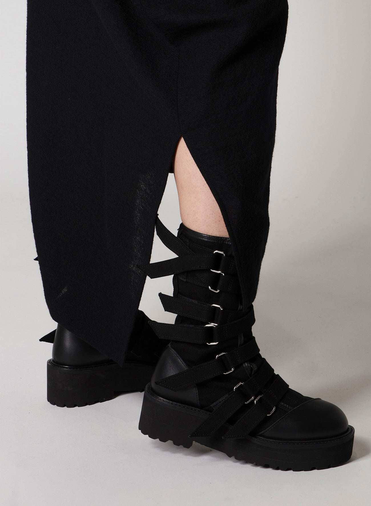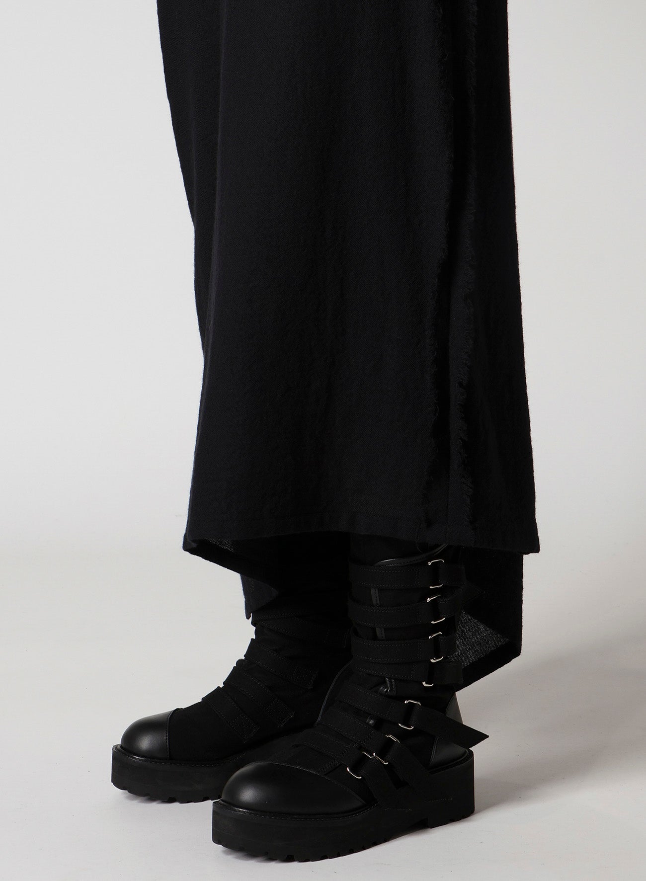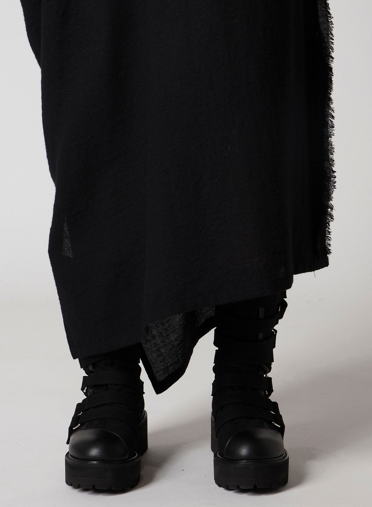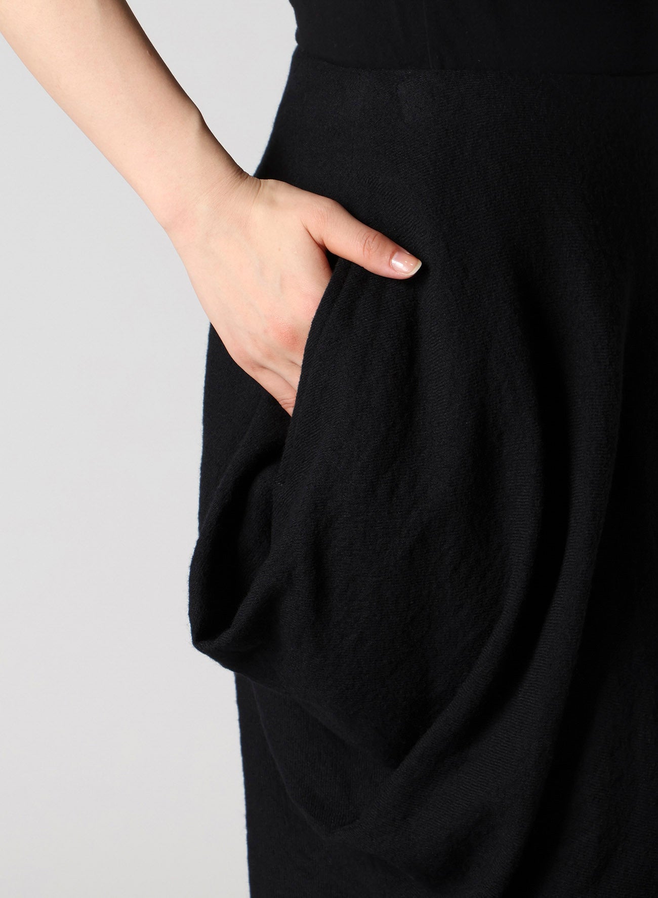 This skirt uses high-quality yarn woven into a gauze-like serge and fulled for a light, soft texture. Each piece is unique, with raw edges that may fray over time. The skirt features right-side drapery in an I-line silhouette, enhancing elegance, with a slit for easy movement.