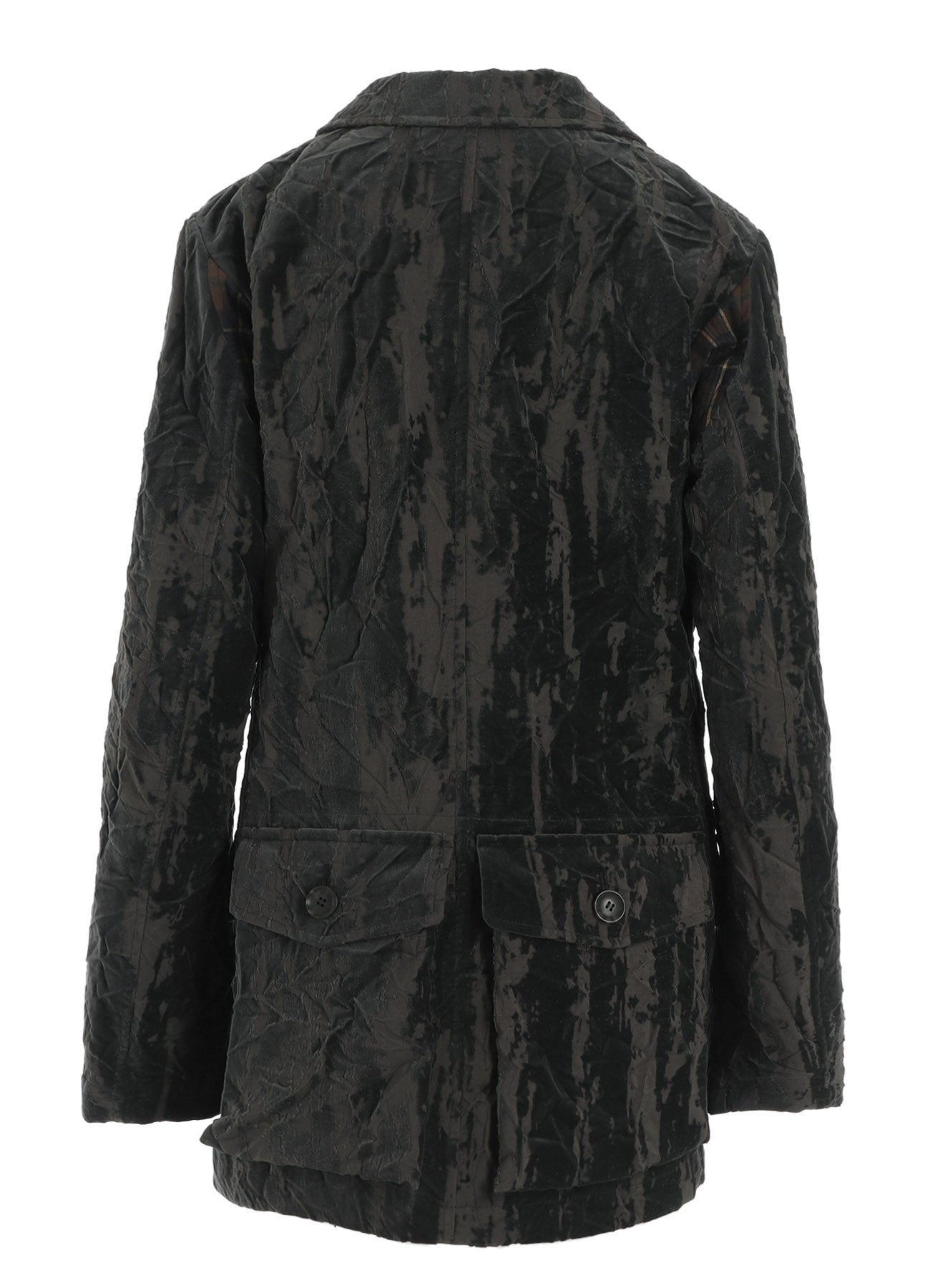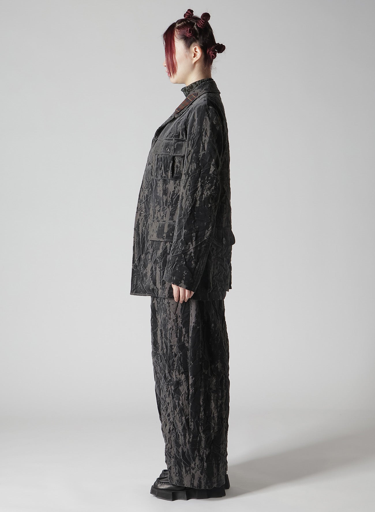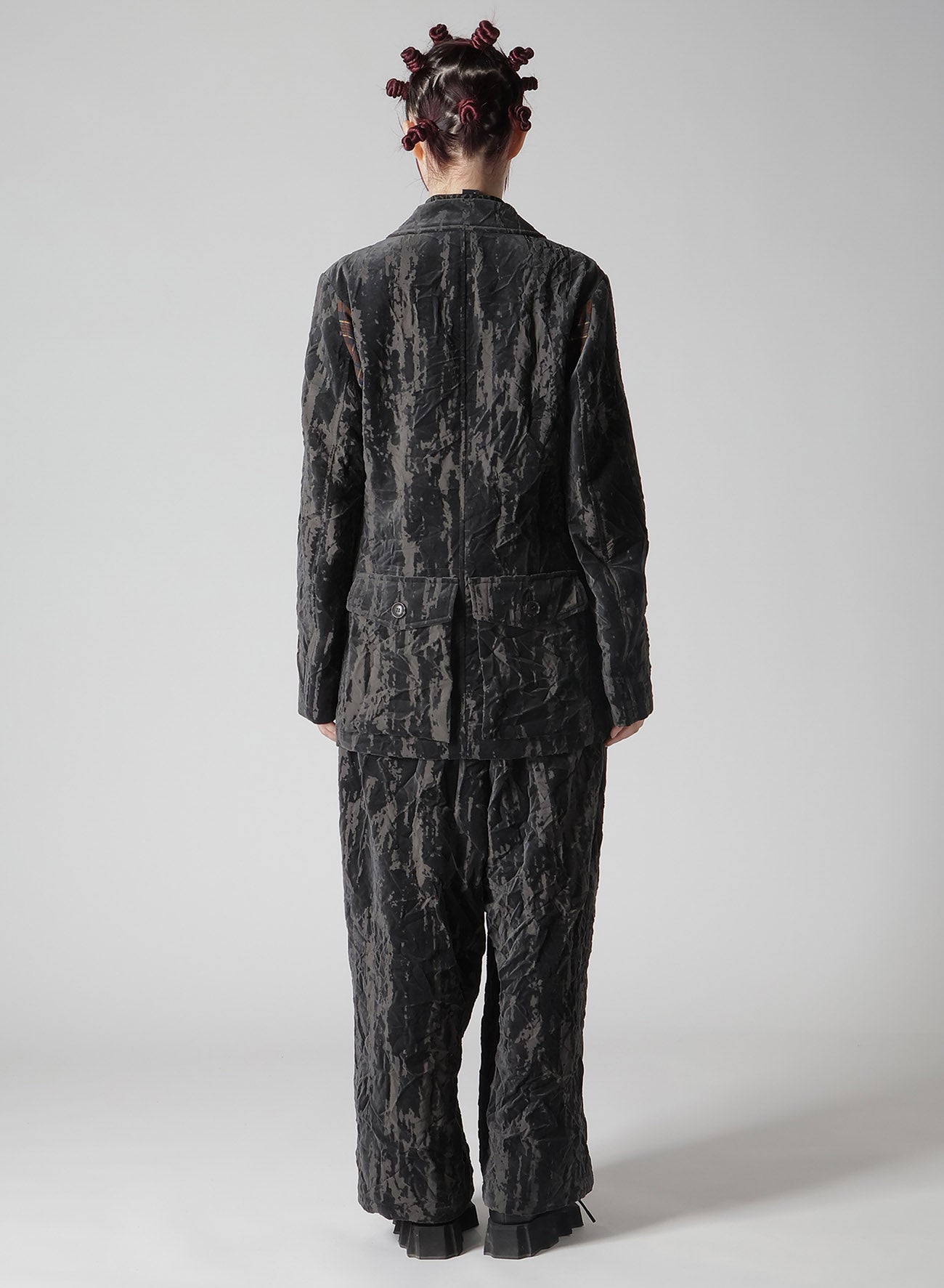 The jacket features high-quality cotton velvet with a unique Opal Processing, giving it a bold, worn-in Grunge Texture. Each piece has a distinct wrinkle processing for a personal touch. Its relaxed yet clean silhouette, complemented by a longer length, pairs beautifully with wide pants for a menswear-inspired outfit.