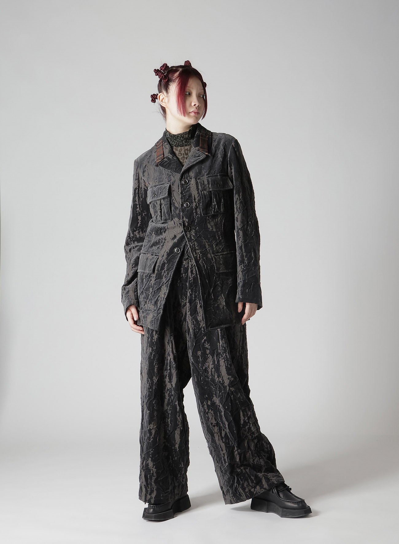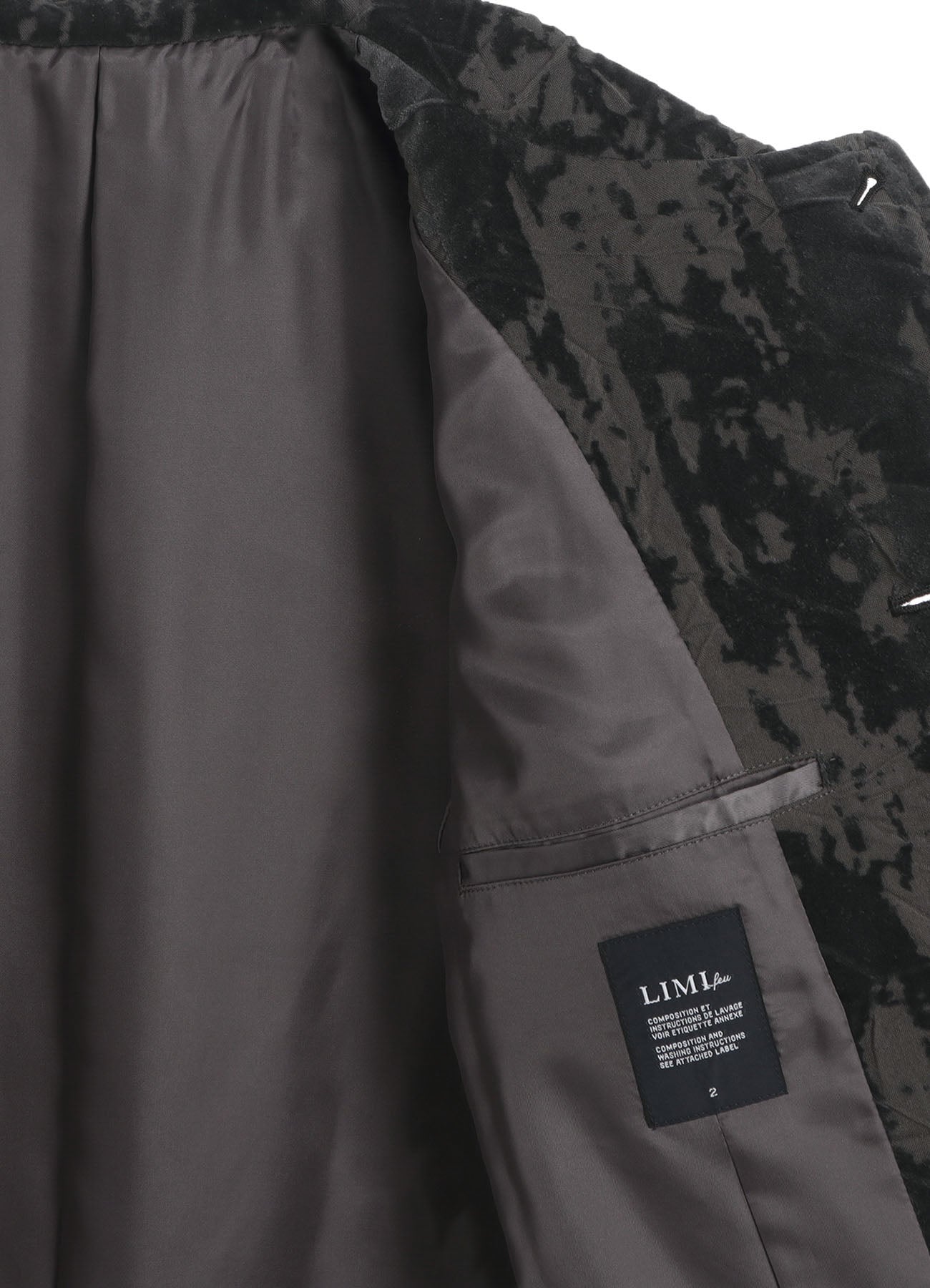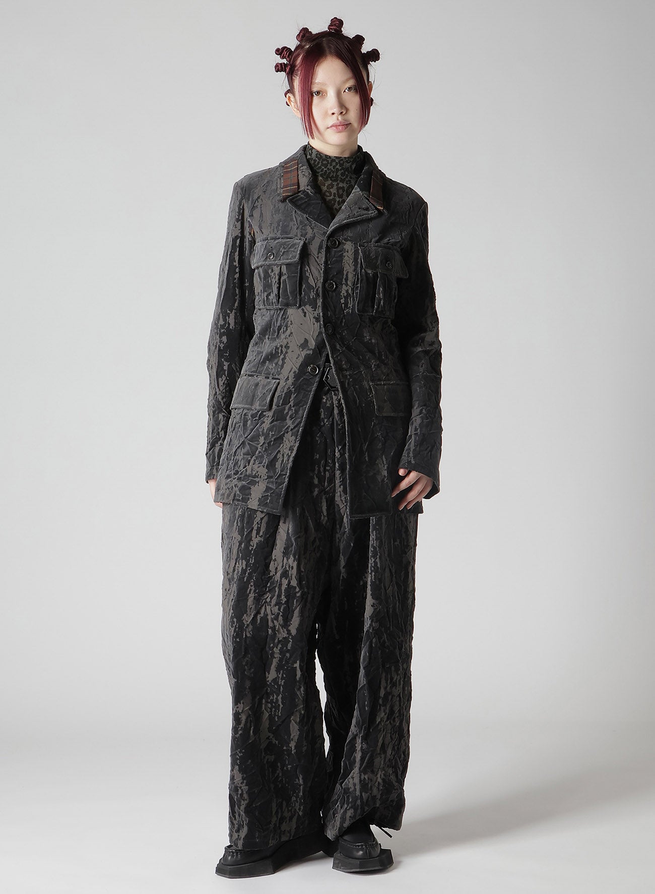 The jacket features high-quality cotton velvet with a unique Opal Processing, giving it a bold, worn-in Grunge Texture. Each piece has a distinct wrinkle processing for a personal touch. Its relaxed yet clean silhouette, complemented by a longer length, pairs beautifully with wide pants for a menswear-inspired outfit.