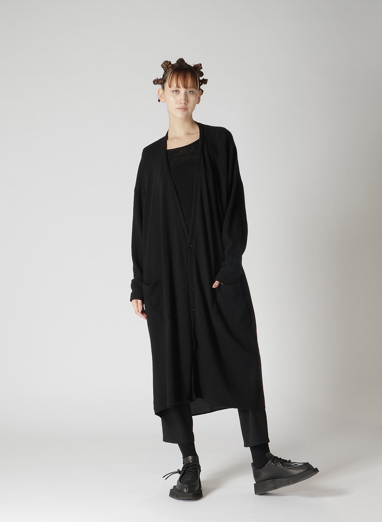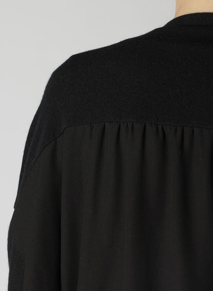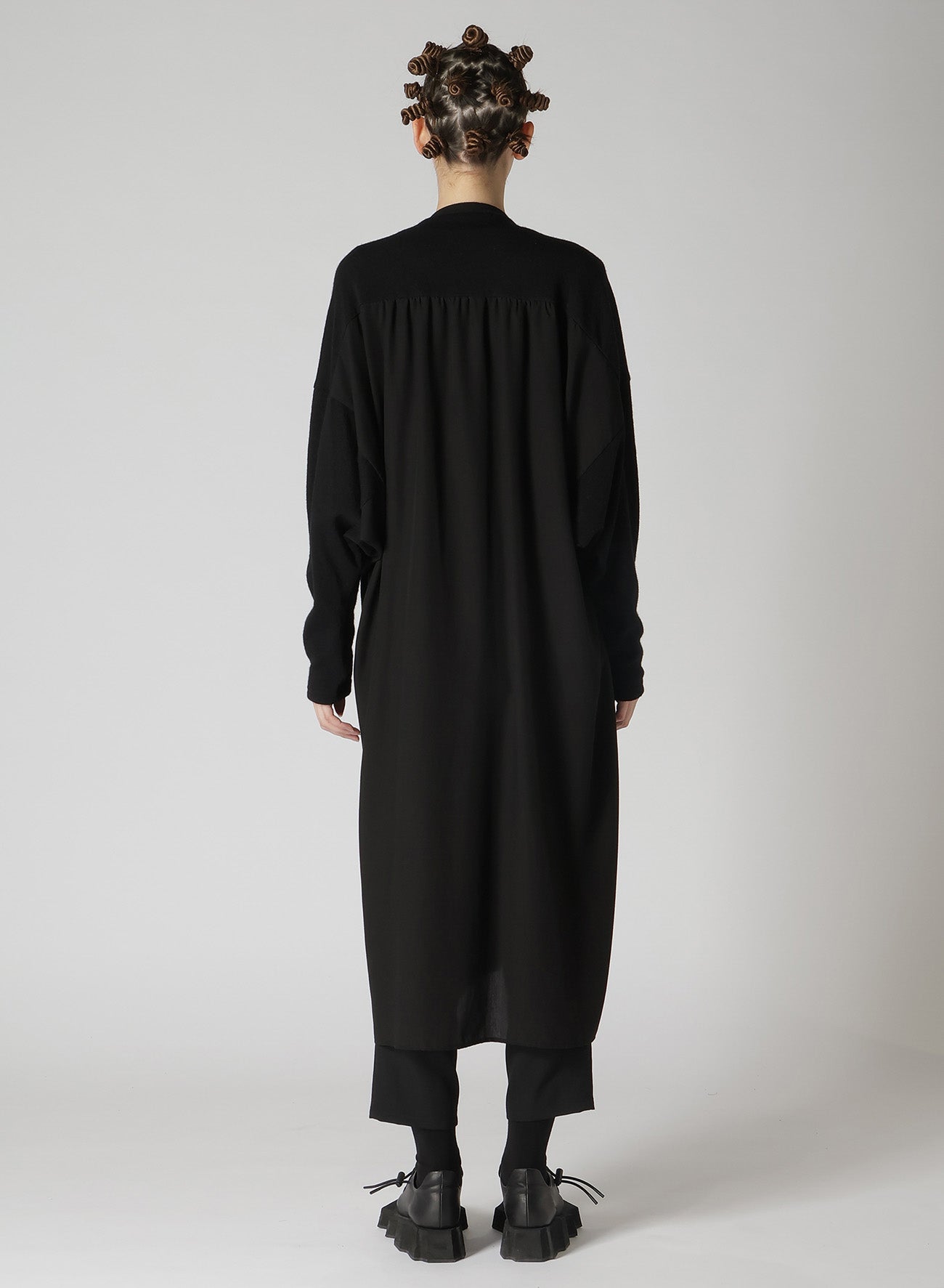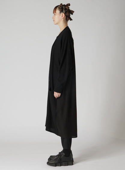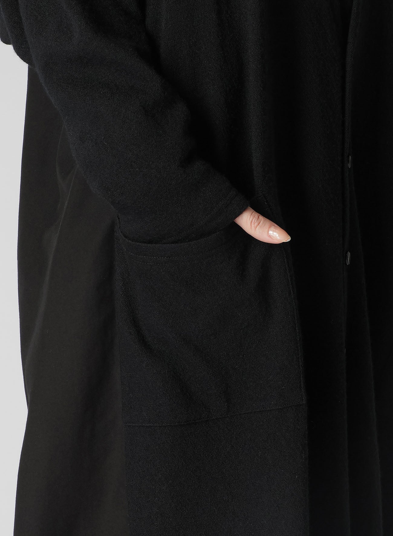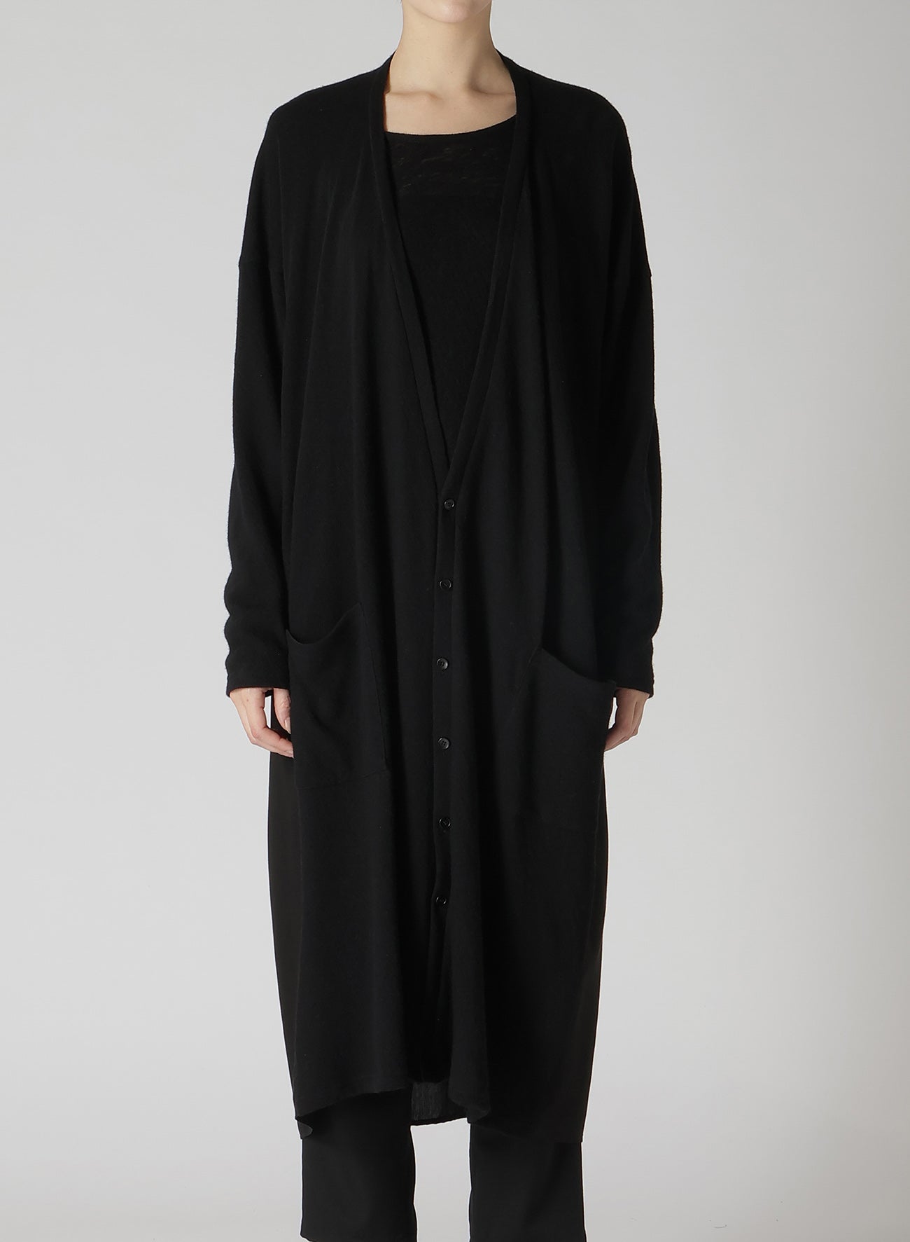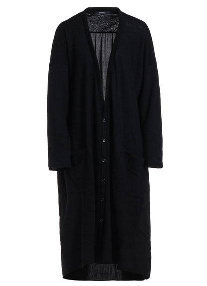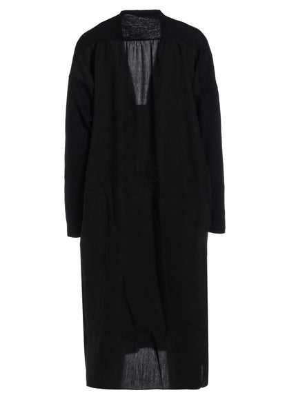 A unique, soft wool plain stitch fabric, loosened for knitting and then fulled for a special texture. This long cardigan has a refined drape and glow, combining another fabric for a sophisticated back. It offers a loose fit and skin-friendly comfort. Perfect for layering and stylish wear.