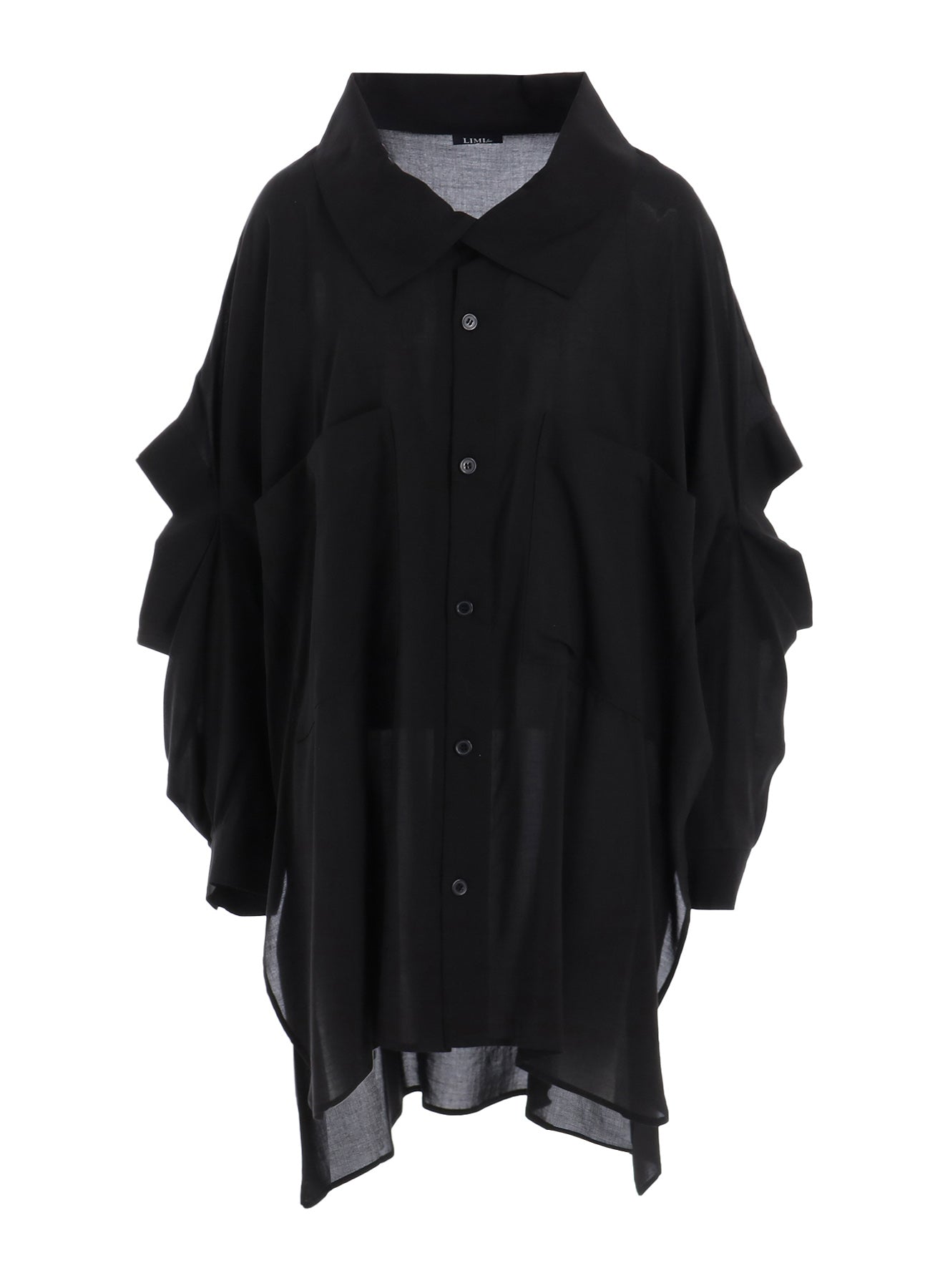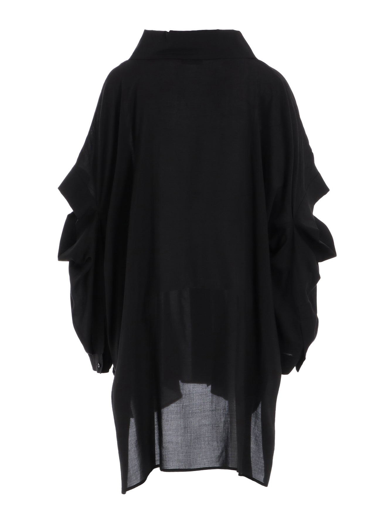 This fabric offers a soft touch with a subtle sheen and excellent drapery. The oversized collar resembles a standing collar, creating a striking presence. The sleeves feature a slit design, allowing them to transform into half sleeves by tucking the lower part into the body.