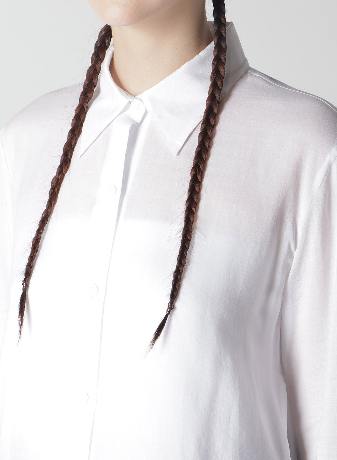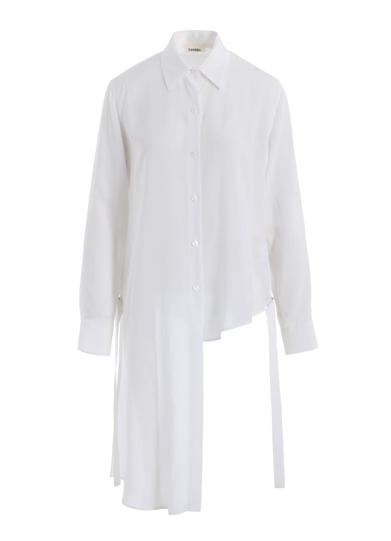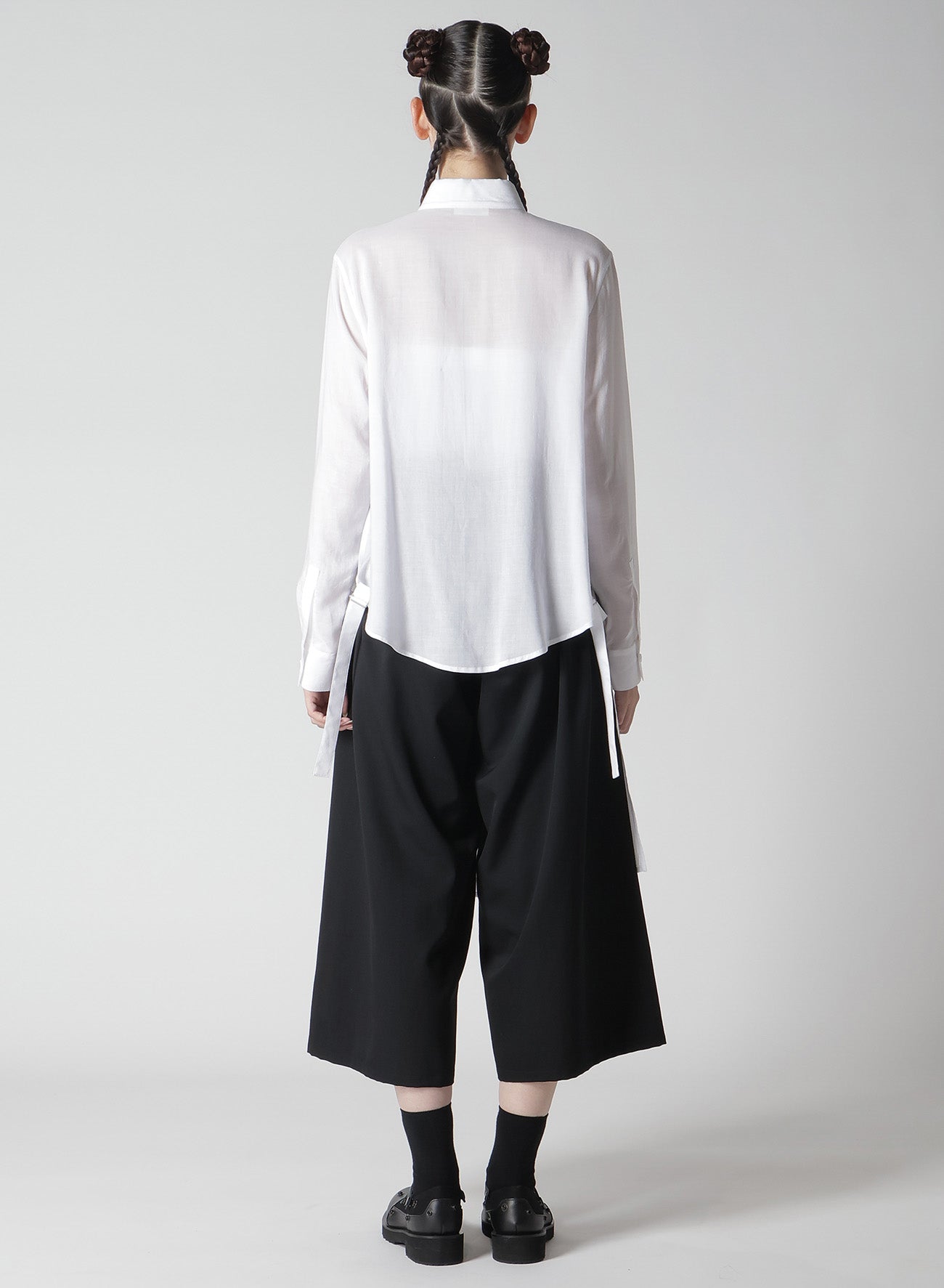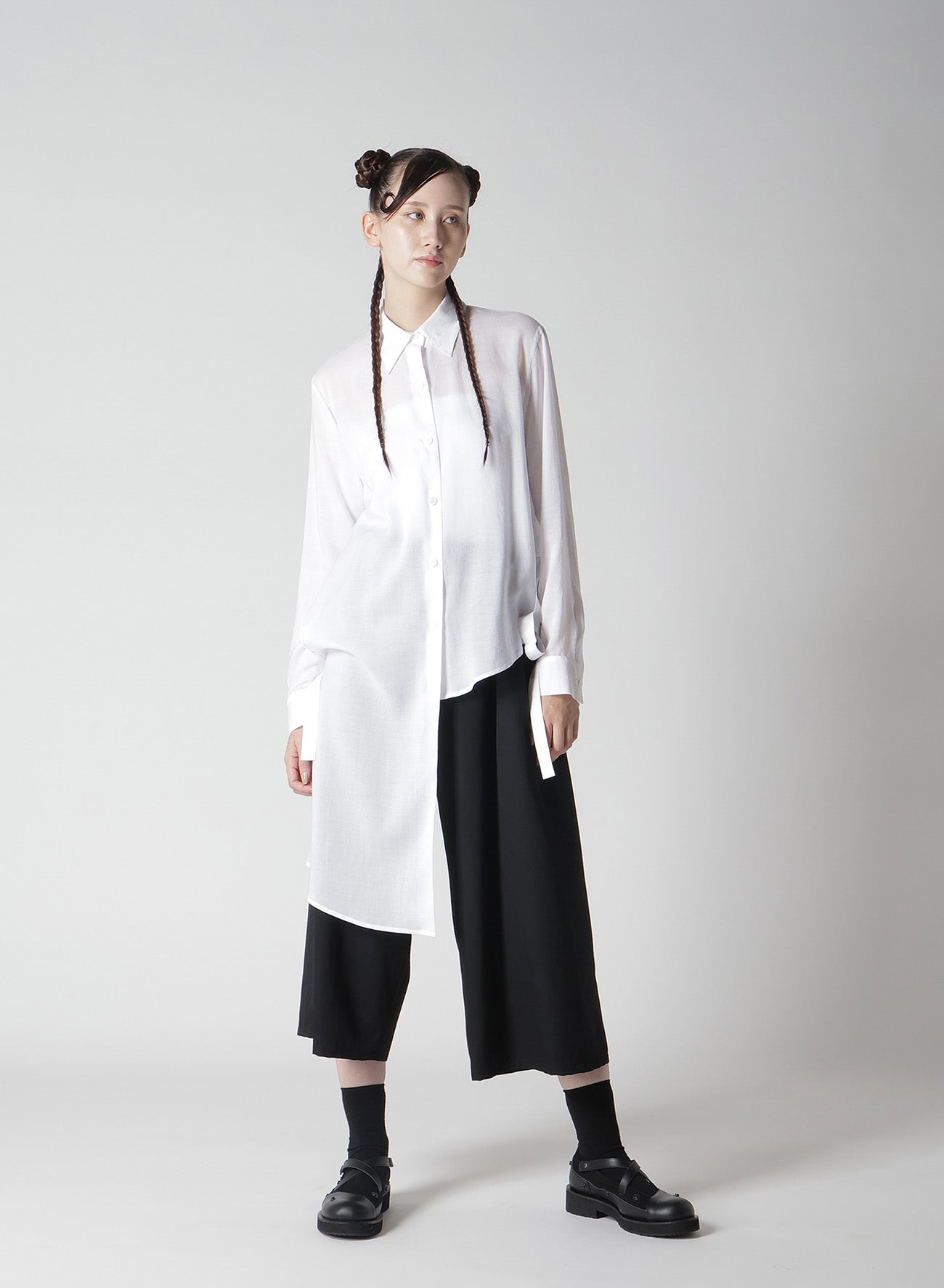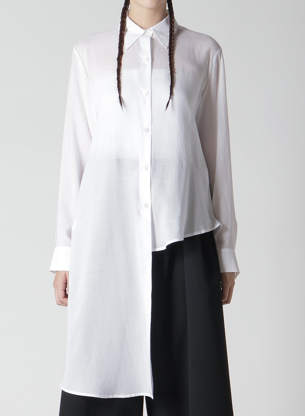This blouse is crafted from a soft, subtly lustrous fabric with lightweight drapery, offering a pleasant touch. It features a basic design, yet with an asymmetric right front longer than the left for a layered look. Side slits provide a breezy accent, making it a unique piece.