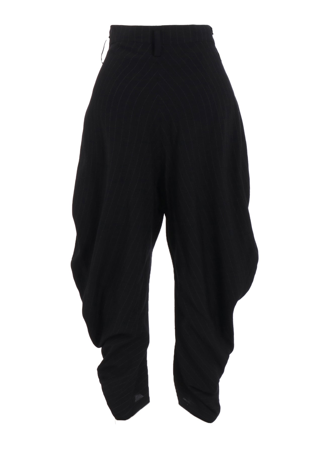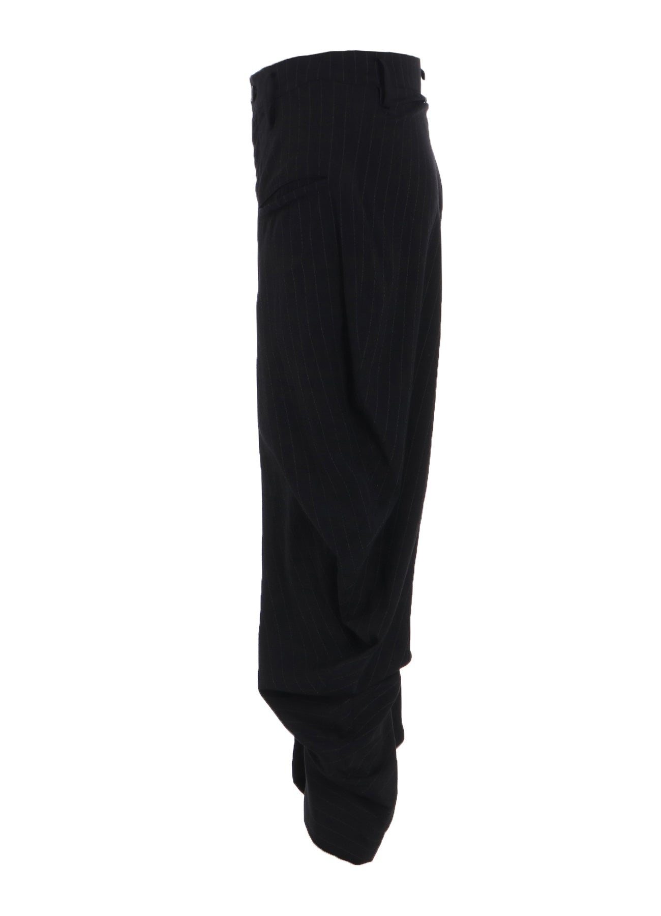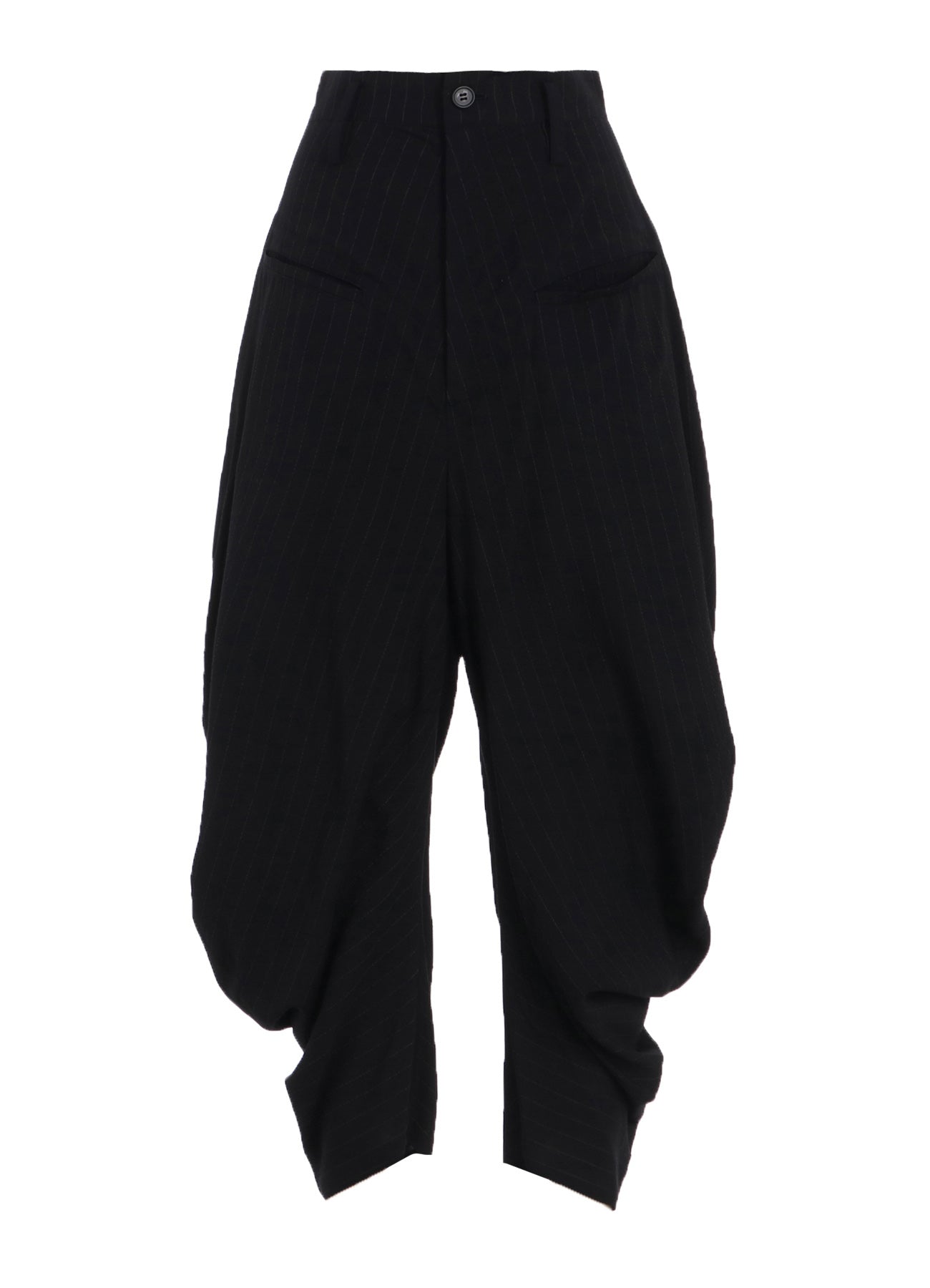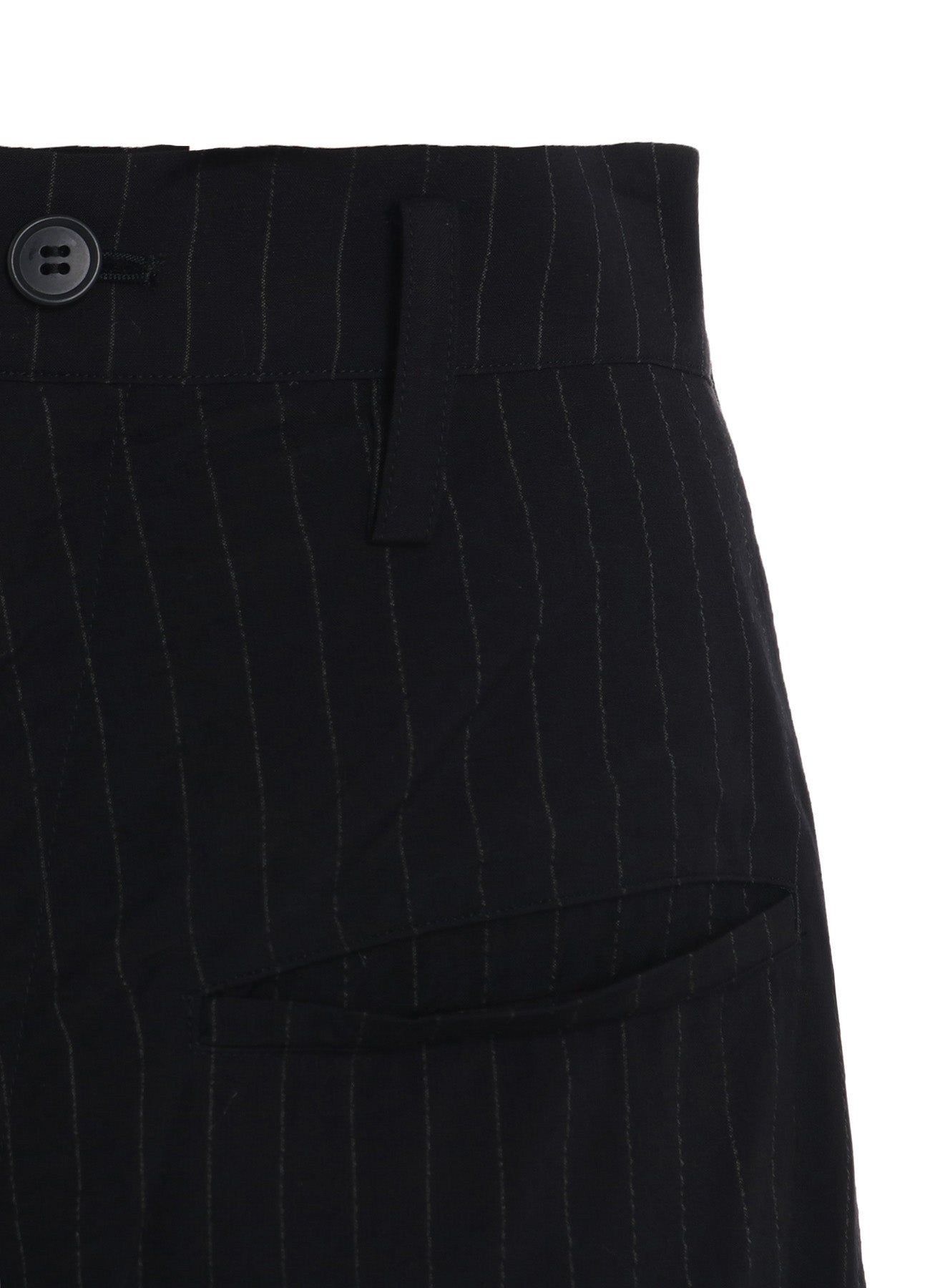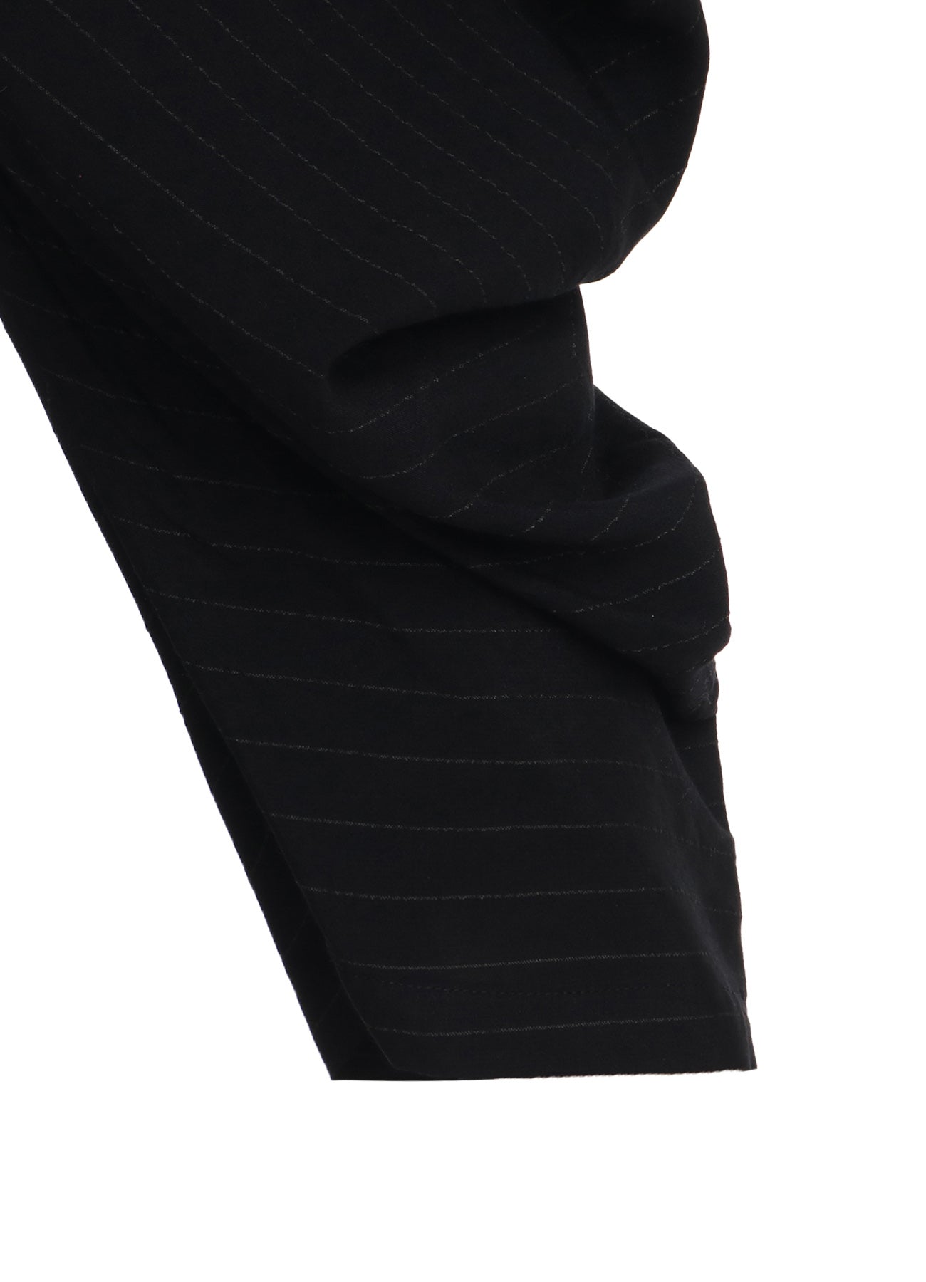 This men's striped fabric is characterized by moderate drapery and a soft touch. The polyester-striped sections are developed to create a textured effect through the difference in shrinkage between rayon and polyester. The pants feature a tapered silhouette with pockets, maintaining a clean drape and appearance.