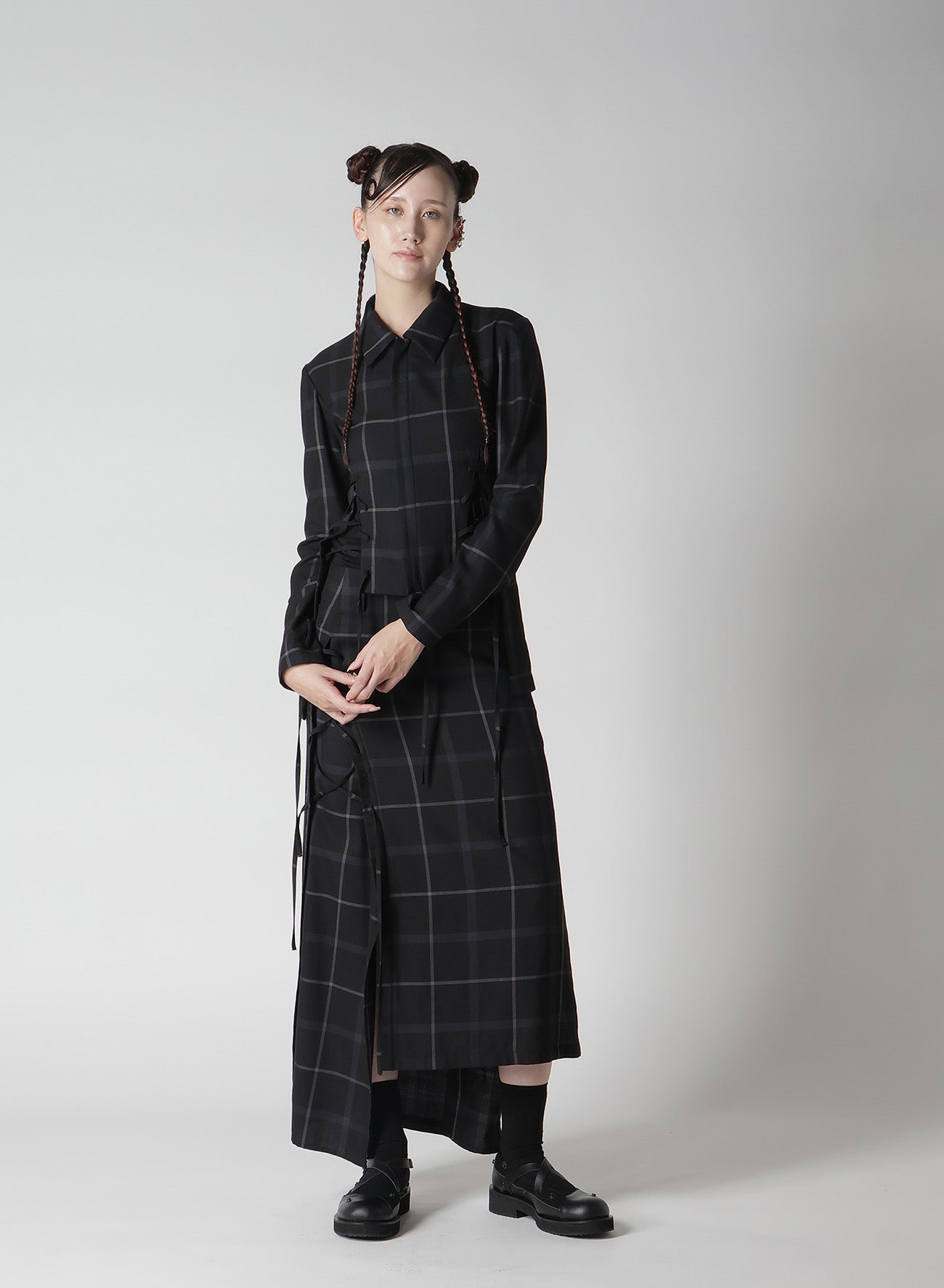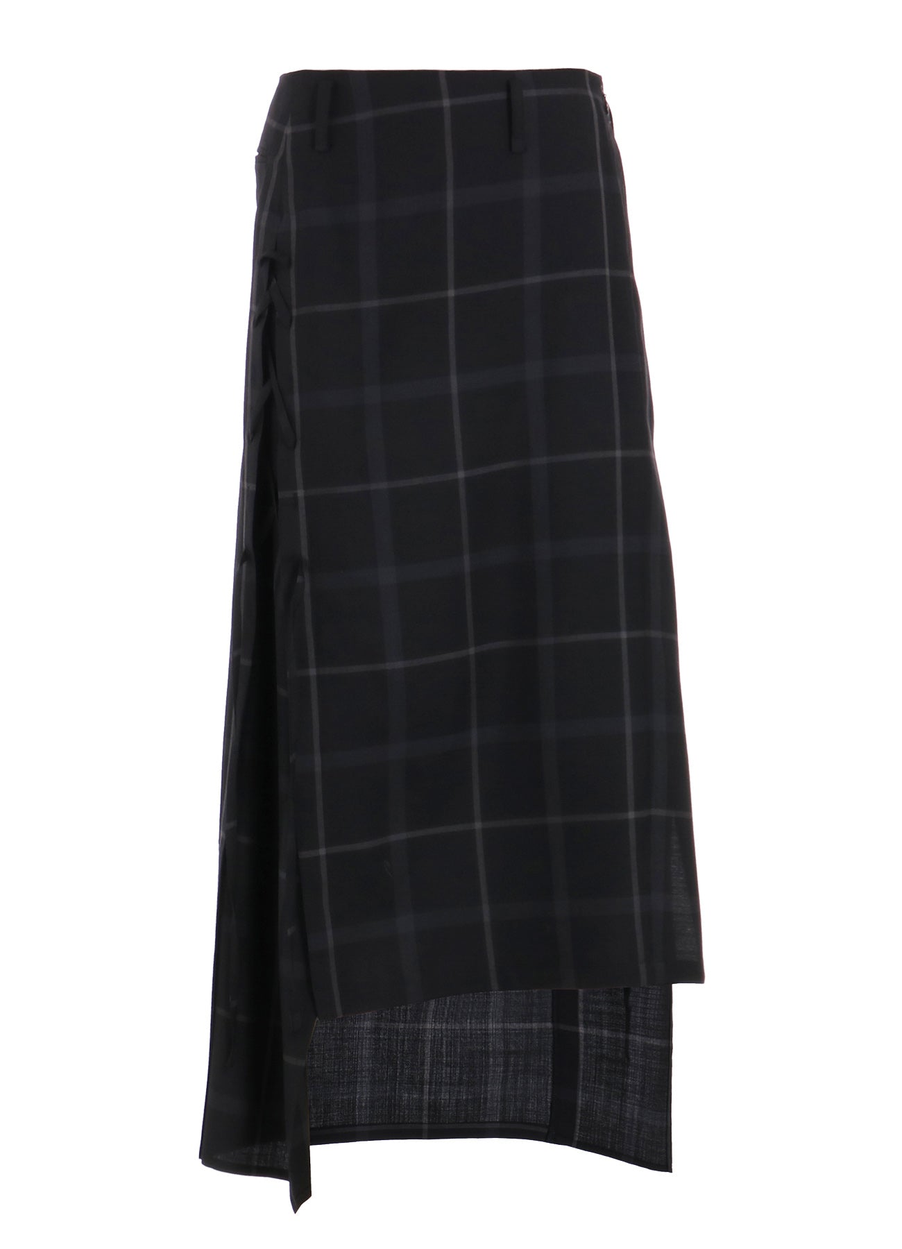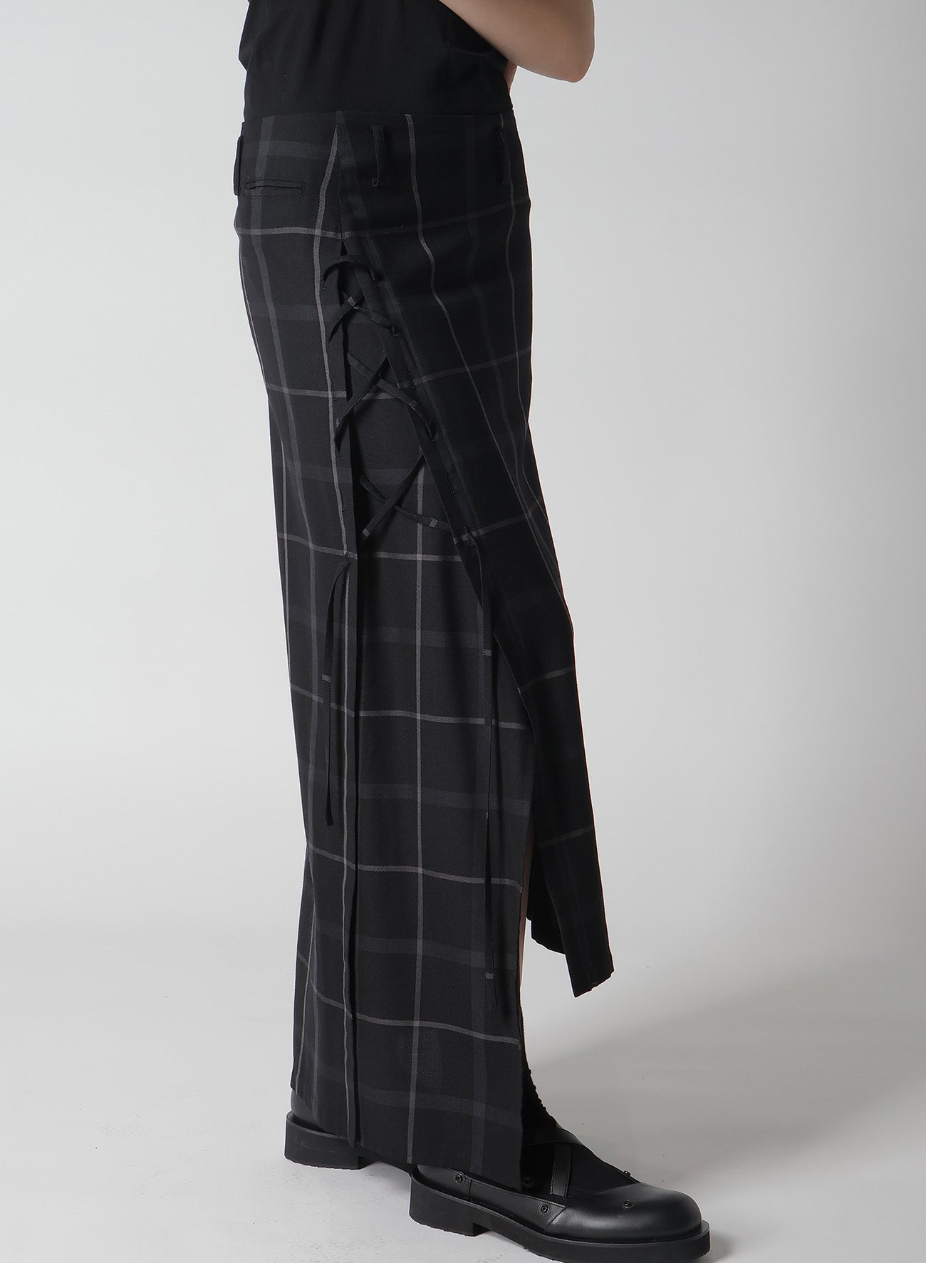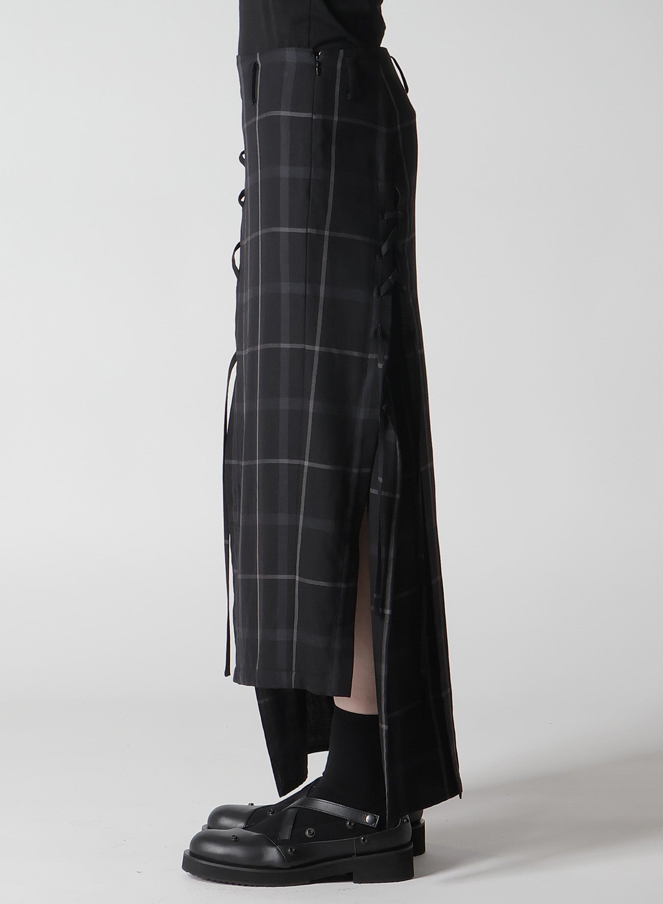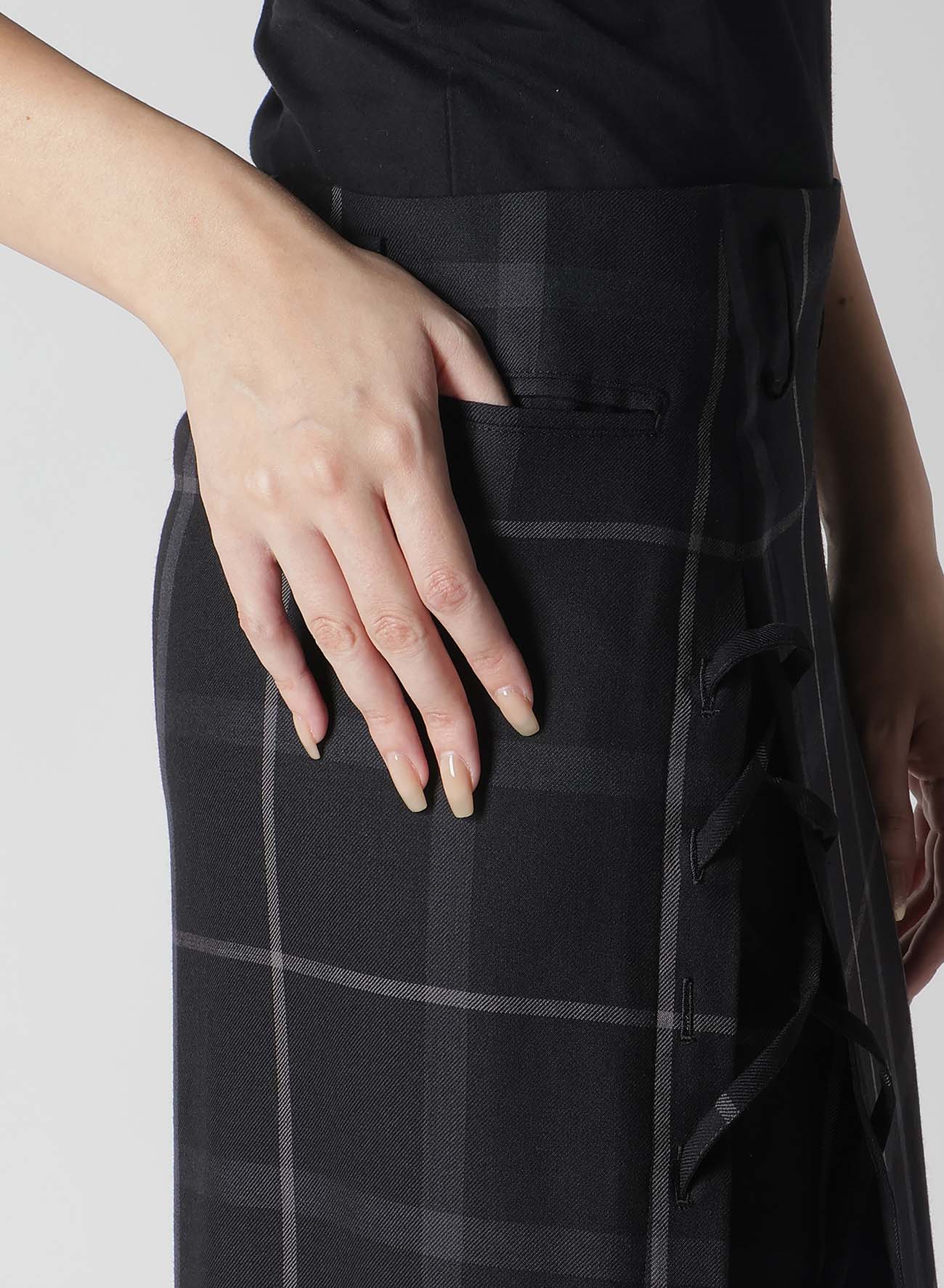 This men's-style plaid fabric combines wool and polyester. It features a perfect balance of stiffness and softness, a subtle sheen, and a supple texture. The skirt has an A-line silhouette with a slit at the hem, accented by a lace-up design on the right front, and an asymmetric hem that provides varied expressions from different angles.