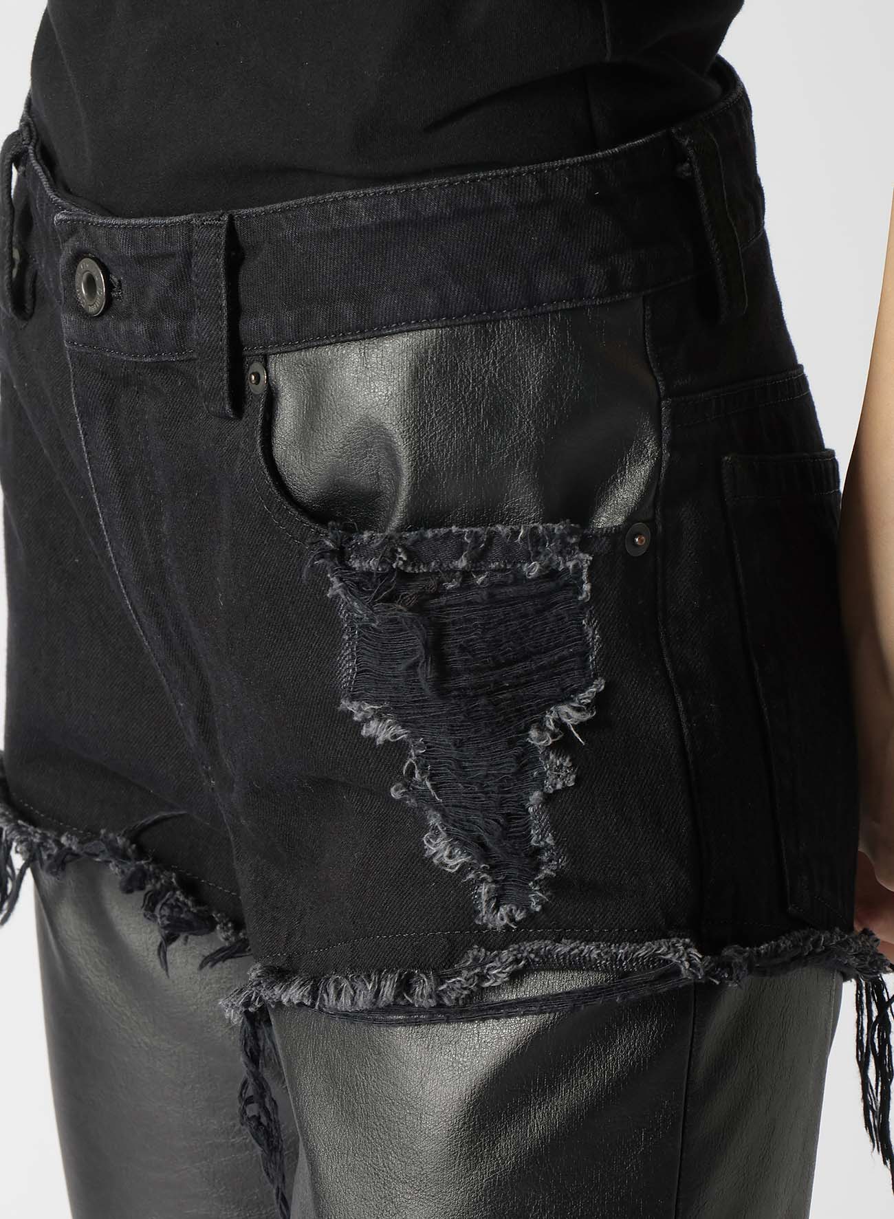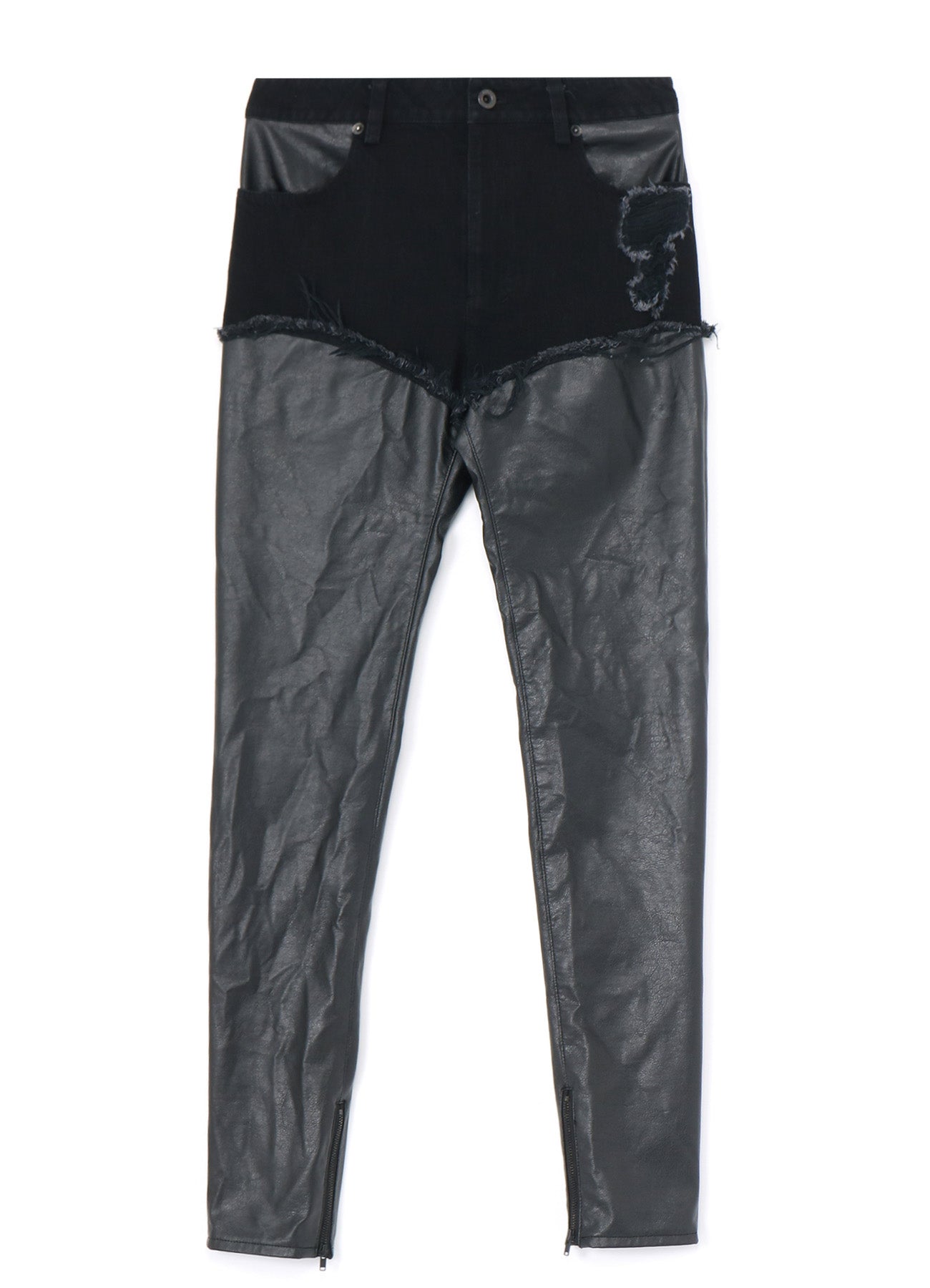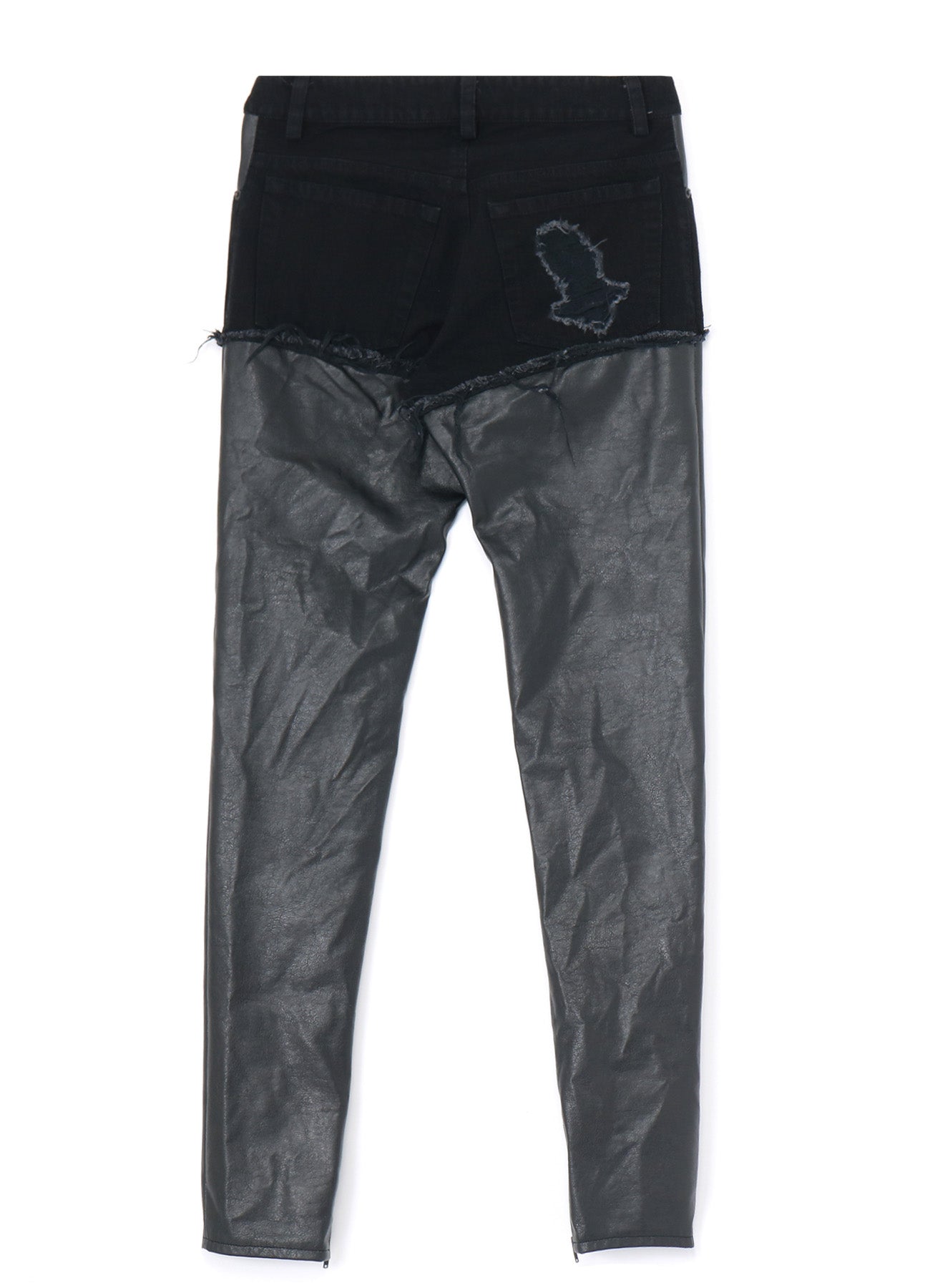 Using black denim with a natural unevenness and appropriate weight, these pants feature damage processing using laser exposure. This technique is commonly utilized in aged processing and pattern designs like Yohji Yamamoto collections. The laser is expertly applied to maintain the horizontal threads, with additional handwork by artisans ensuring each piece has unique damage expressions.