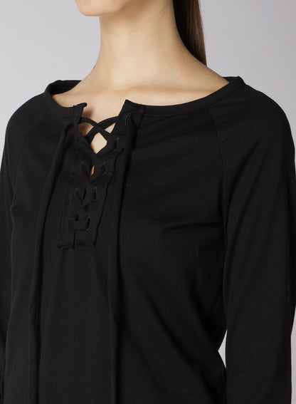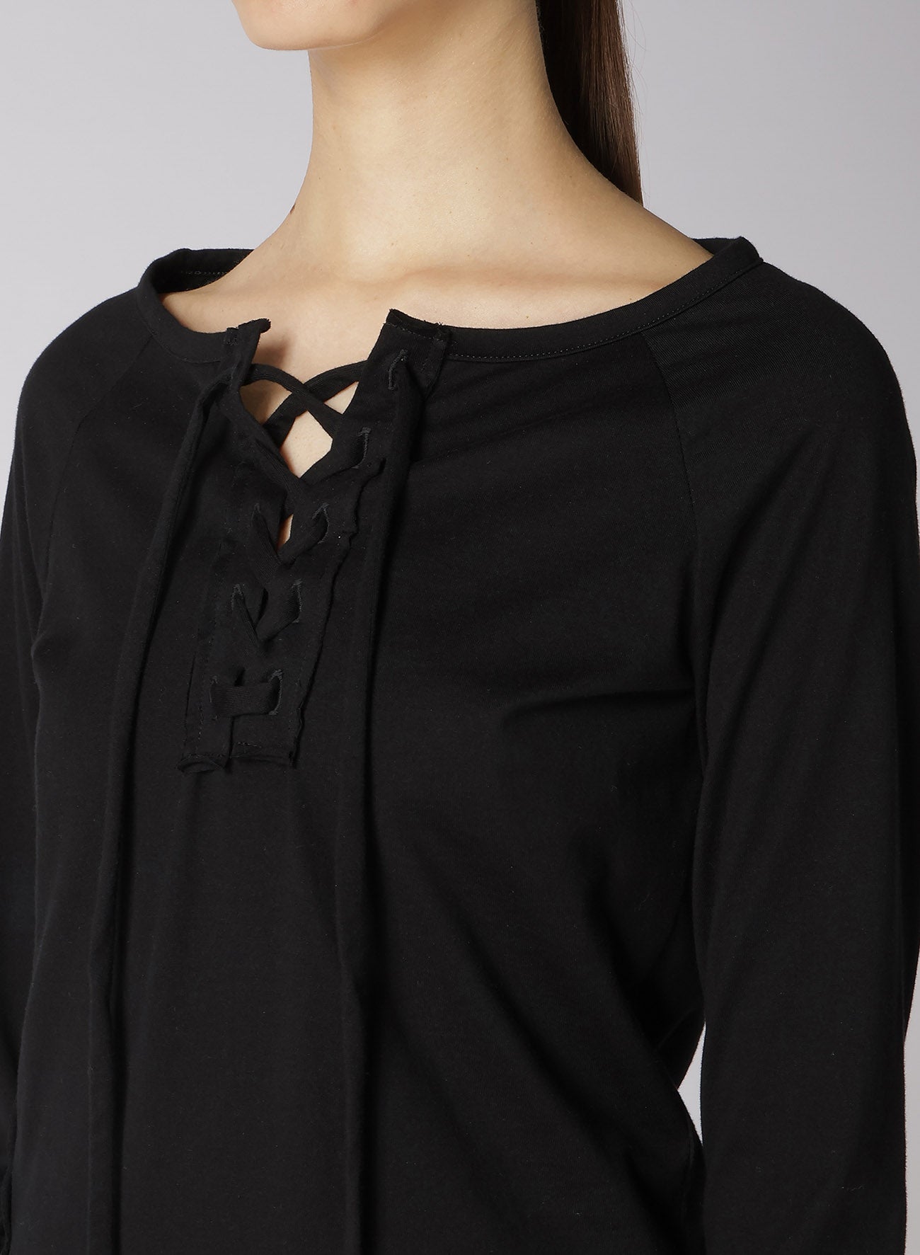 - Features lace-up details at the neckline and right side.