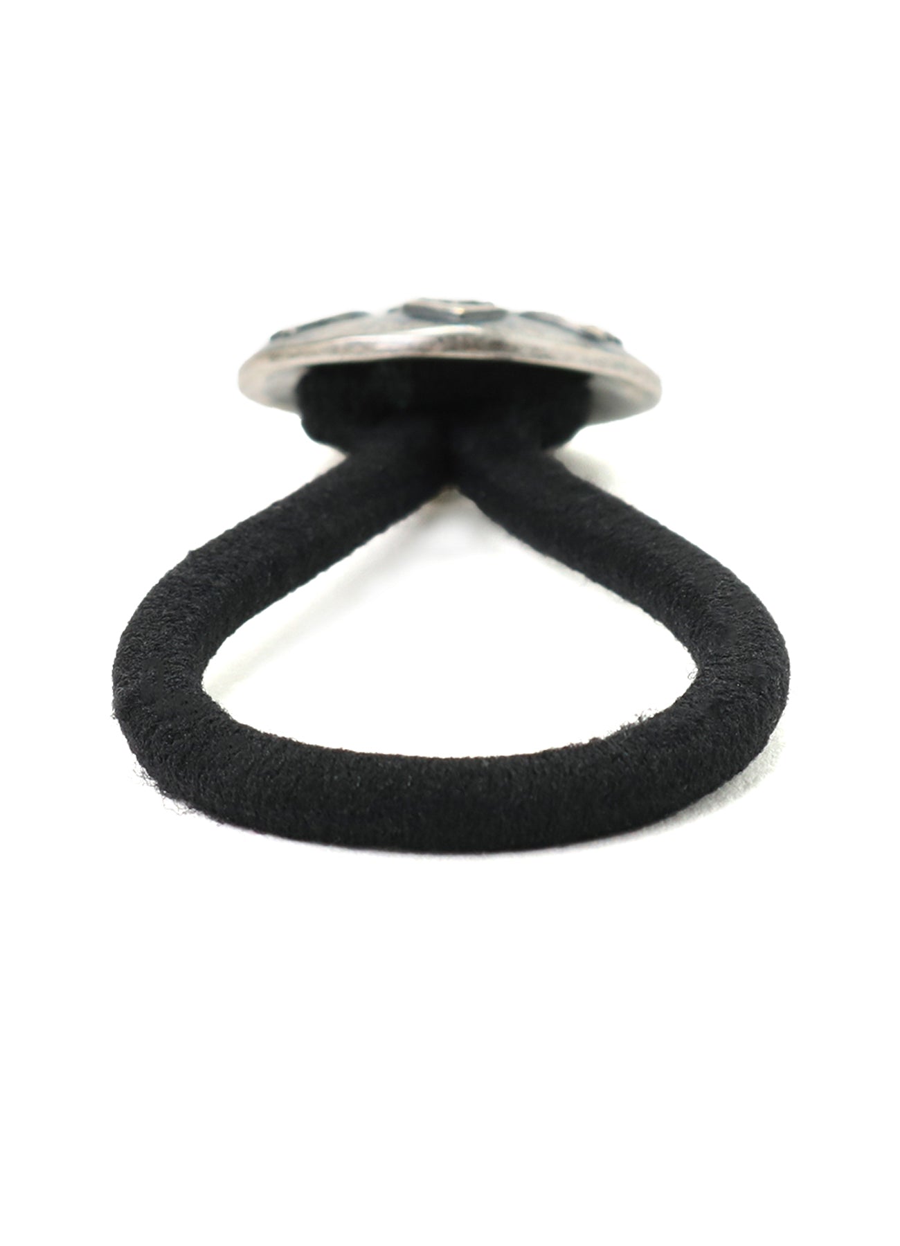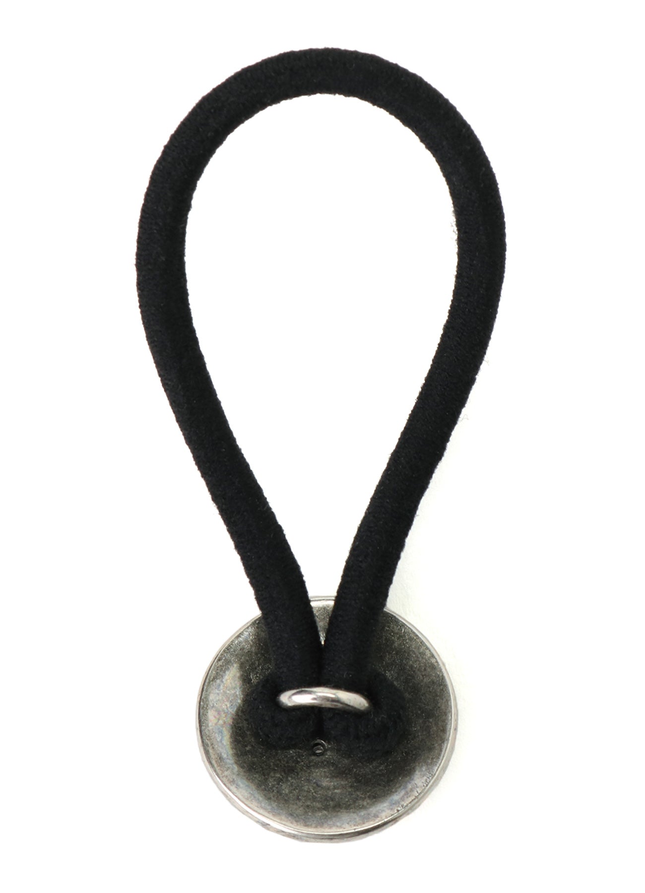 A versatile item featuring a concho button threaded with a replaceable elastic band, usable as a hair tie or bracelet. The elastic band can be swapped out for extended use.