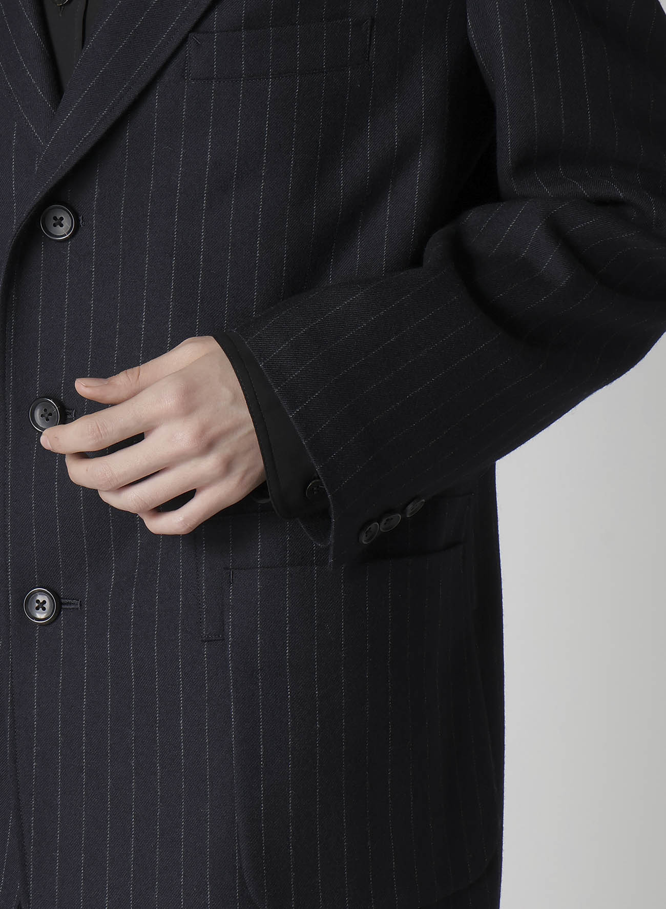 This 3-button jacket is crafted from Merino wool serge, showcasing its natural sheen and high-end feel. With one-wash processing, it offers a soft texture. The jacket’s standout feature is its large outer pockets. It also pairs well with matching pants for a complete look.