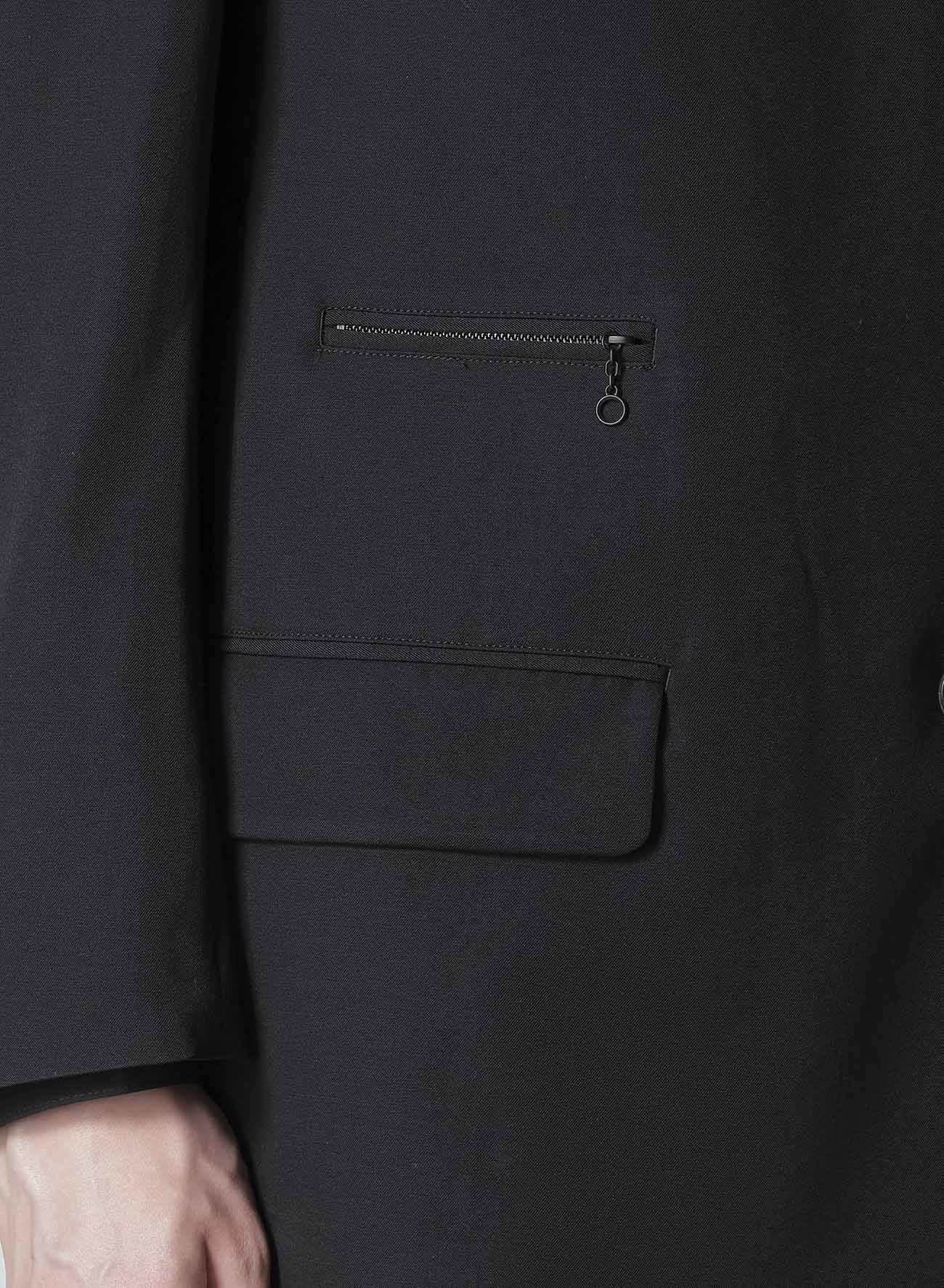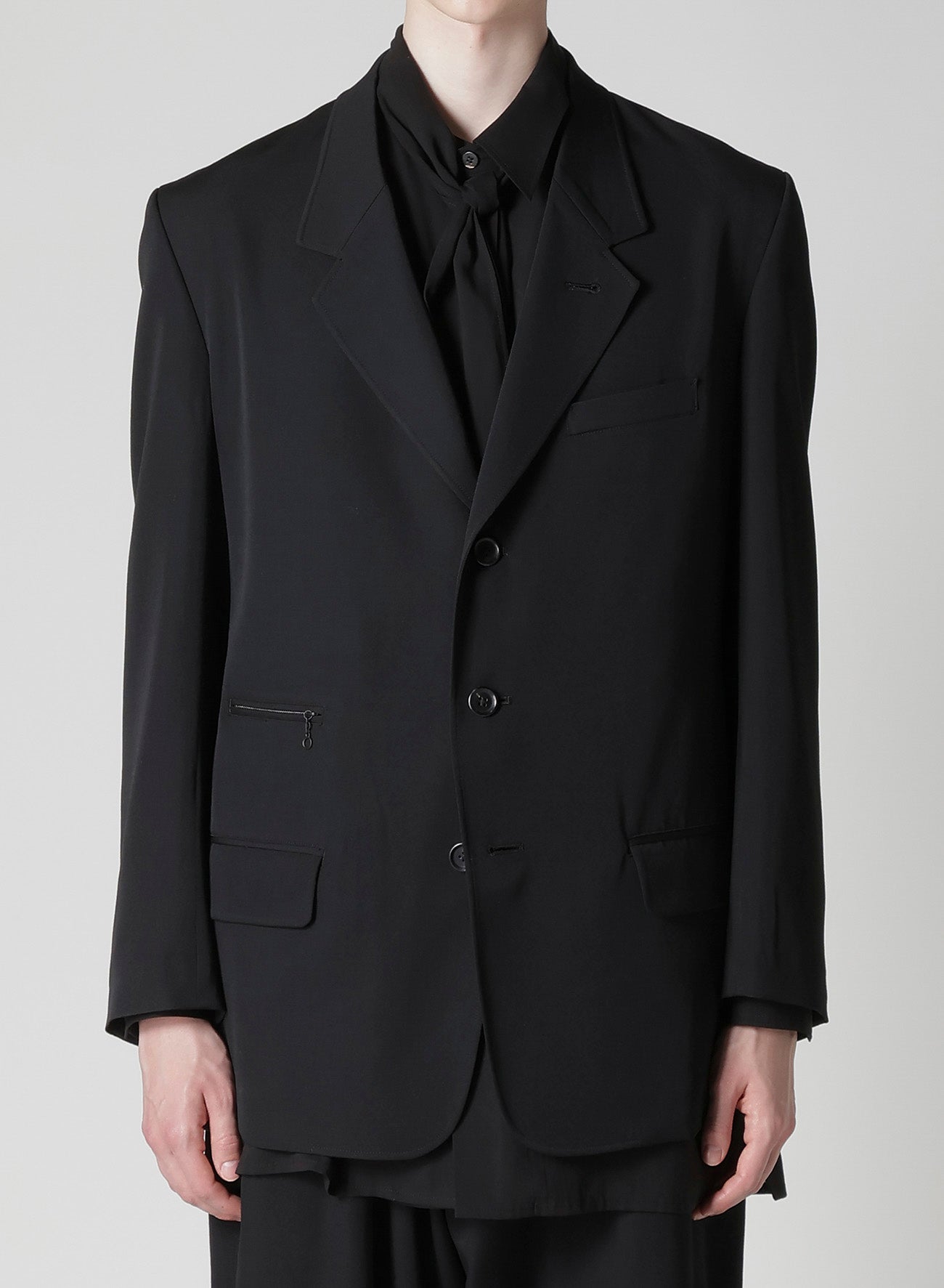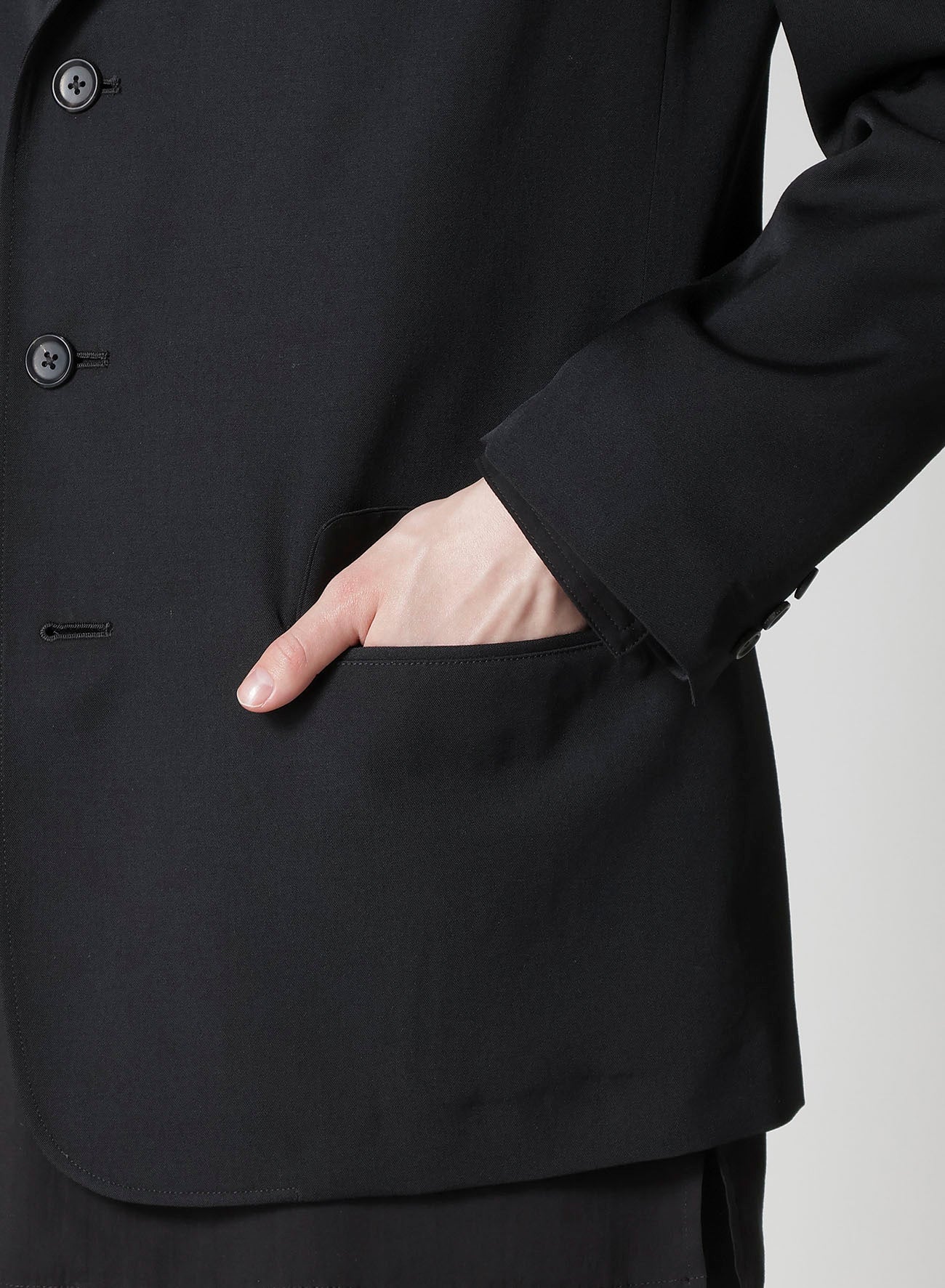 This wool gabardine three-button jacket uses a signature material from Yohji Yamamoto, which is lightly wrinkled during finishing to enhance the wool's natural texture. The classic design suits business and occasion scenes, featuring subtle stitching and a zipper change pocket. Model images may differ from the actual product in fit and texture.