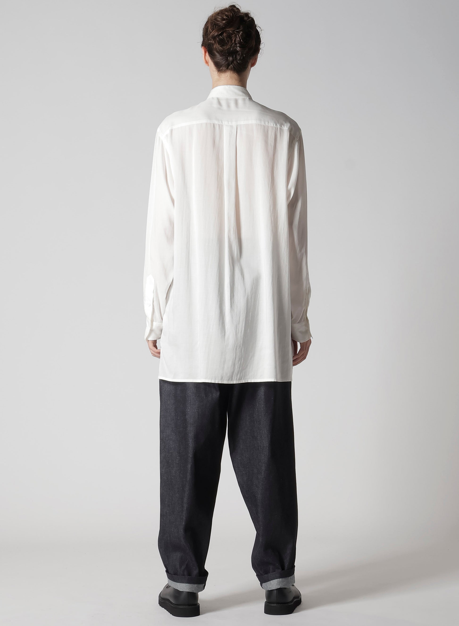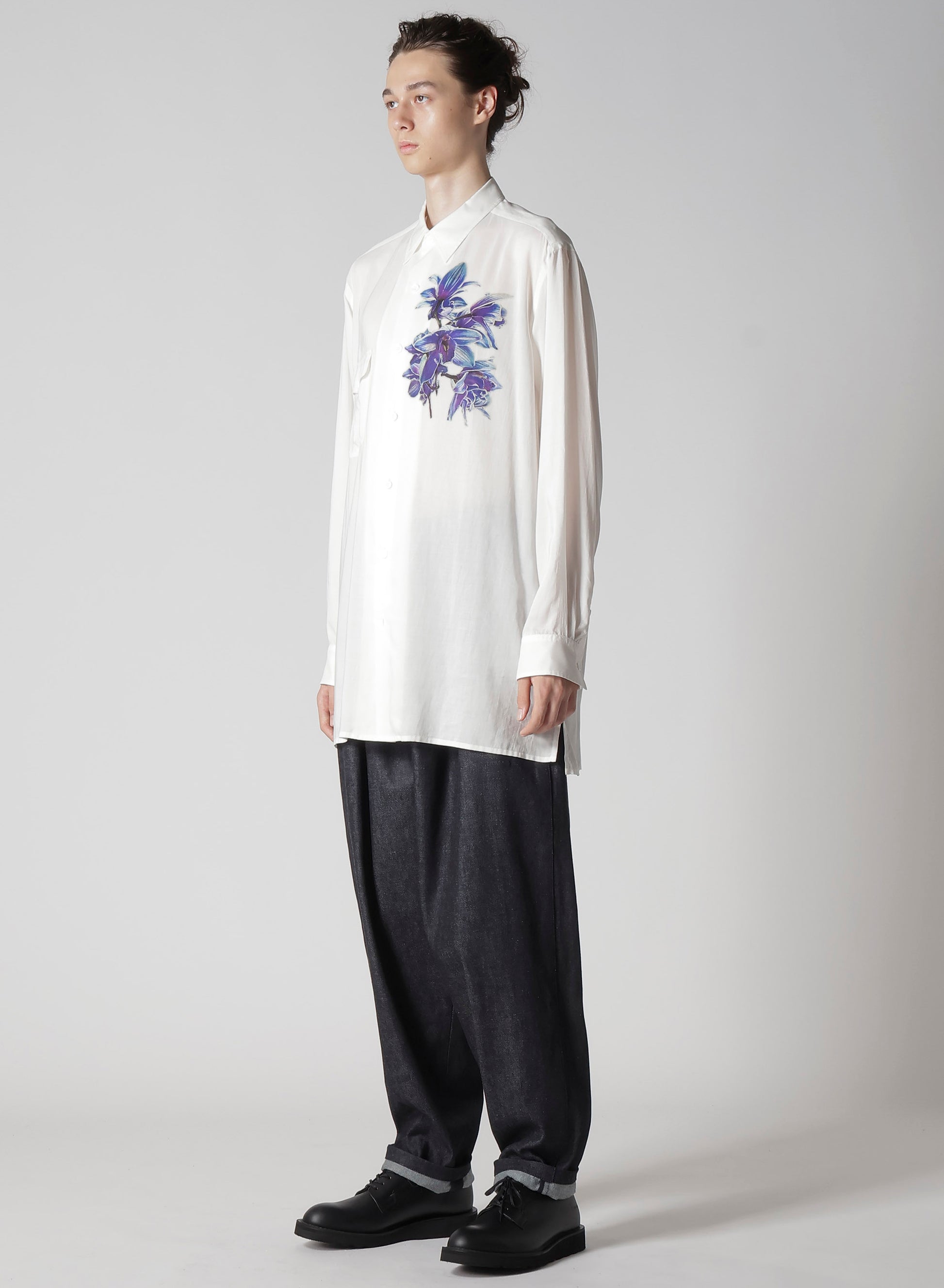 "This cellulose shirt features a striking print of a vivid blue flower on the left chest, crafted from soft, drapery fabric for a breezy feel. With its elegant floral pattern on a white background, it exudes a clean impression suited for both casual and formal settings, proving versatile for various occasions.