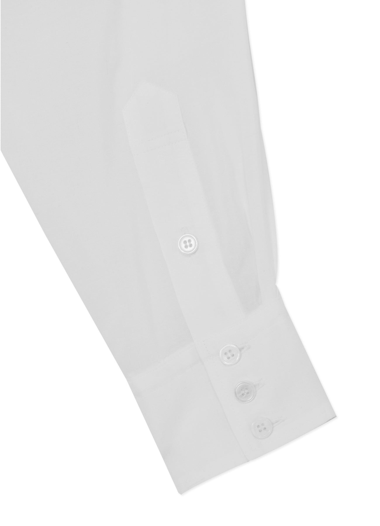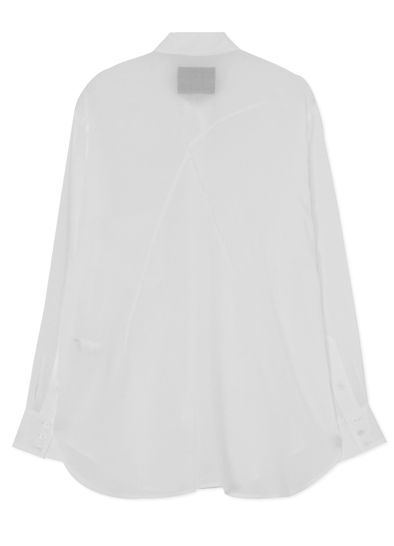 This shirt, crafted from Tencel cellulose lawn material, is noted for its distinctive softness and unique drape. It features multiple darts on the body, giving it a tailored and refined silhouette.
