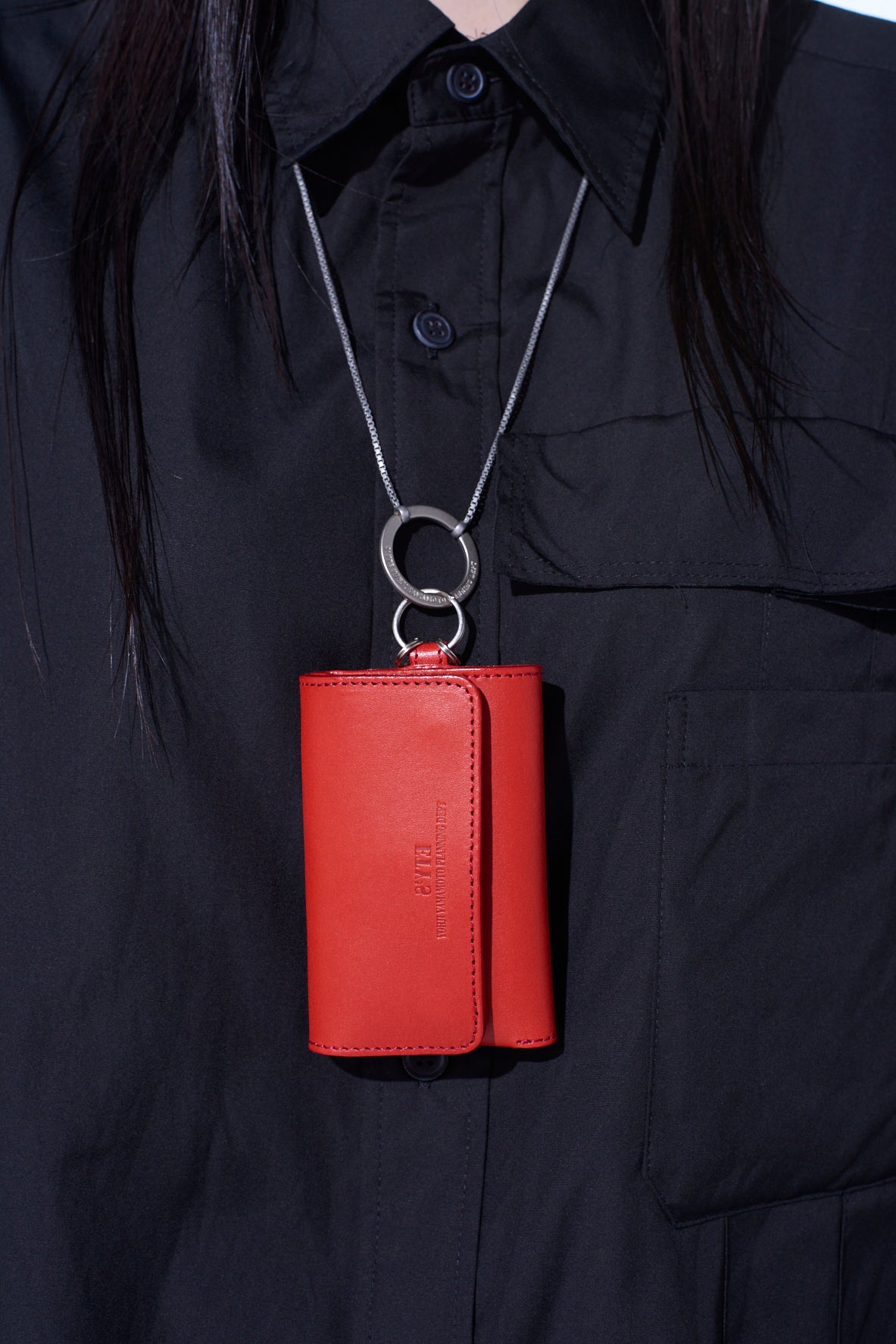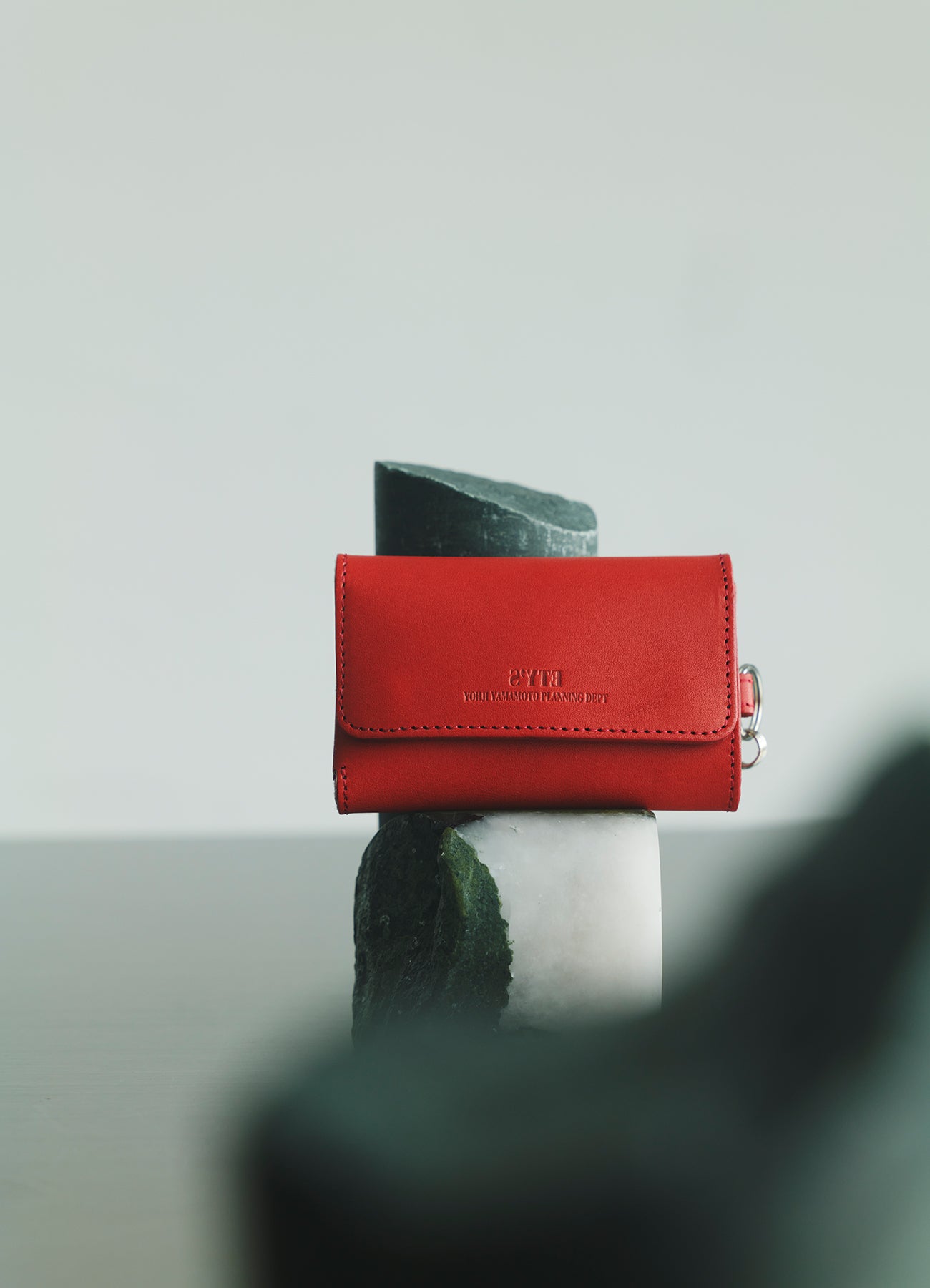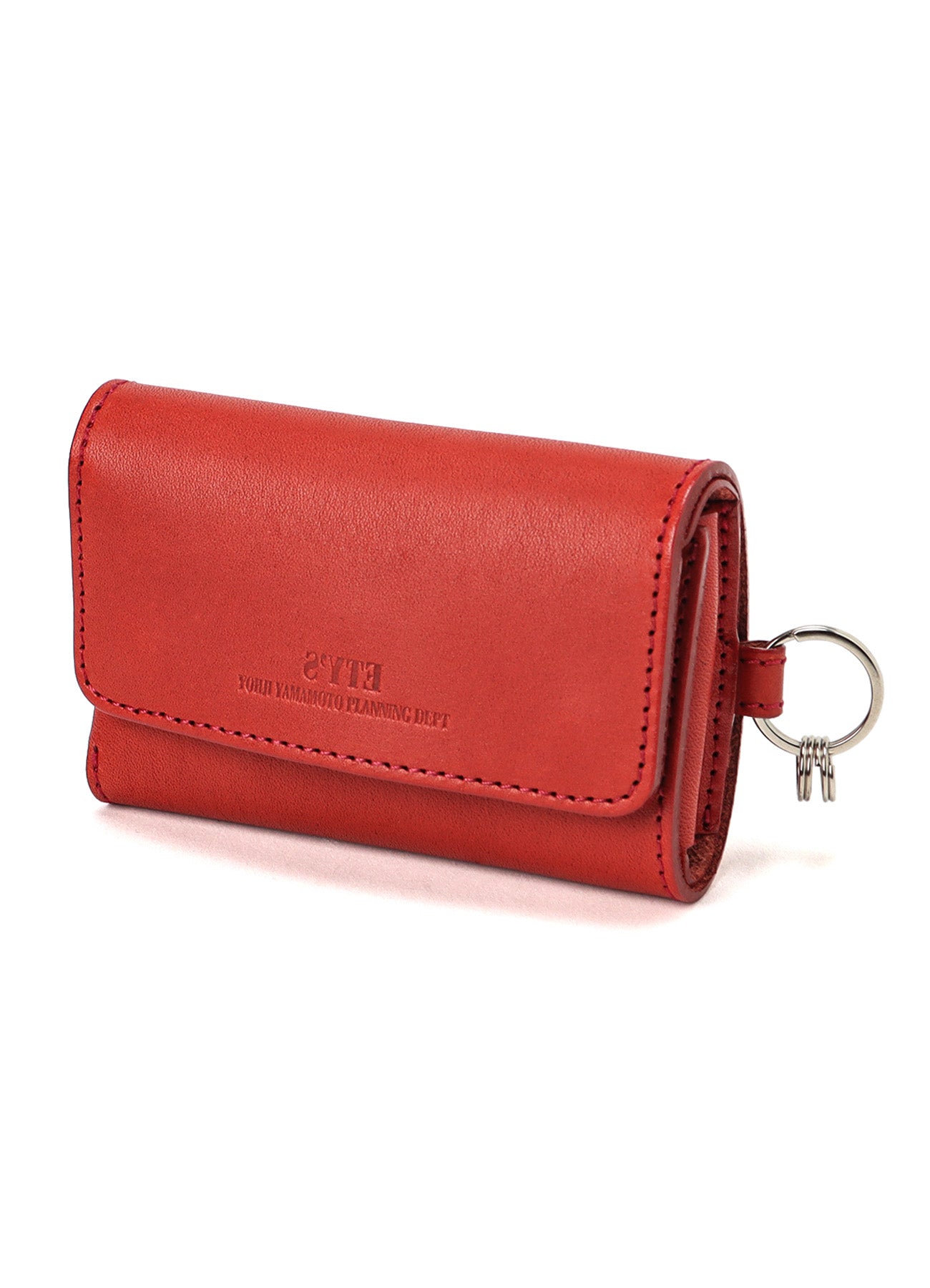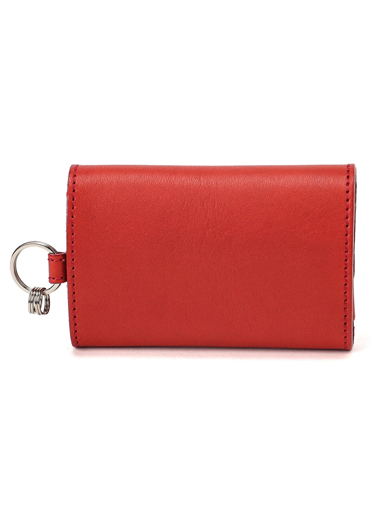 Compact, Japanese-made, handmade, tri-fold wallet with coin pocket, card case, and space for business cards. Holds up to 10 bills, 5-10 cards, 5-10 business cards, and 10-25 coins. Features a key ring and mini-ring for keys. Made from durable, vegetable-tanned leather, including "Tochigi Leather." Available in classic black and new red.