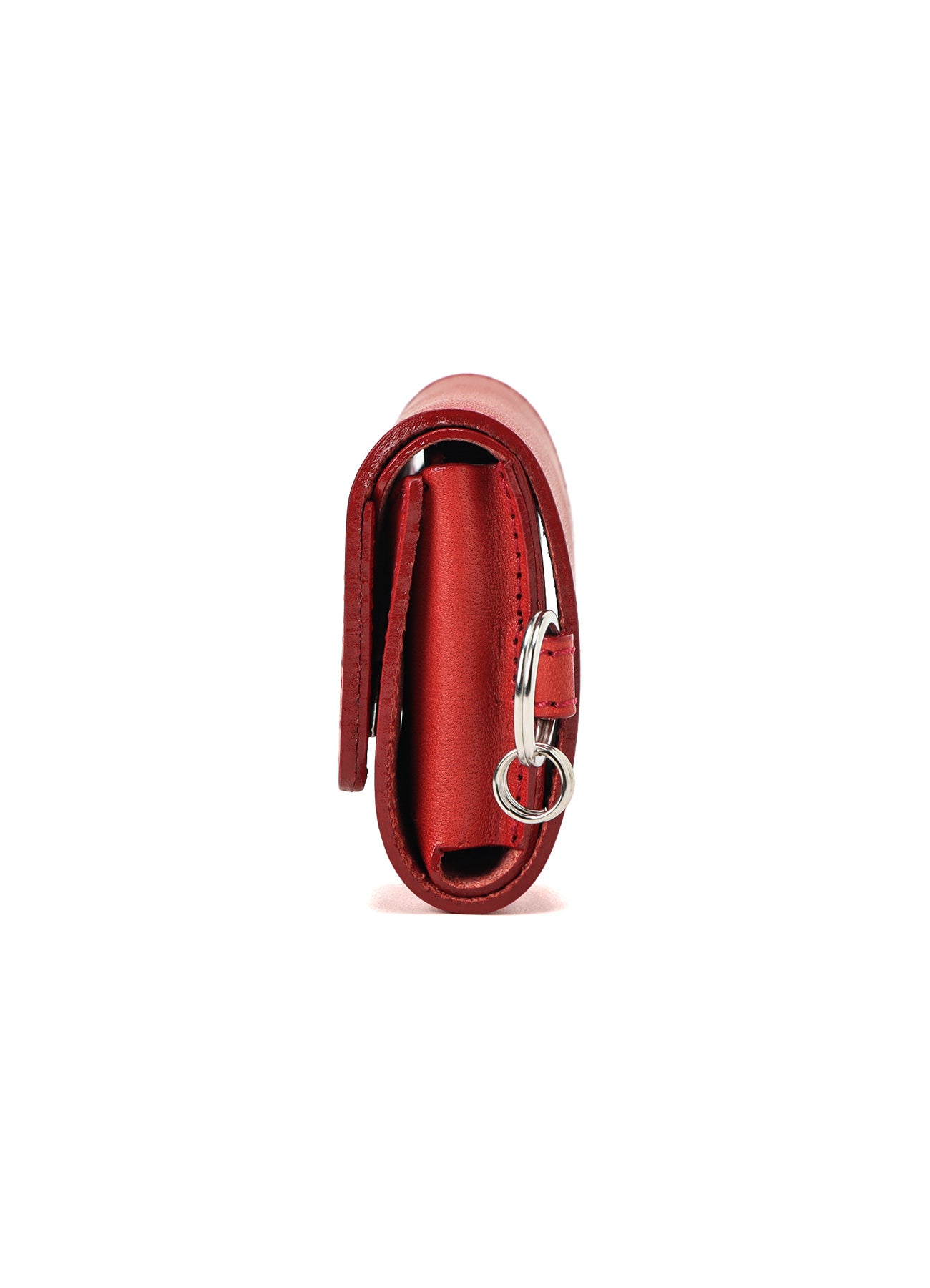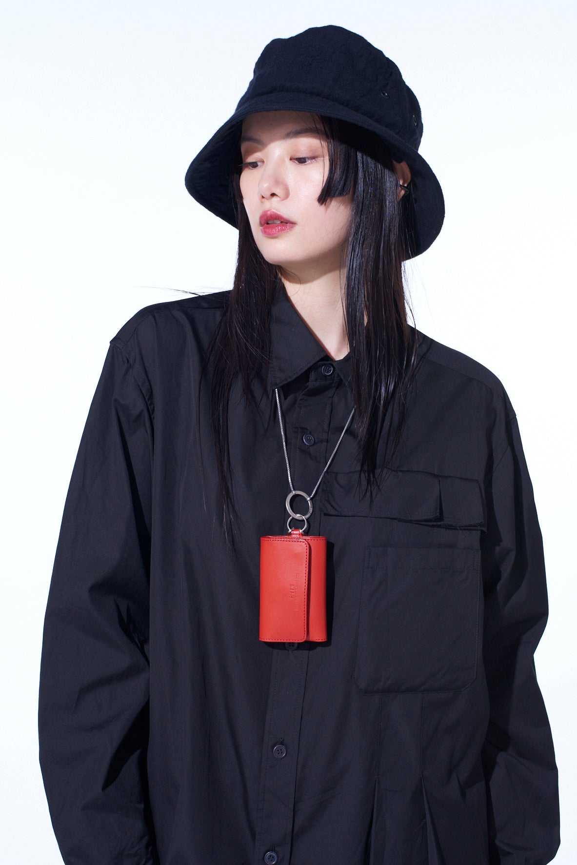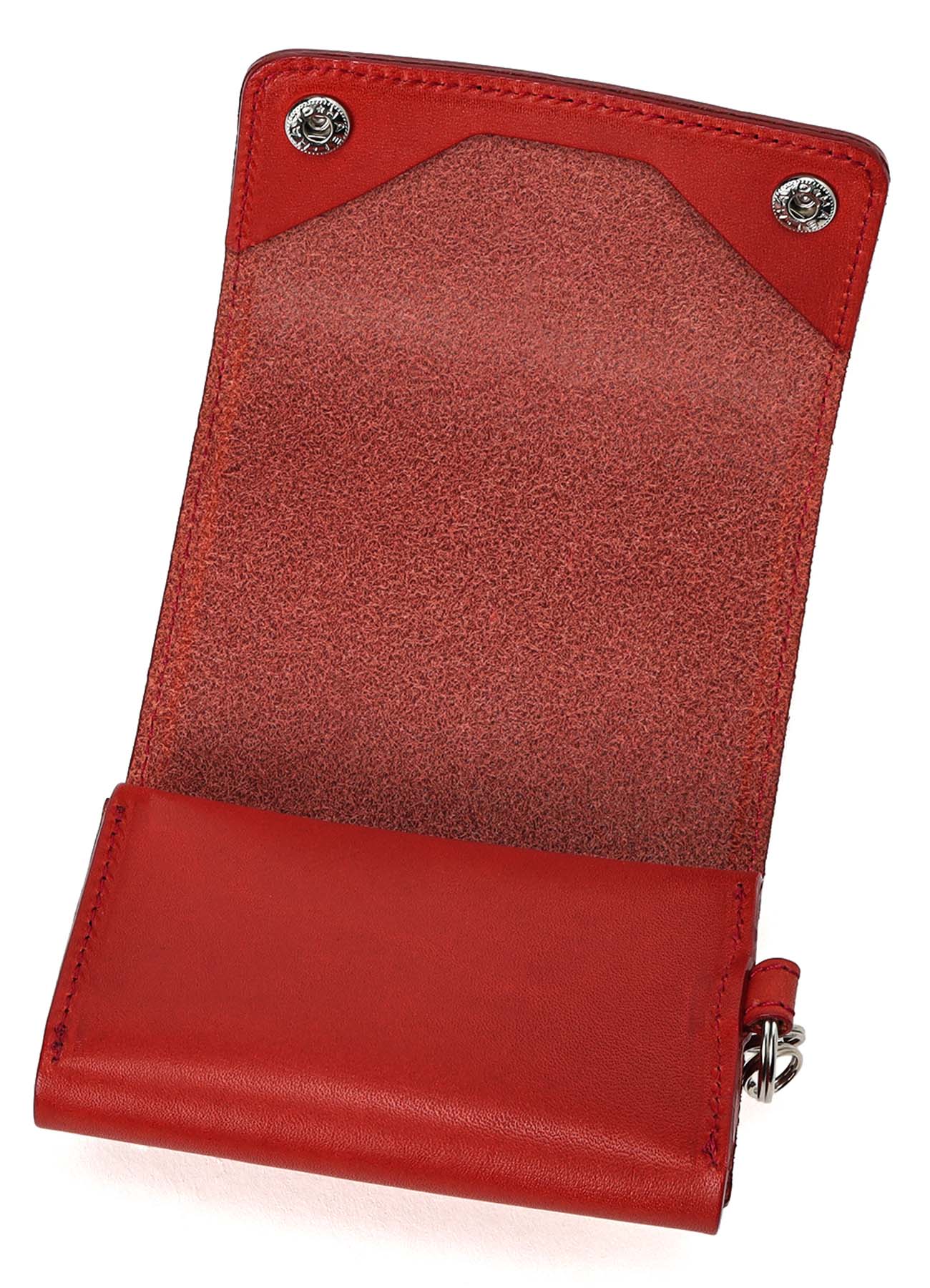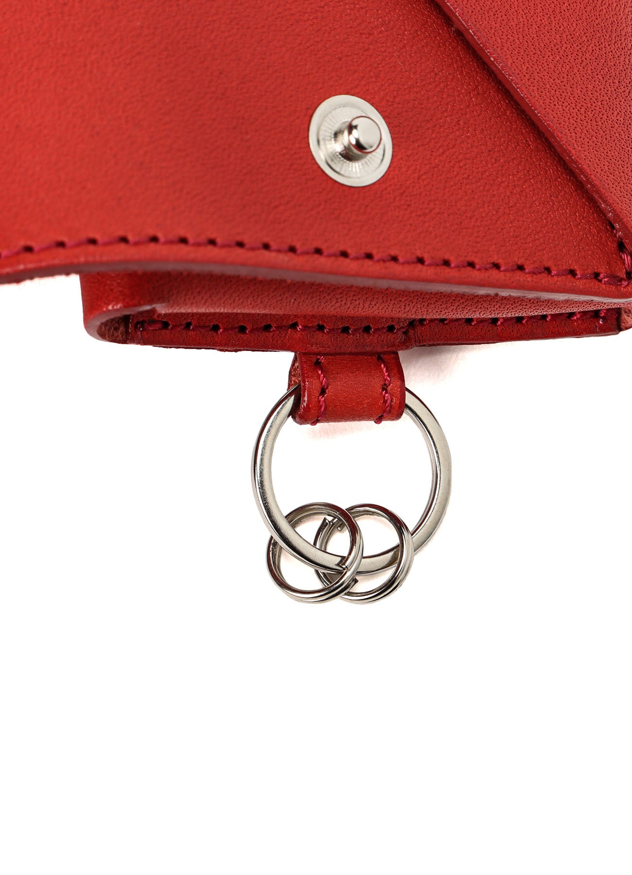 Compact, Japanese-made, handmade, tri-fold wallet with coin pocket, card case, and space for business cards. Holds up to 10 bills, 5-10 cards, 5-10 business cards, and 10-25 coins. Features a key ring and mini-ring for keys. Made from durable, vegetable-tanned leather, including "Tochigi Leather." Available in classic black and new red.