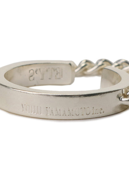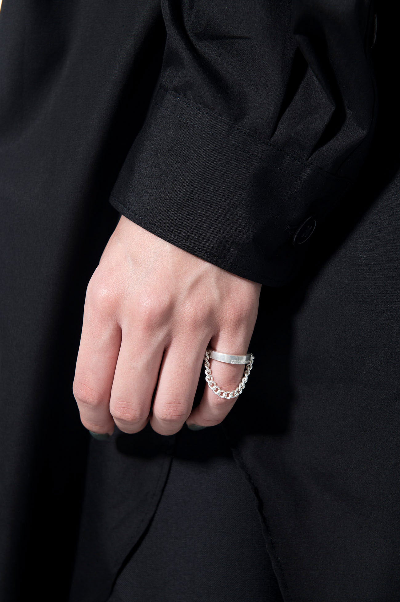 A unique ring featuring a simple flat design with an attached chain for dynamic movement. A subtly engraved logo adds an elegant touch. This accessory offers a 3-way versatility: wear it as a ring, with the chain showing, or as an ear cuff. The chain adds a striking presence to any outfit.