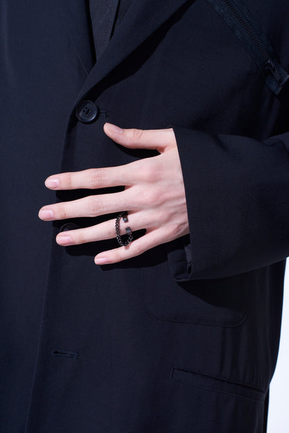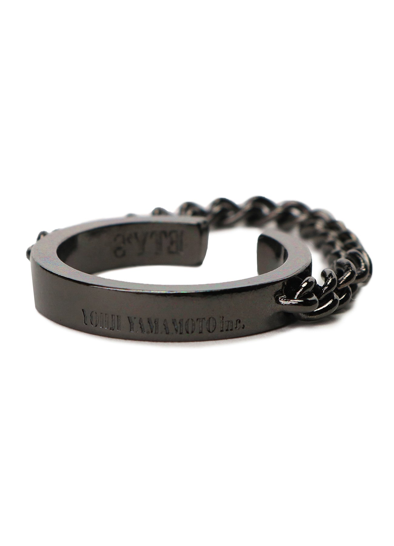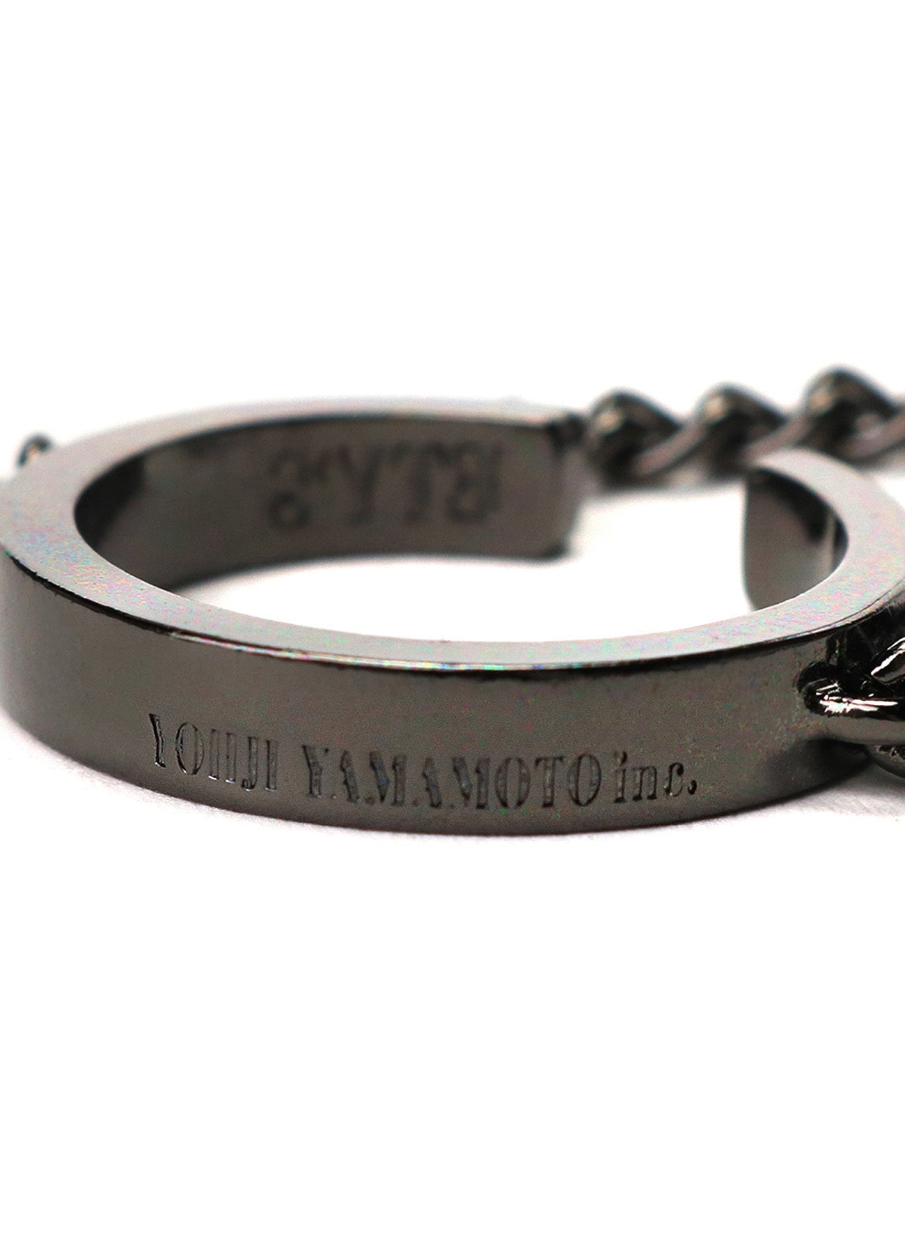 A unique ring featuring a simple flat design with an attached chain for dynamic movement. A subtly engraved logo adds an elegant touch. This accessory offers a 3-way versatility: wear it as a ring, with the chain showing, or as an ear cuff. The chain adds a striking presence to any outfit.