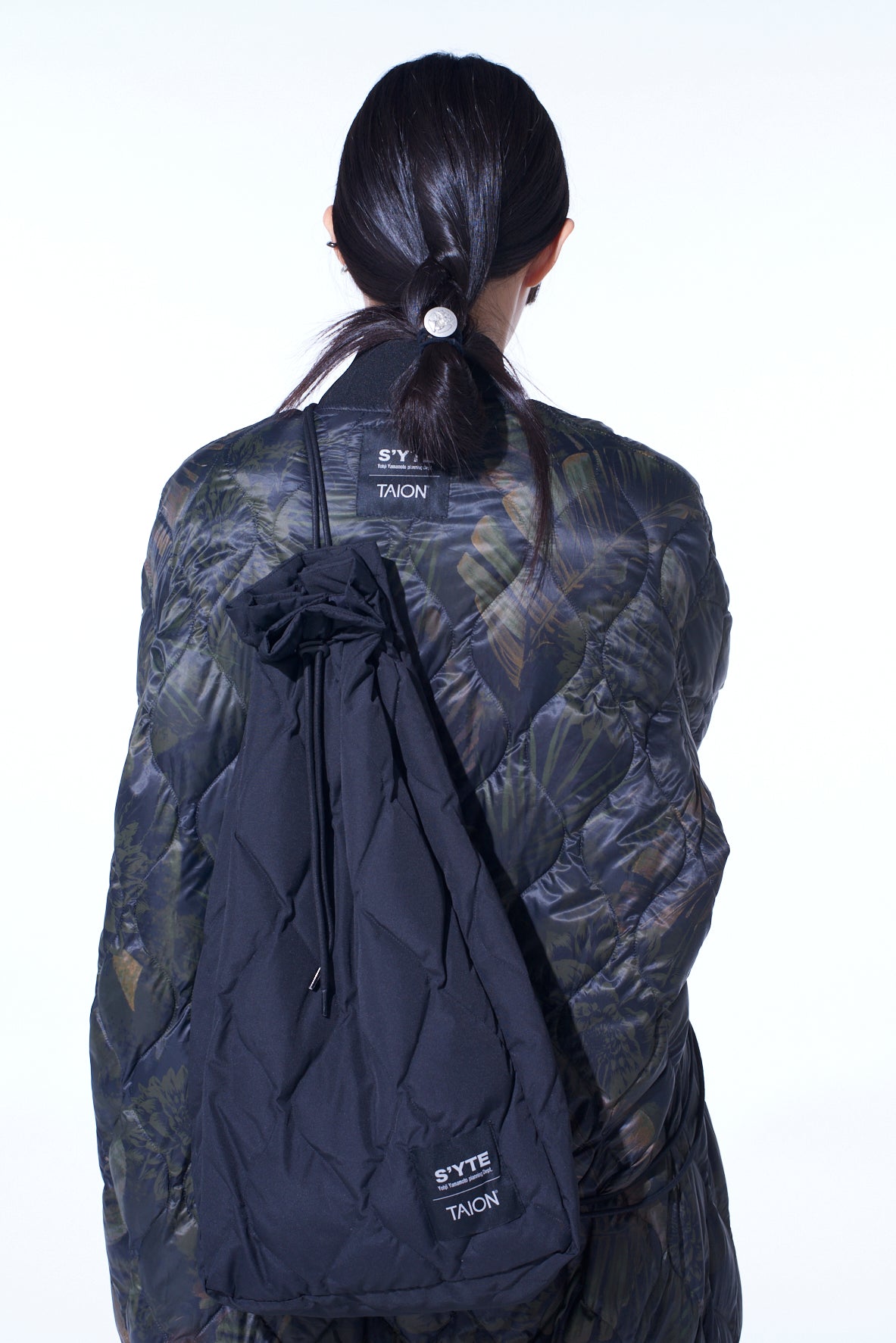 TAION's second collaboration item with S’YTE features a military-themed Mini Bon Sac. Incorporating military quilting, it offers a distinct texture and retains down around the stitches, minimizing down leakage. It is both a crossbody bag and bag-pack with adjustable straps and convenient hidden zipper for small essentials.