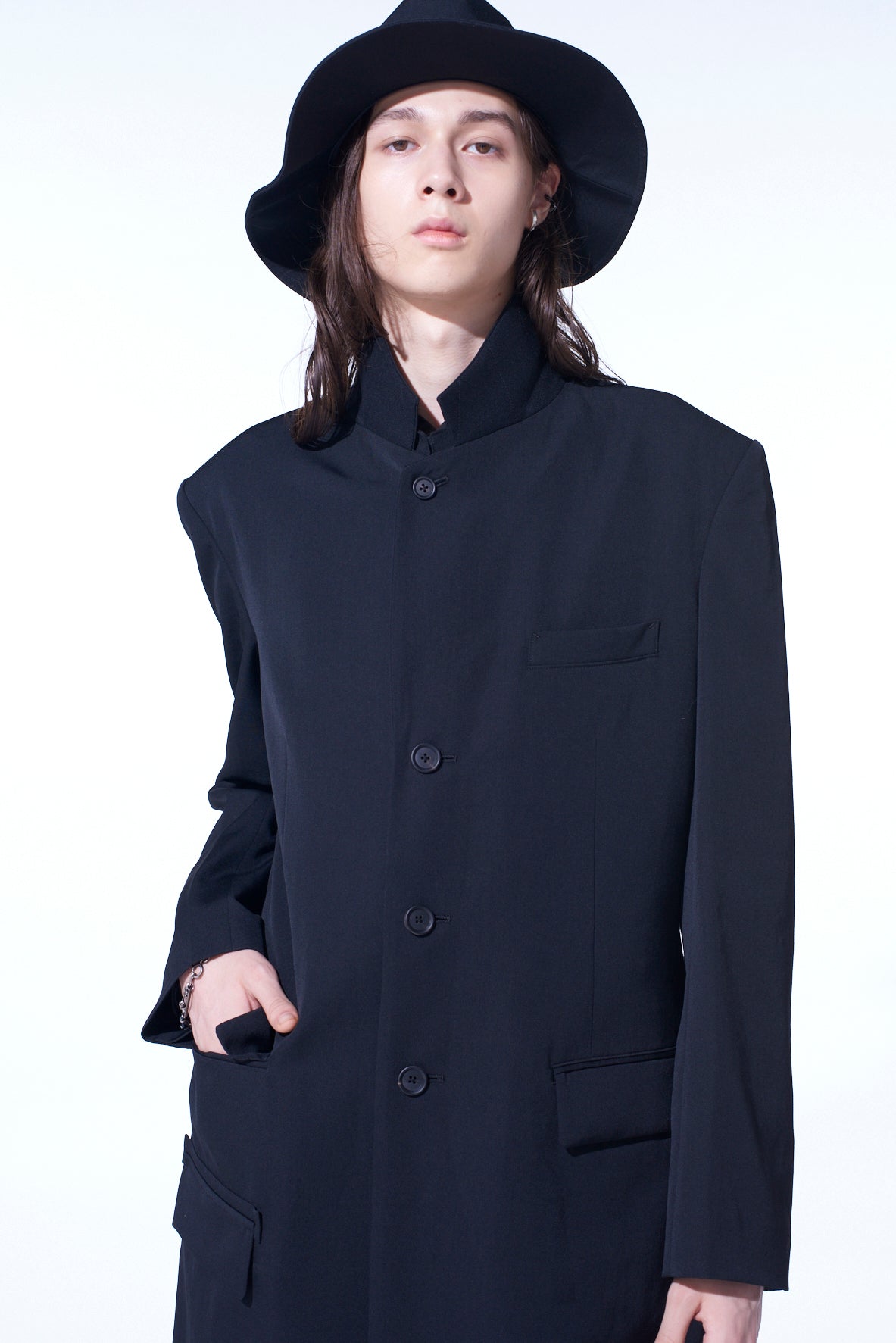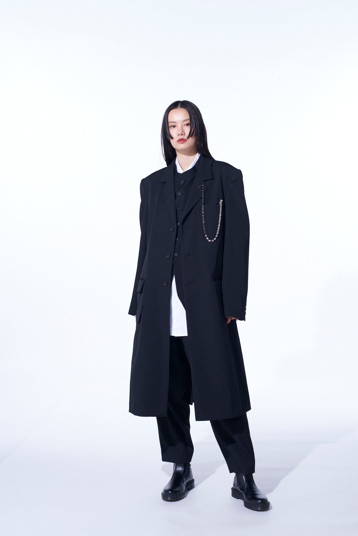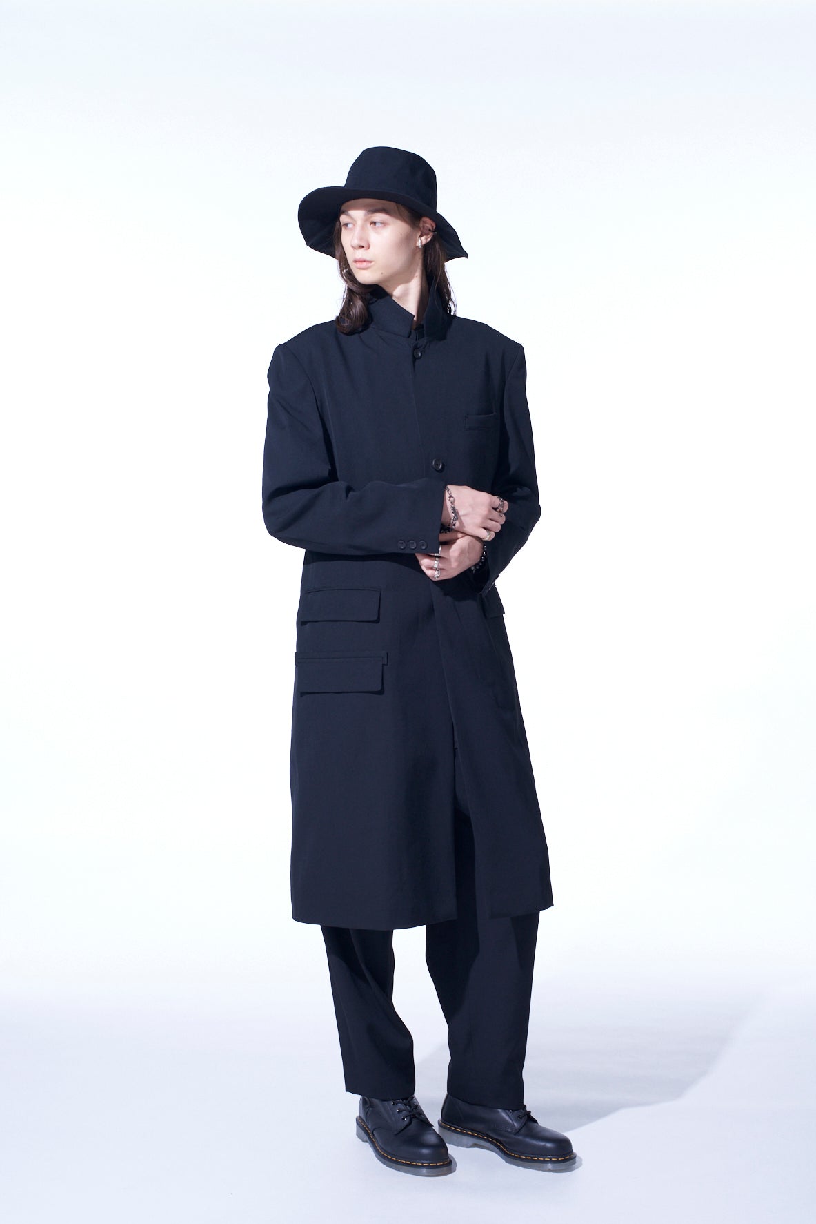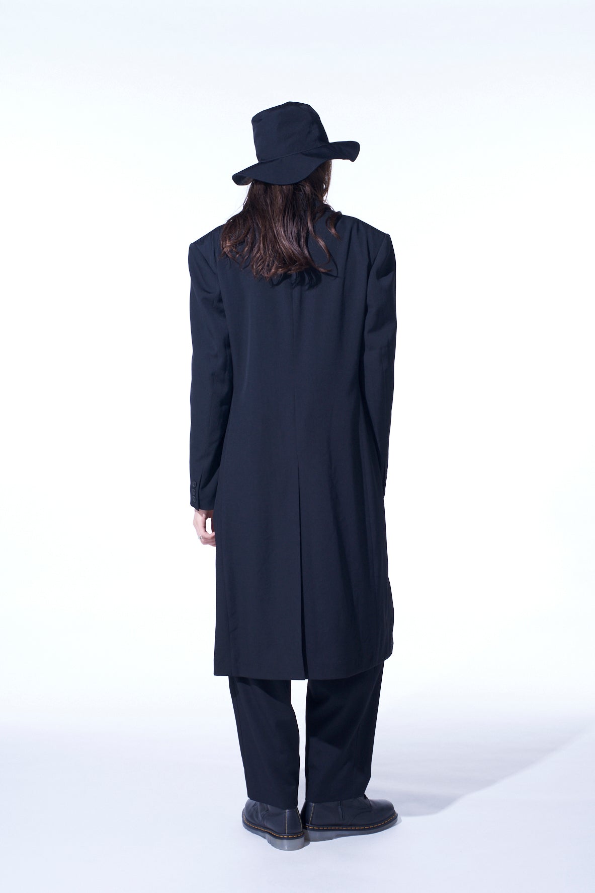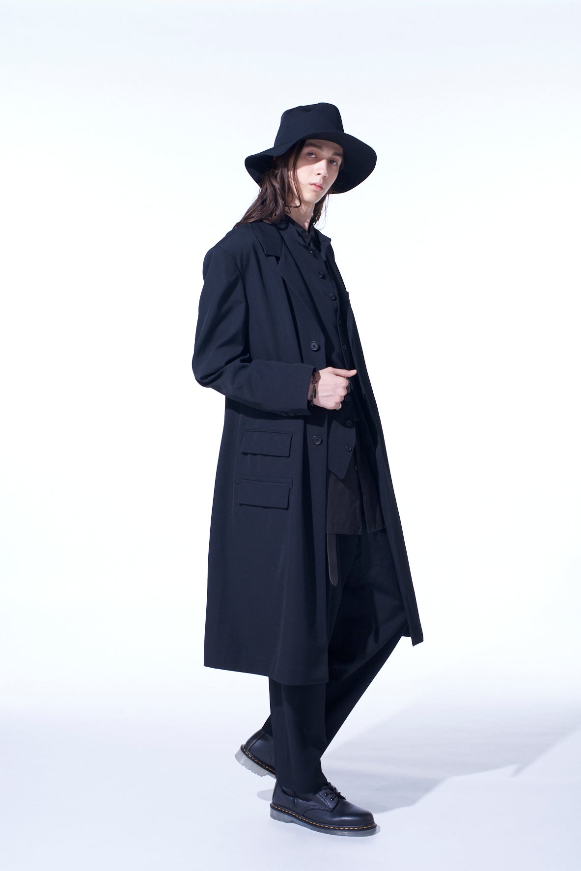 A notch-lapel tight long jacket made from signature wool gabardine, featuring a waist-cinching design and knee-length for ease of movement. It has unique details, including inner belts and buttoned stand collar options, exuding the August Sander collection feel. It includes three outer pockets and one inner pocket for functionality.