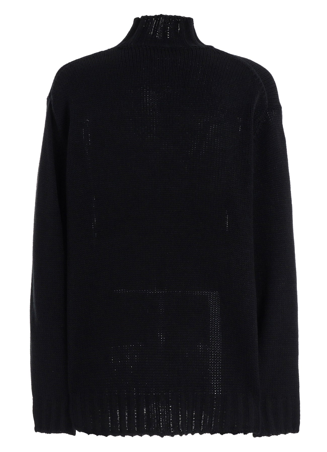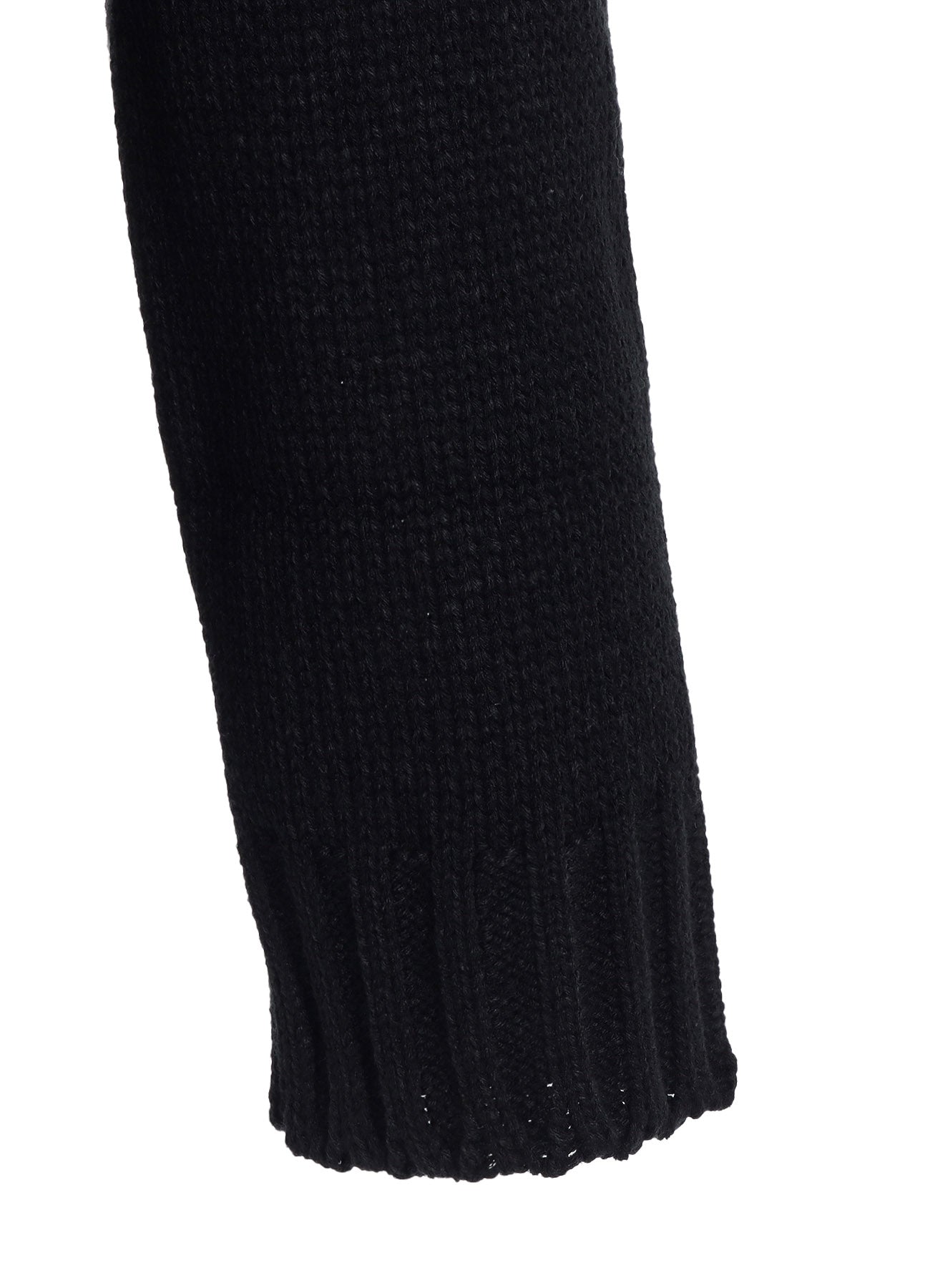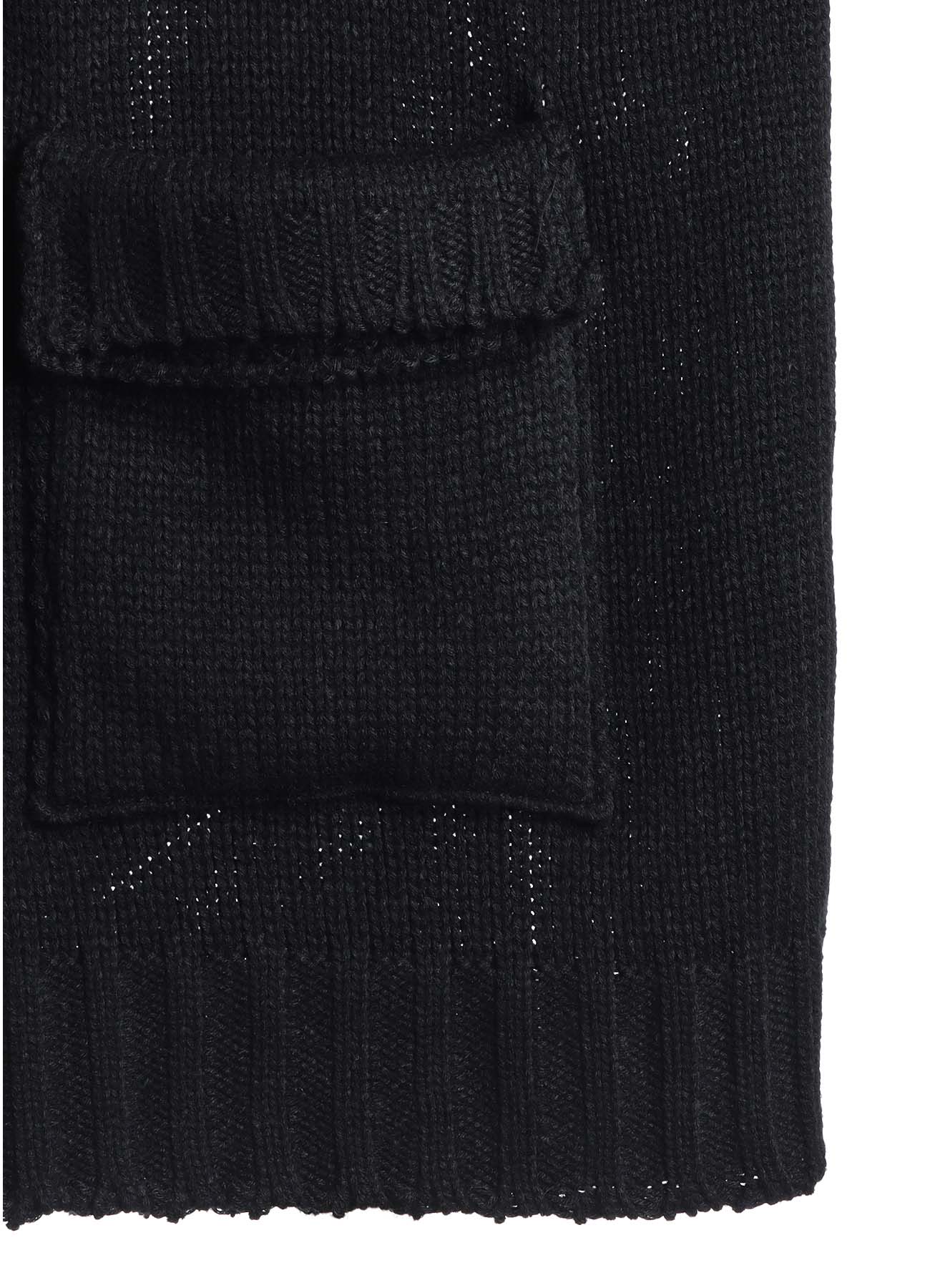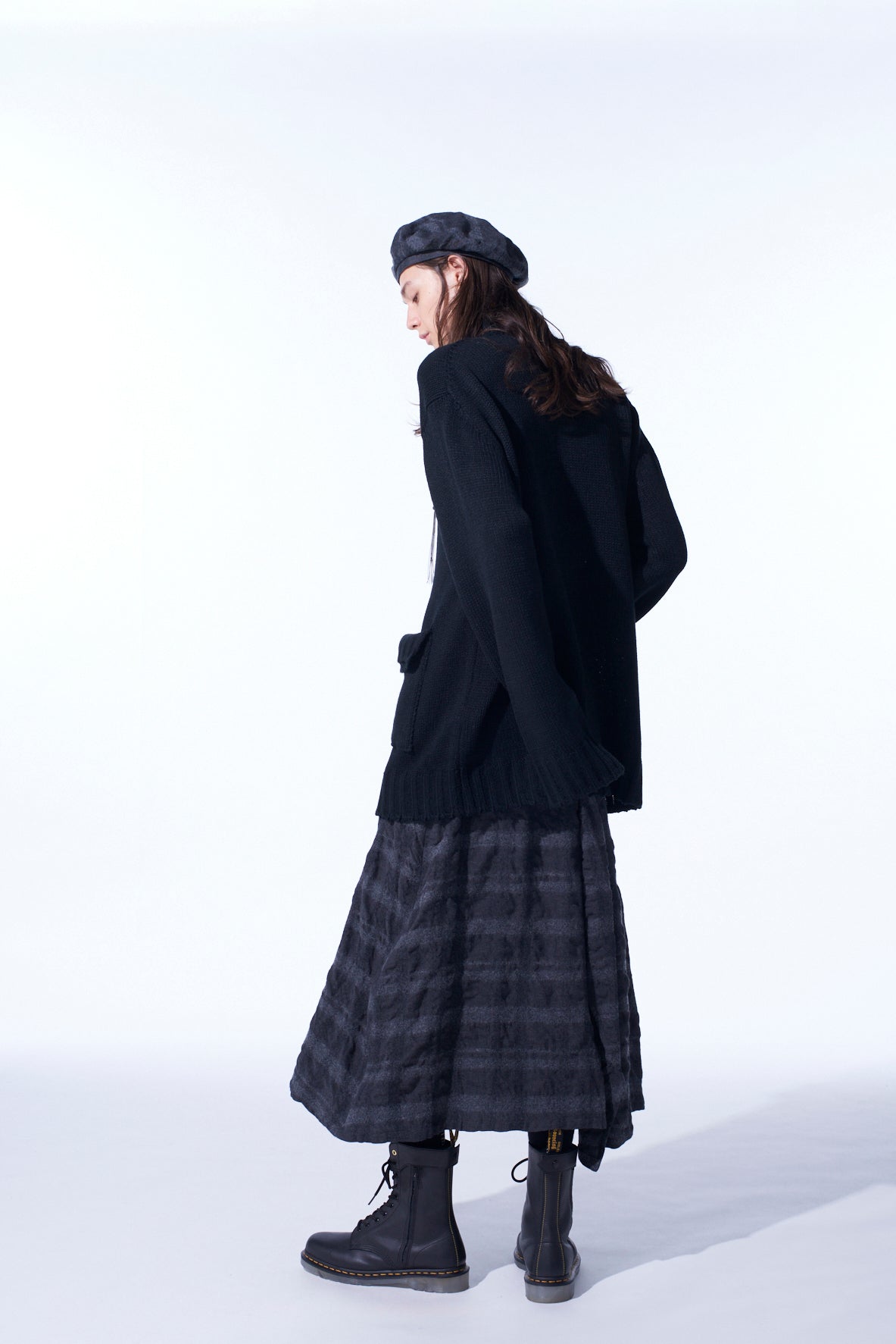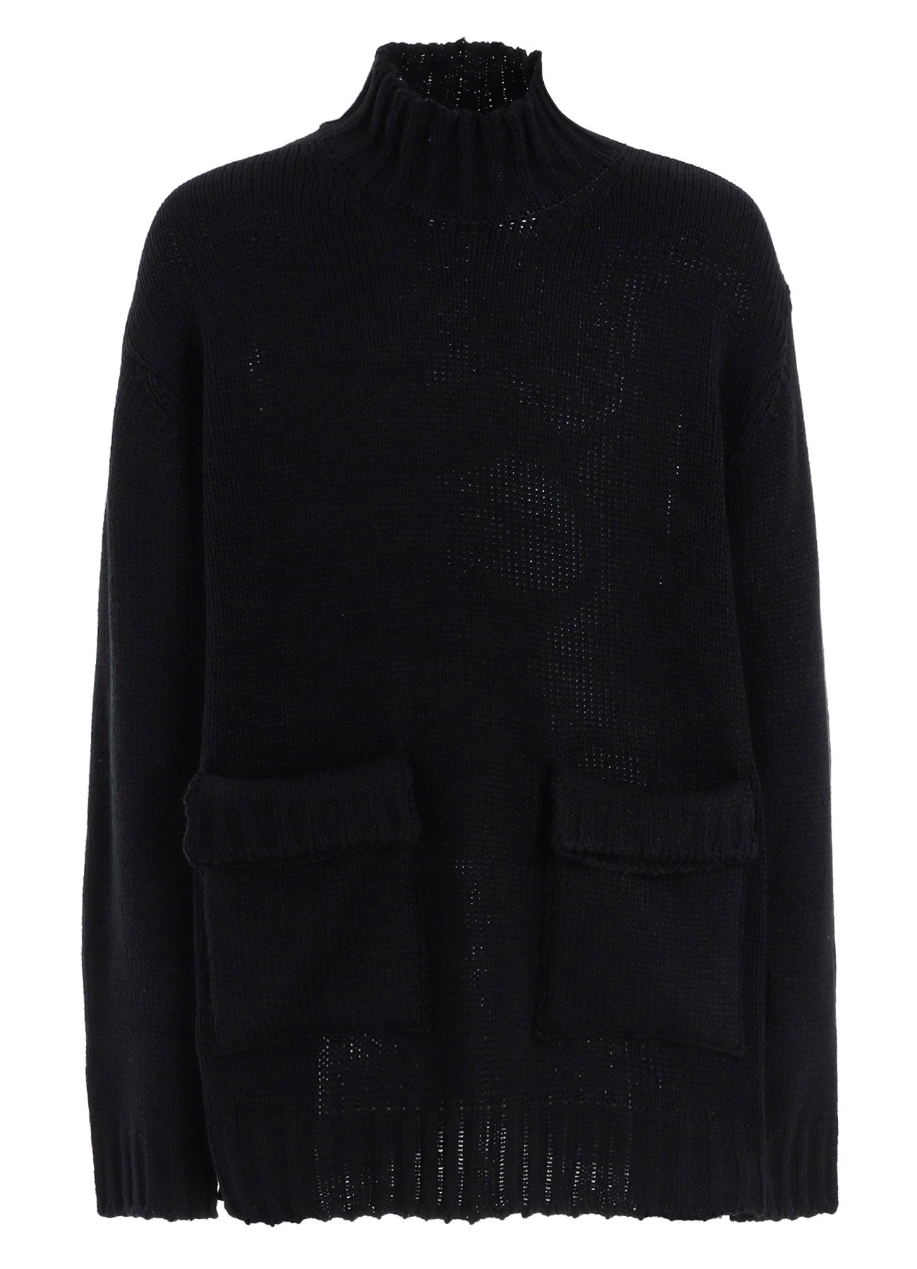 This high-neck knit is characterized by its iconic large front pocket, featuring a charmingly sagging ribbed opening distinctive of knitwear. Despite its fluffy appearance, the bulky wool fabric is lightweight and comfortable, perfect for layering without adding bulk. It pairs well with wide pants, creating a voluminous silhouette. Available in classic black and charcoal.