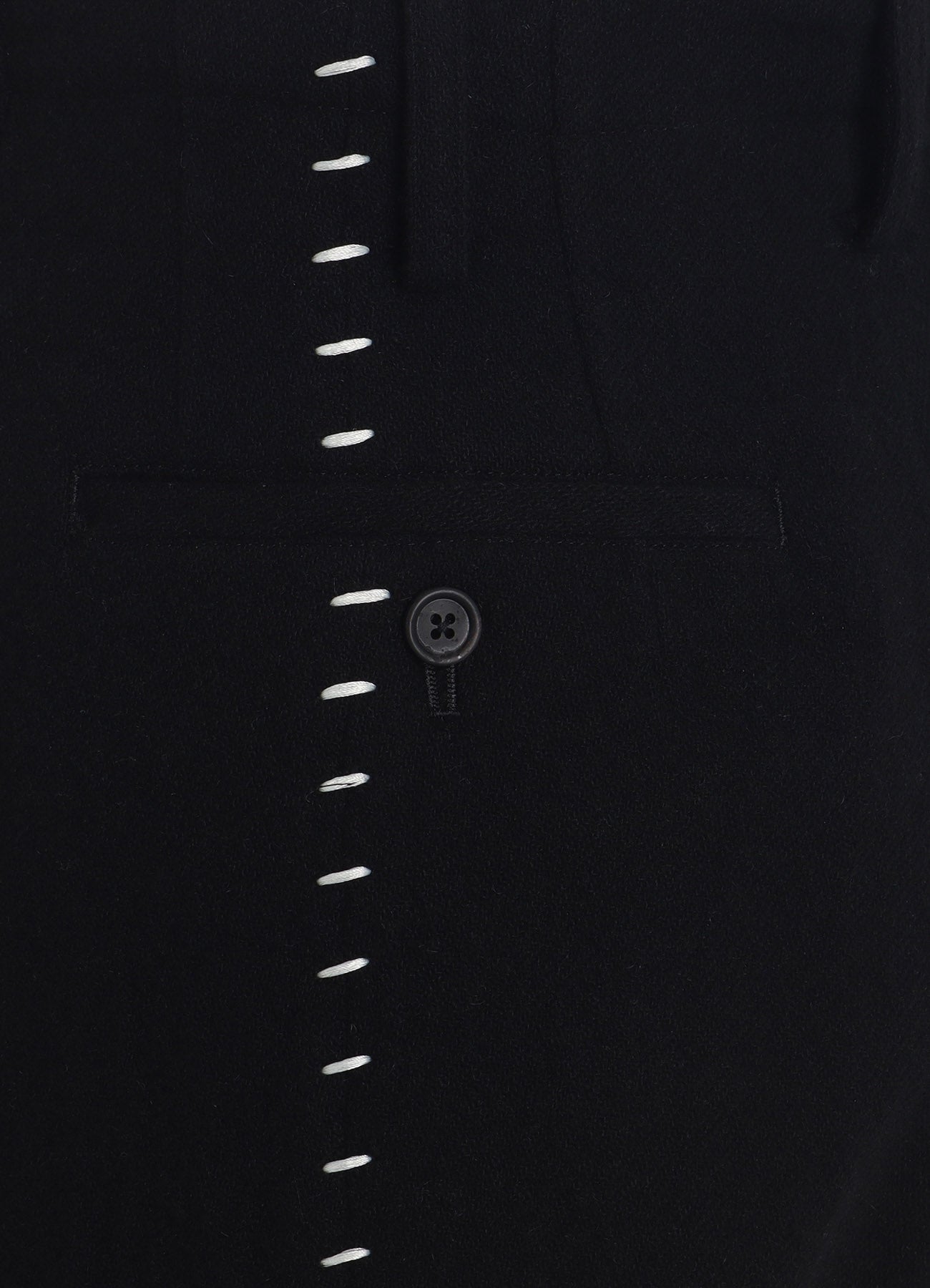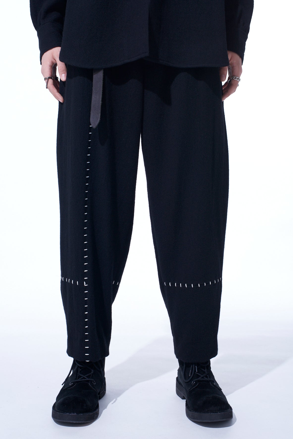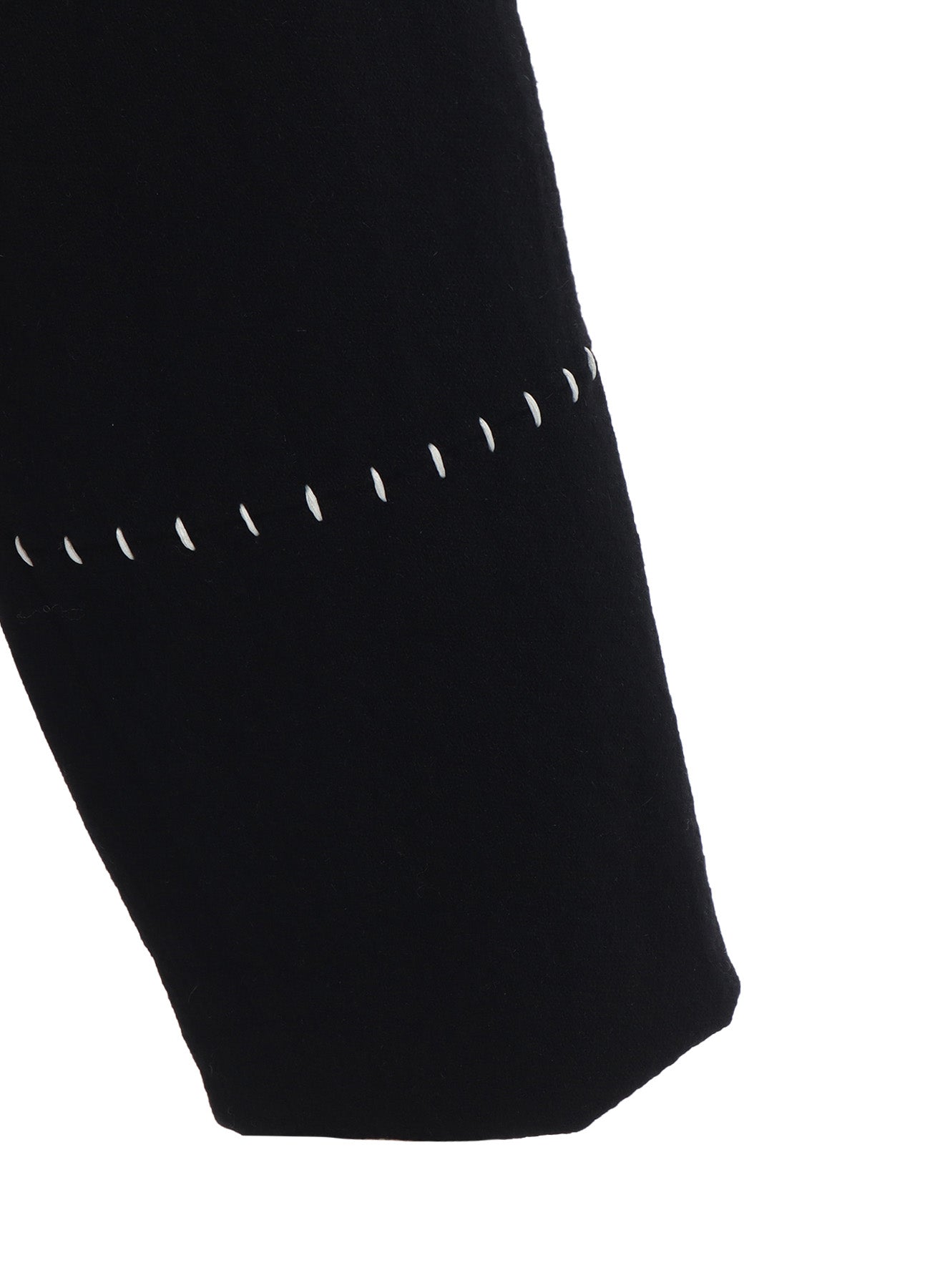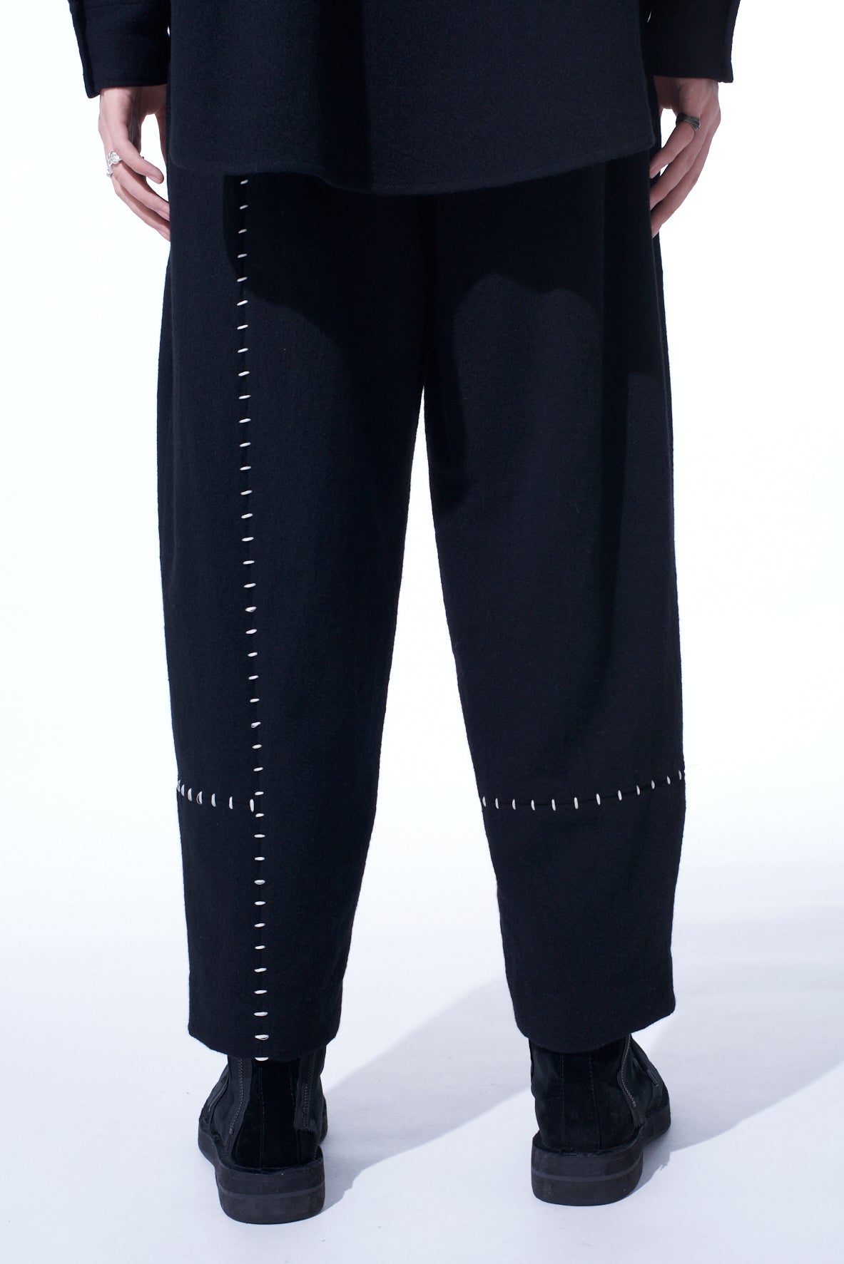 These wool flannel wide pants are designed for warmth, lightness, and comfort. They feature striking white stitching on a black background. With a simple pattern, a clever pocket detail, and a versatile silhouette, these pants enhance your outfit effortlessly.