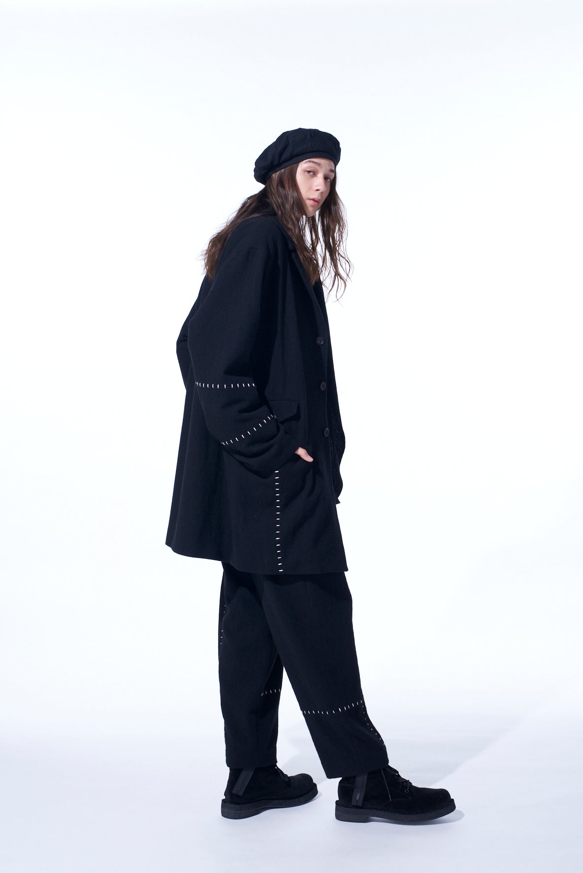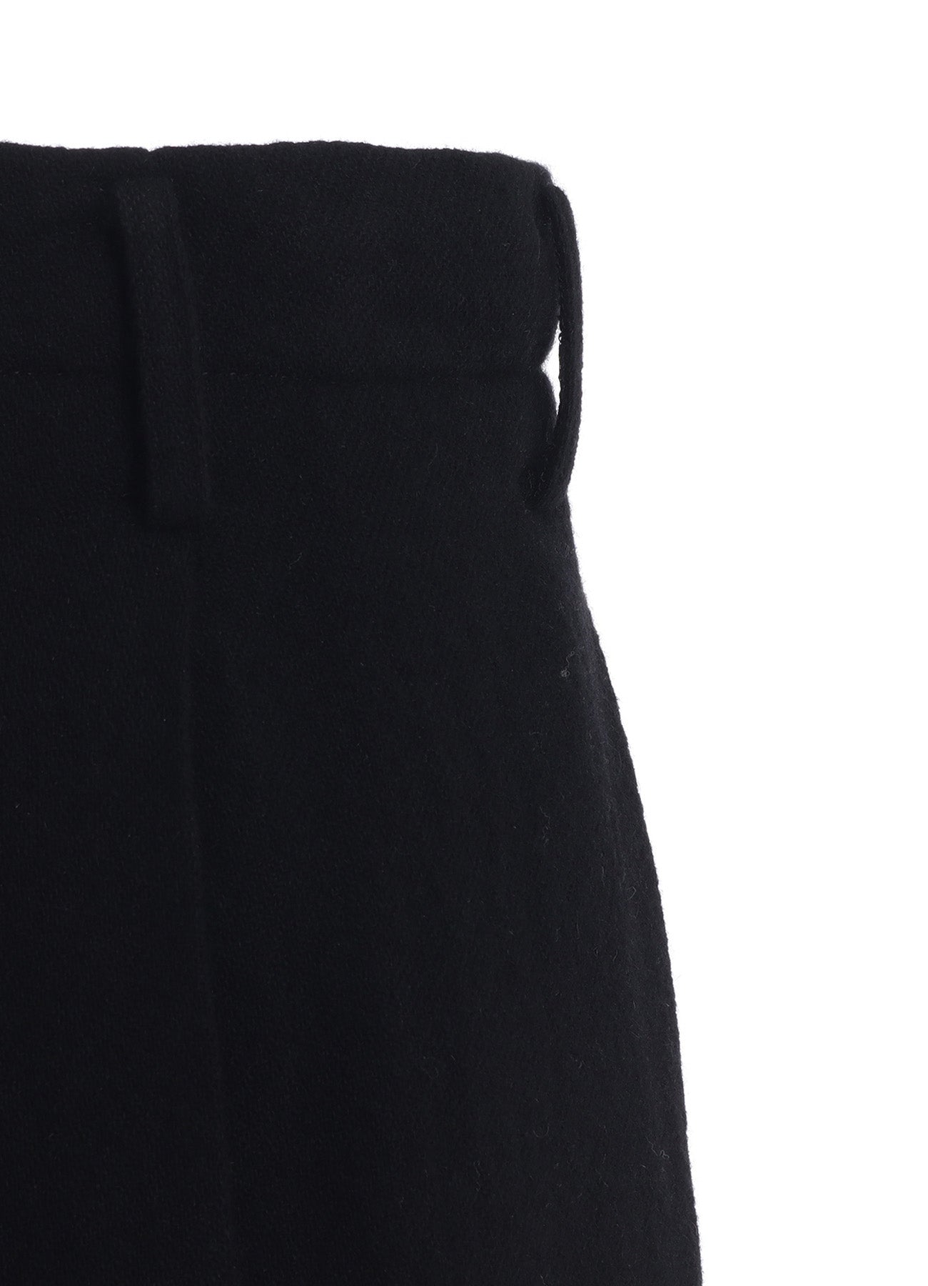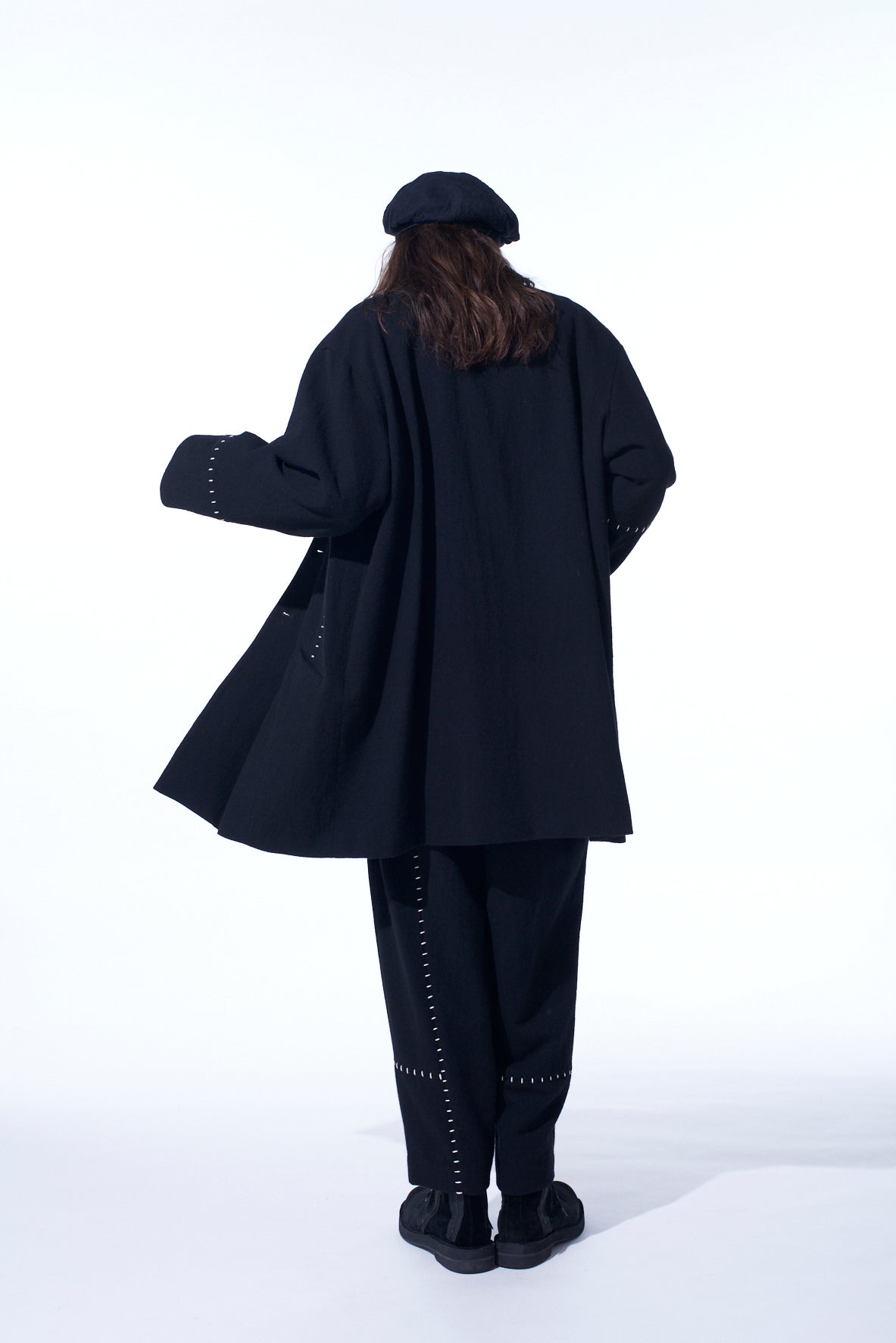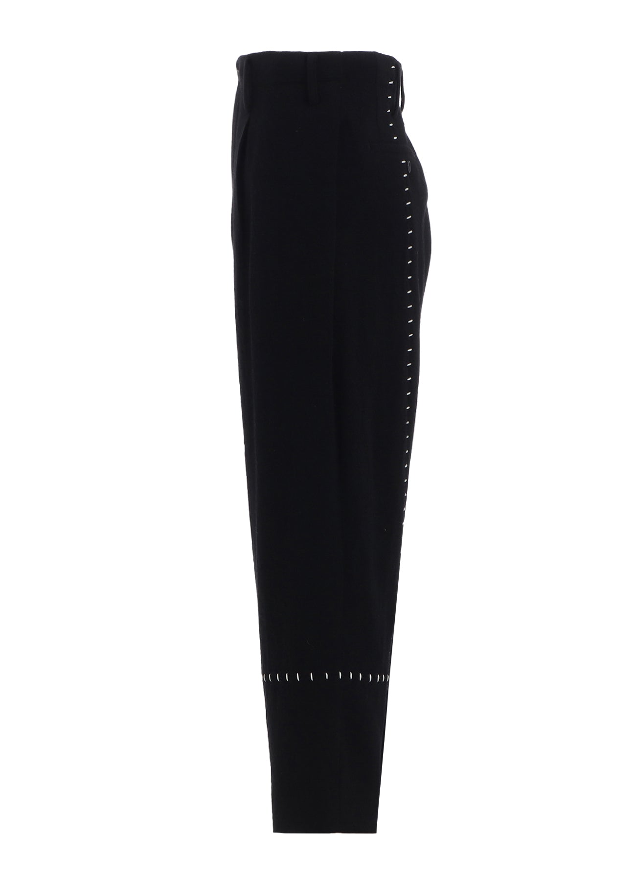 These wool flannel wide pants are designed for warmth, lightness, and comfort. They feature striking white stitching on a black background. With a simple pattern, a clever pocket detail, and a versatile silhouette, these pants enhance your outfit effortlessly.