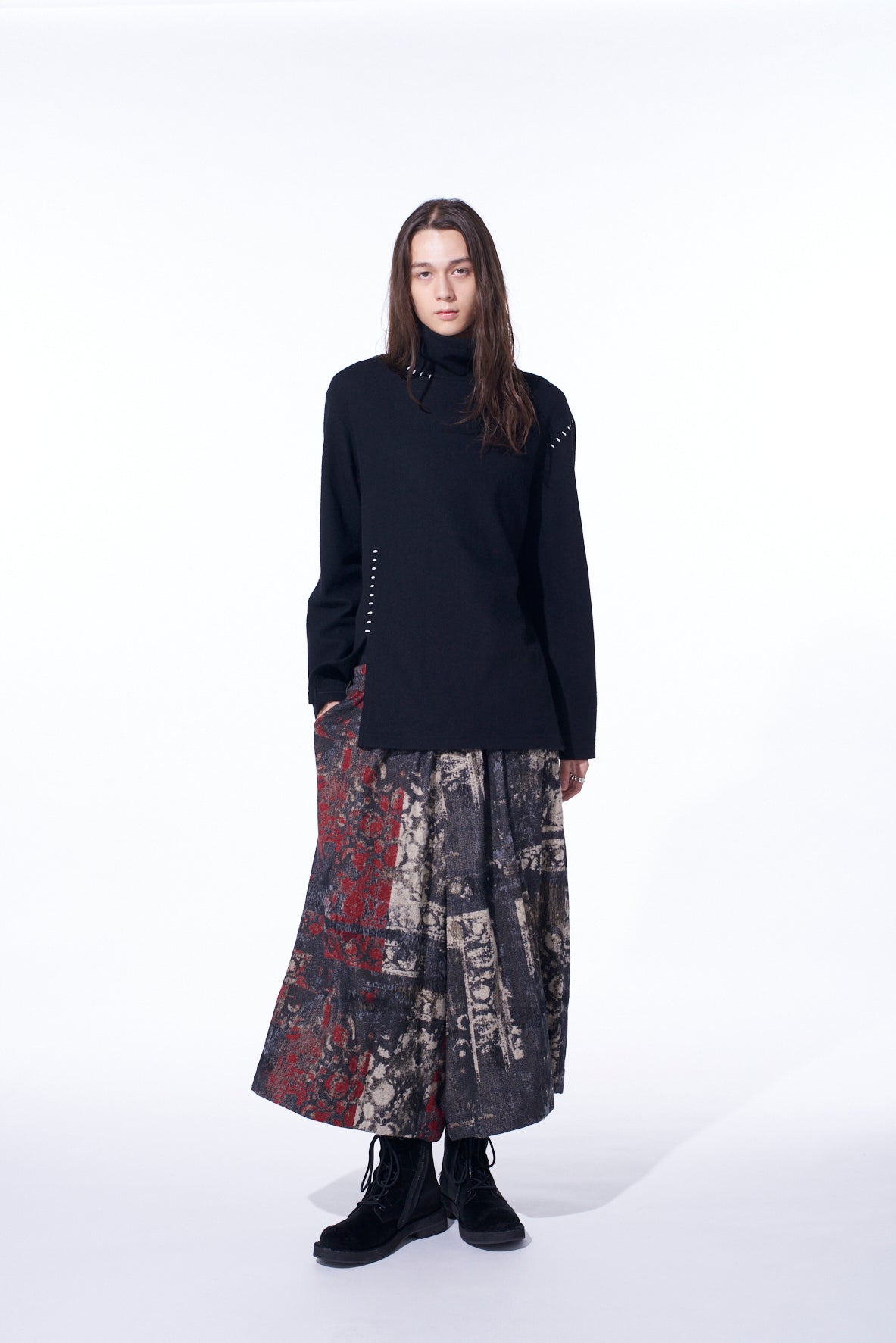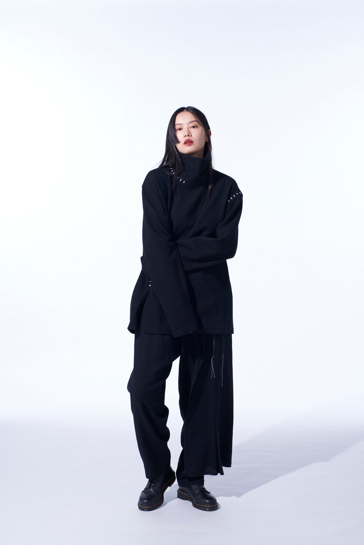A high-neck top featuring striking decorative stitches on the neckline and slits. The slits ensure a light feel and provide easy access to pants pockets. The fabric, refined using the natural properties of the yarn, offers a lightweight, voluminous texture, making it perfect for layering without added bulk.