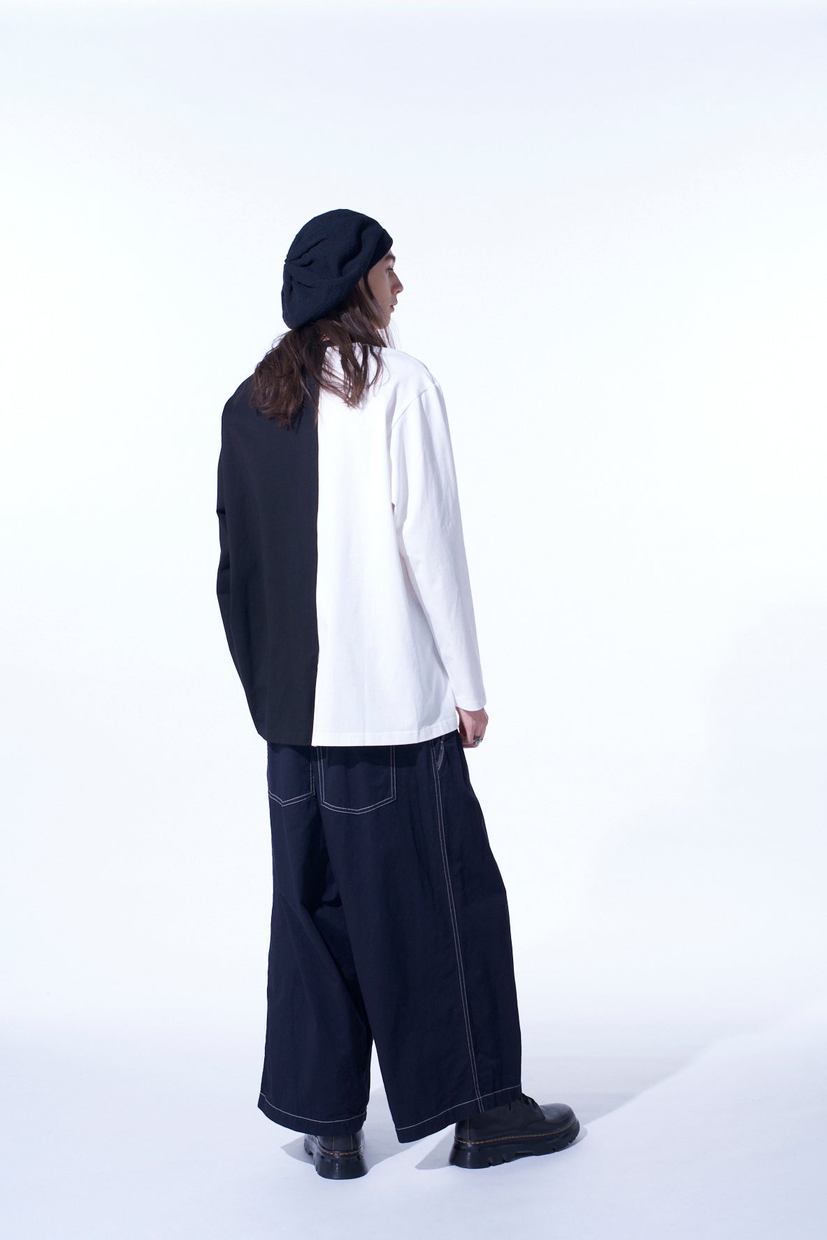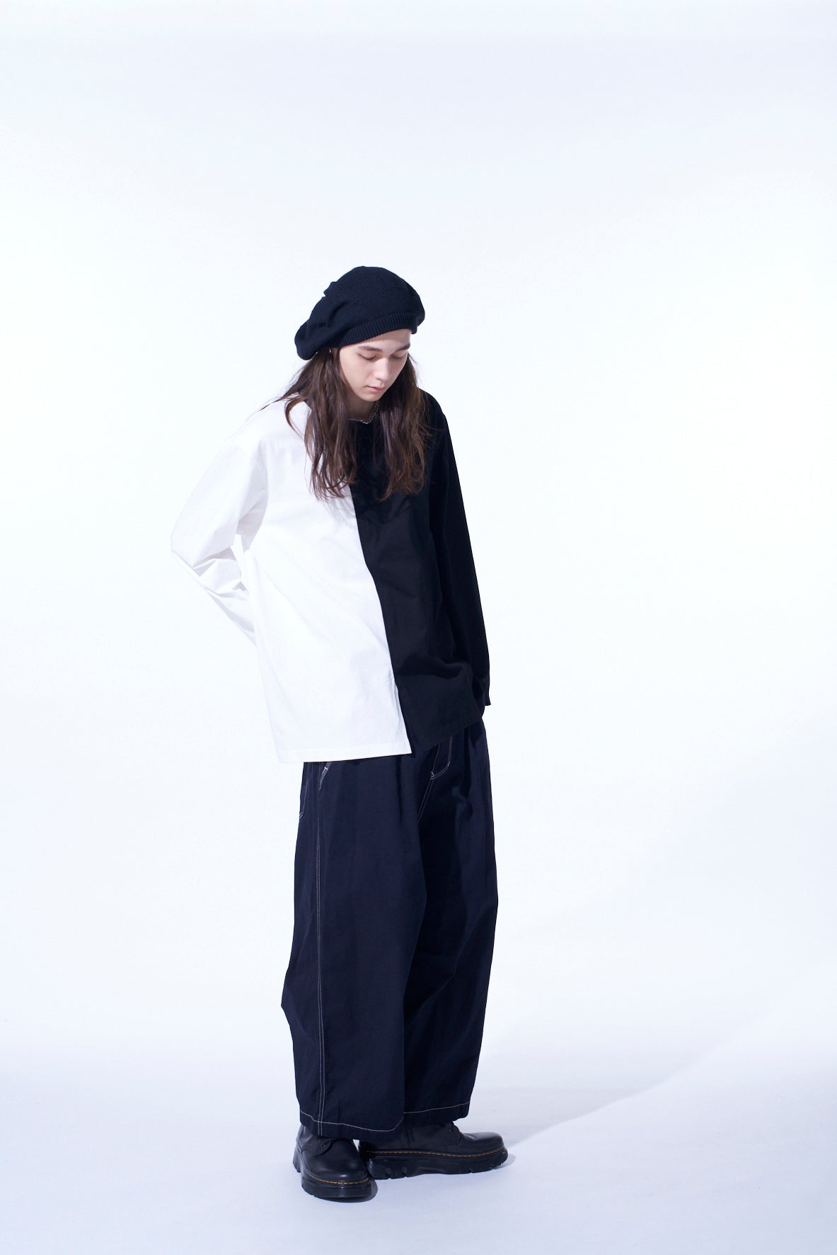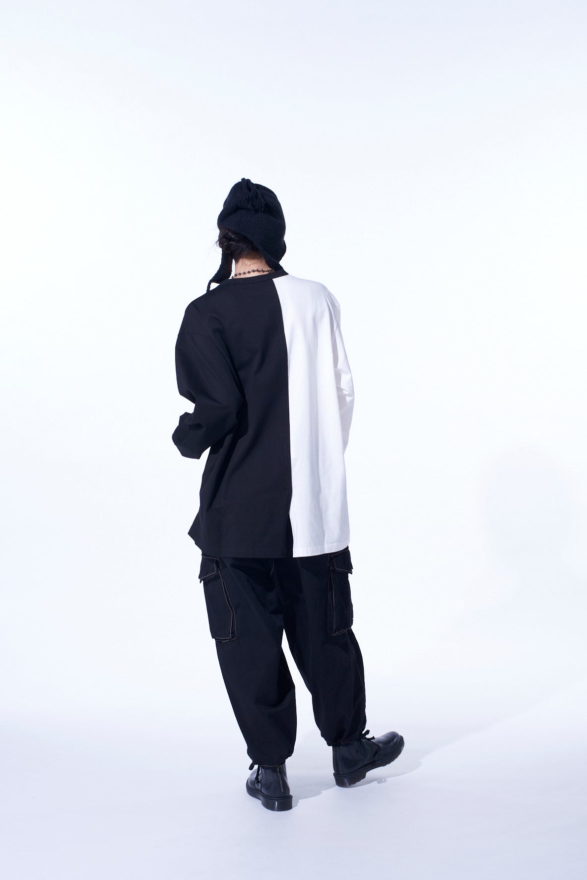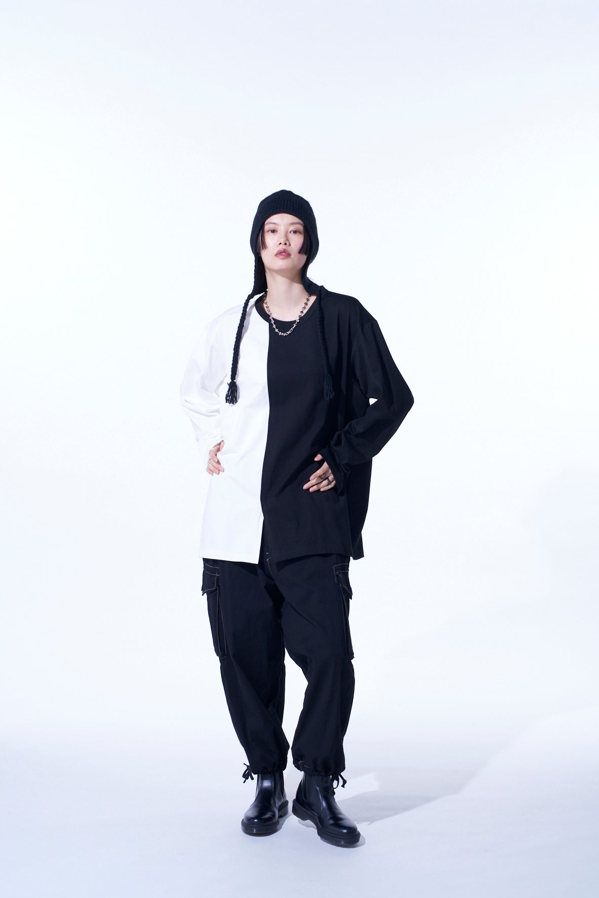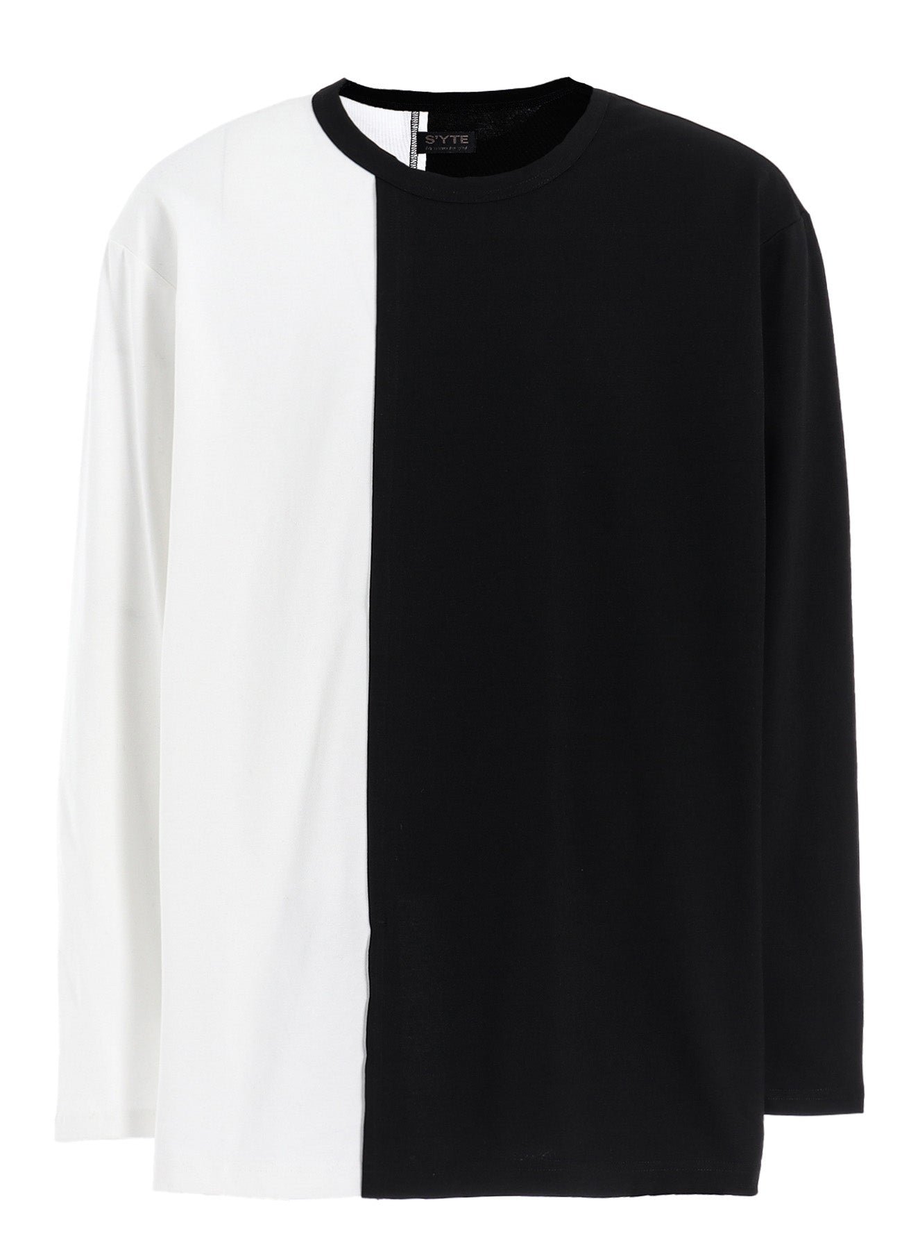 This monochrome top, characterized by its asymmetric color combination and longer length, is designed for versatile layering. Subtle yet distinctive details like front and back slits add to its charm. The durable plain stitch fabric offers comfort, making it ideal for daily wear. Perfect for creating refined monochrome outfits with jackets or shirts.