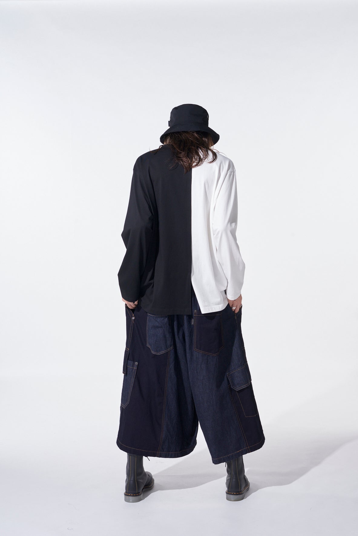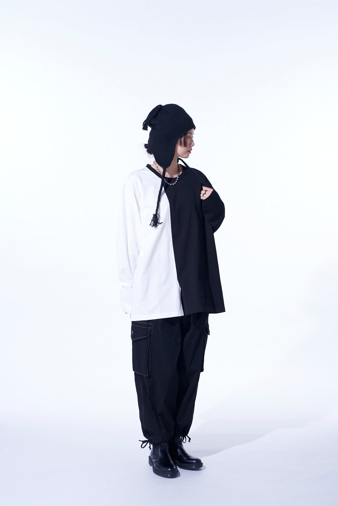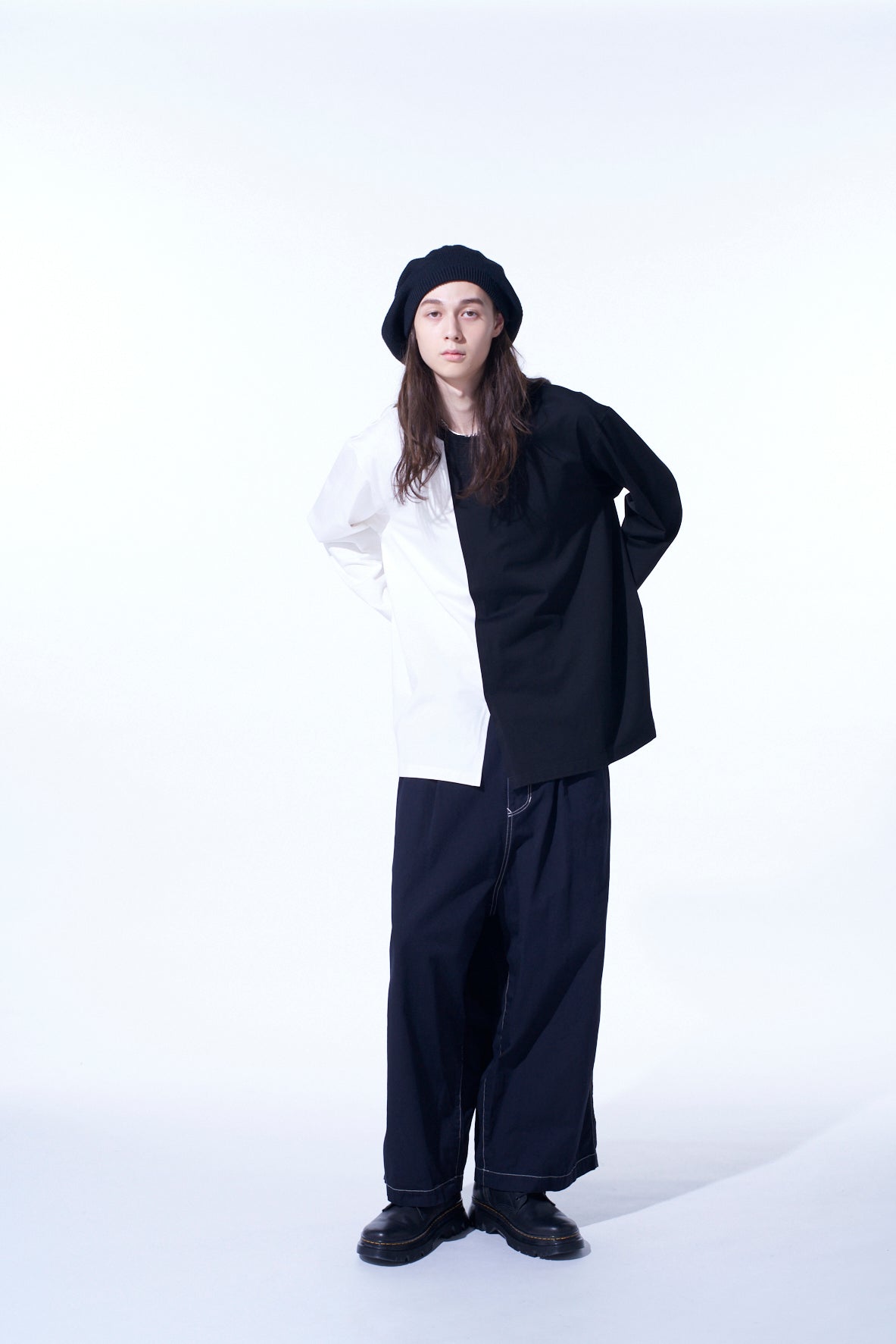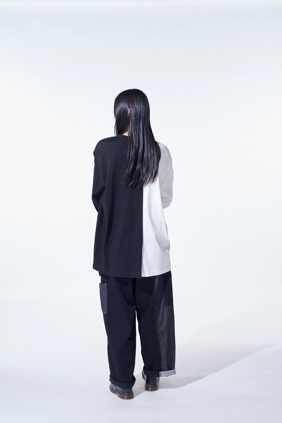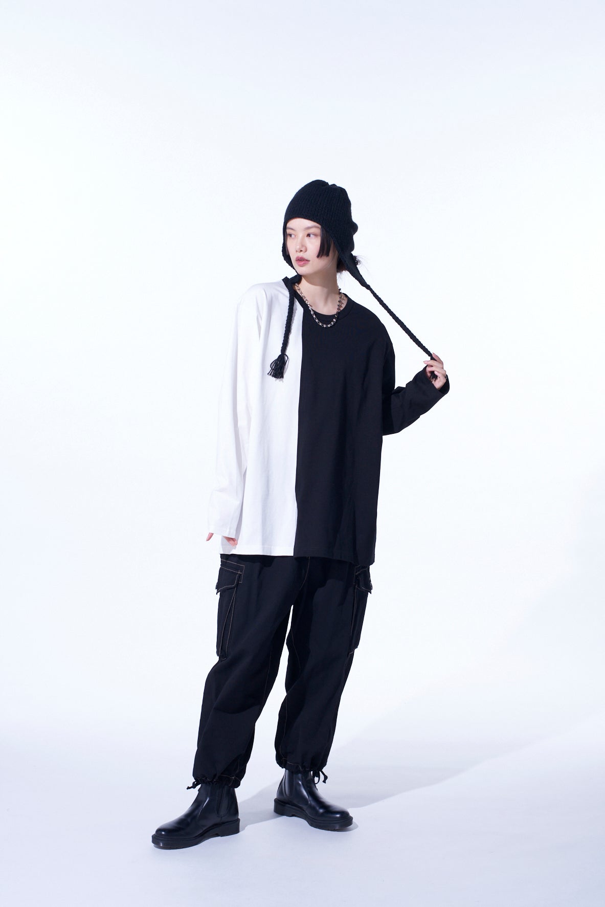 This monochrome top, characterized by its asymmetric color combination and longer length, is designed for versatile layering. Subtle yet distinctive details like front and back slits add to its charm. The durable plain stitch fabric offers comfort, making it ideal for daily wear. Perfect for creating refined monochrome outfits with jackets or shirts.