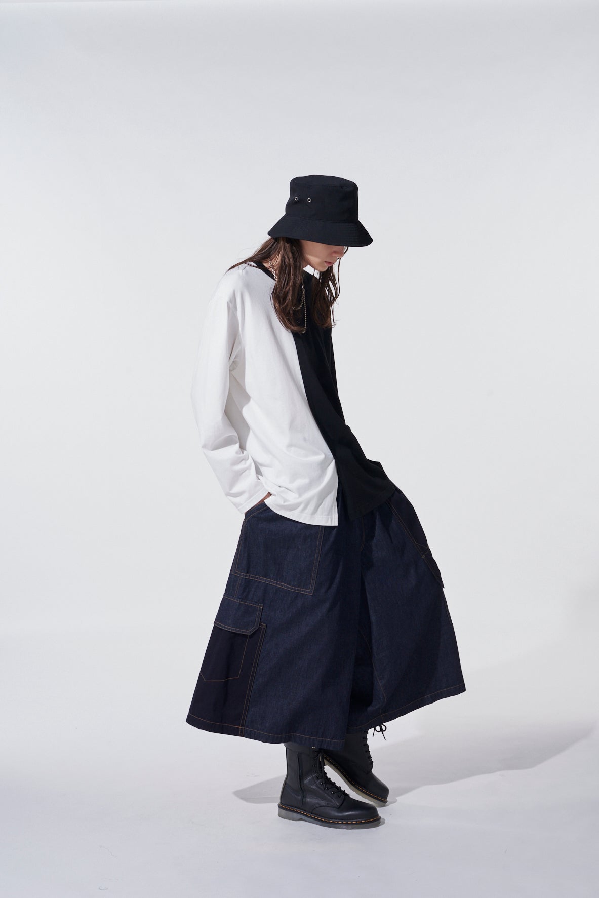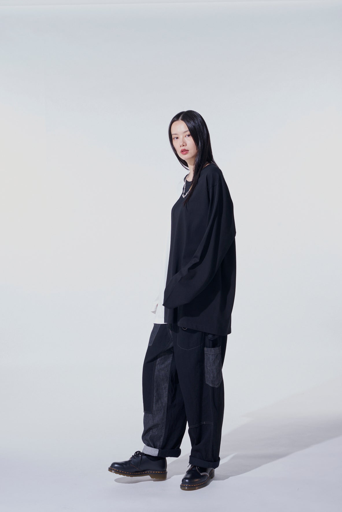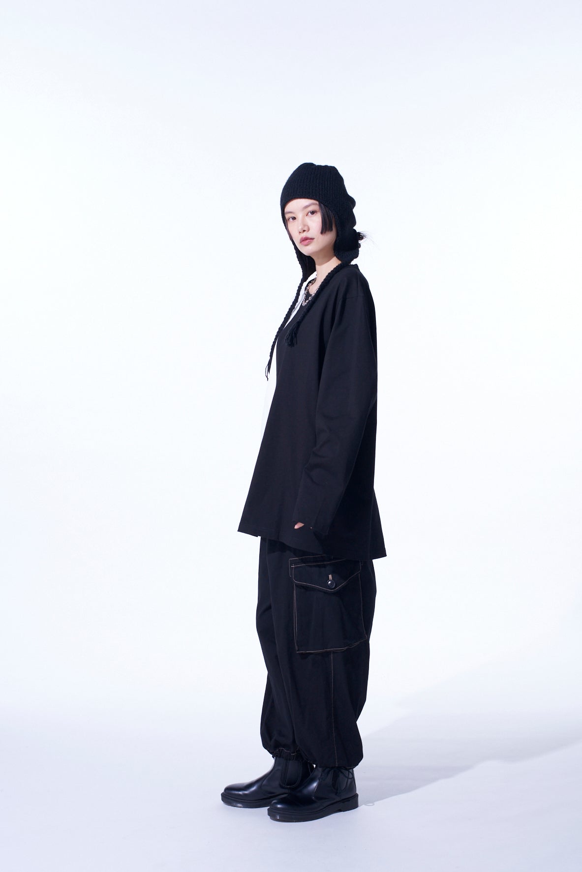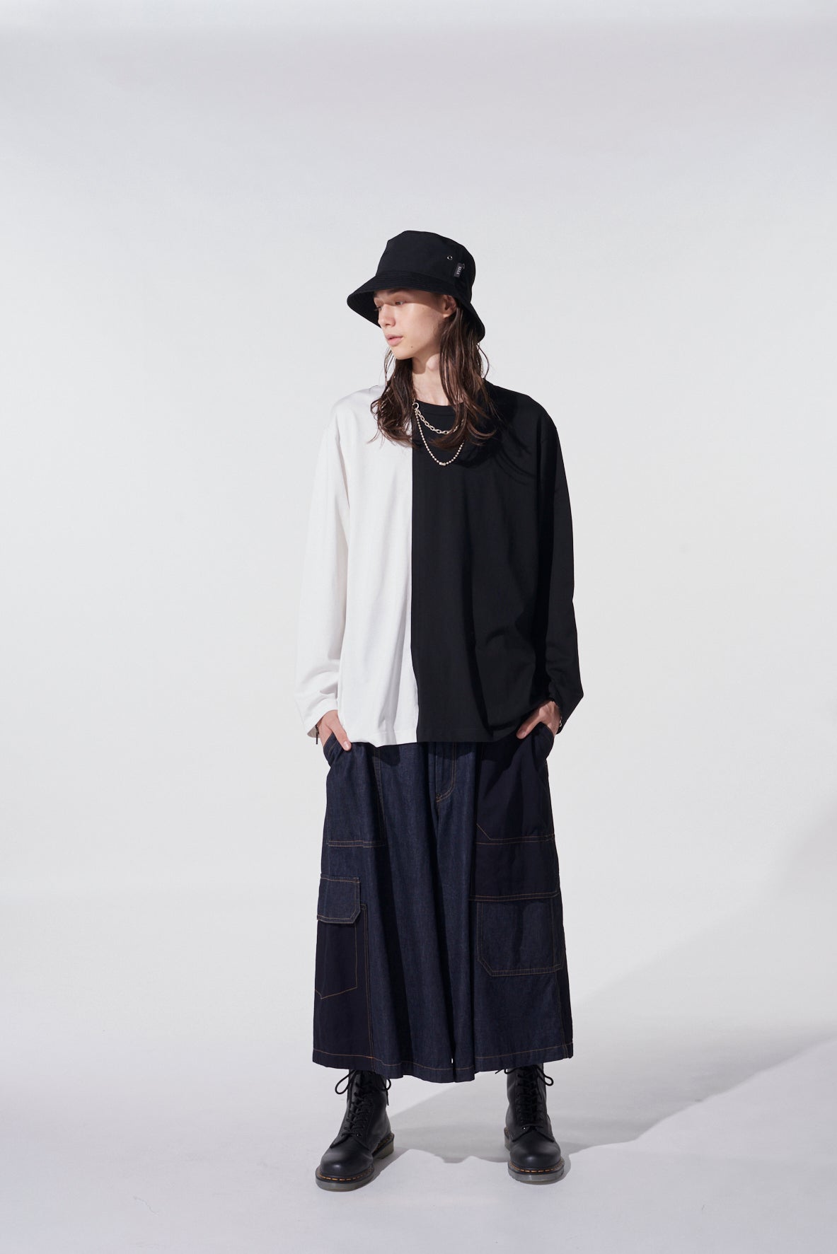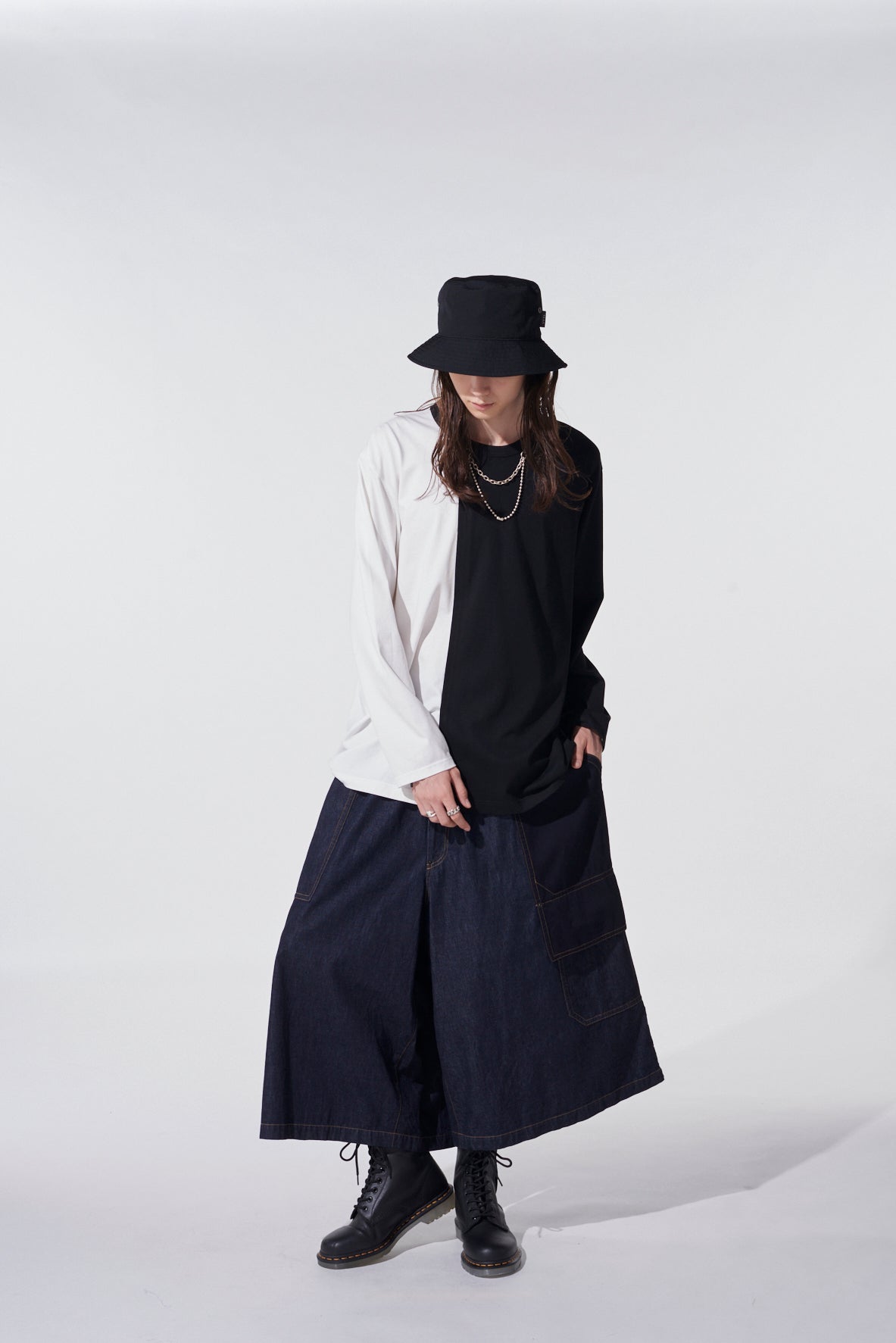 This monochrome top, characterized by its asymmetric color combination and longer length, is designed for versatile layering. Subtle yet distinctive details like front and back slits add to its charm. The durable plain stitch fabric offers comfort, making it ideal for daily wear. Perfect for creating refined monochrome outfits with jackets or shirts.