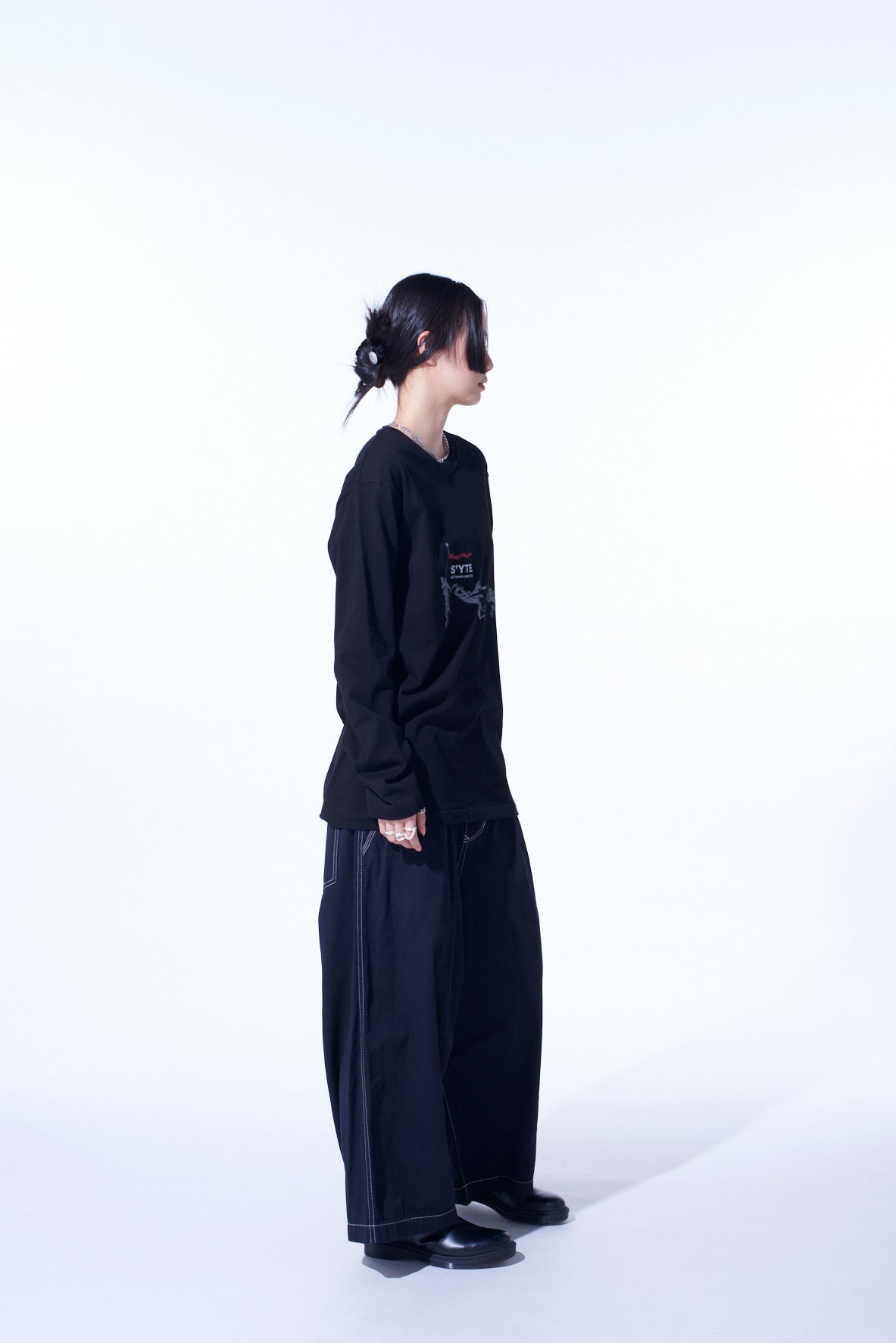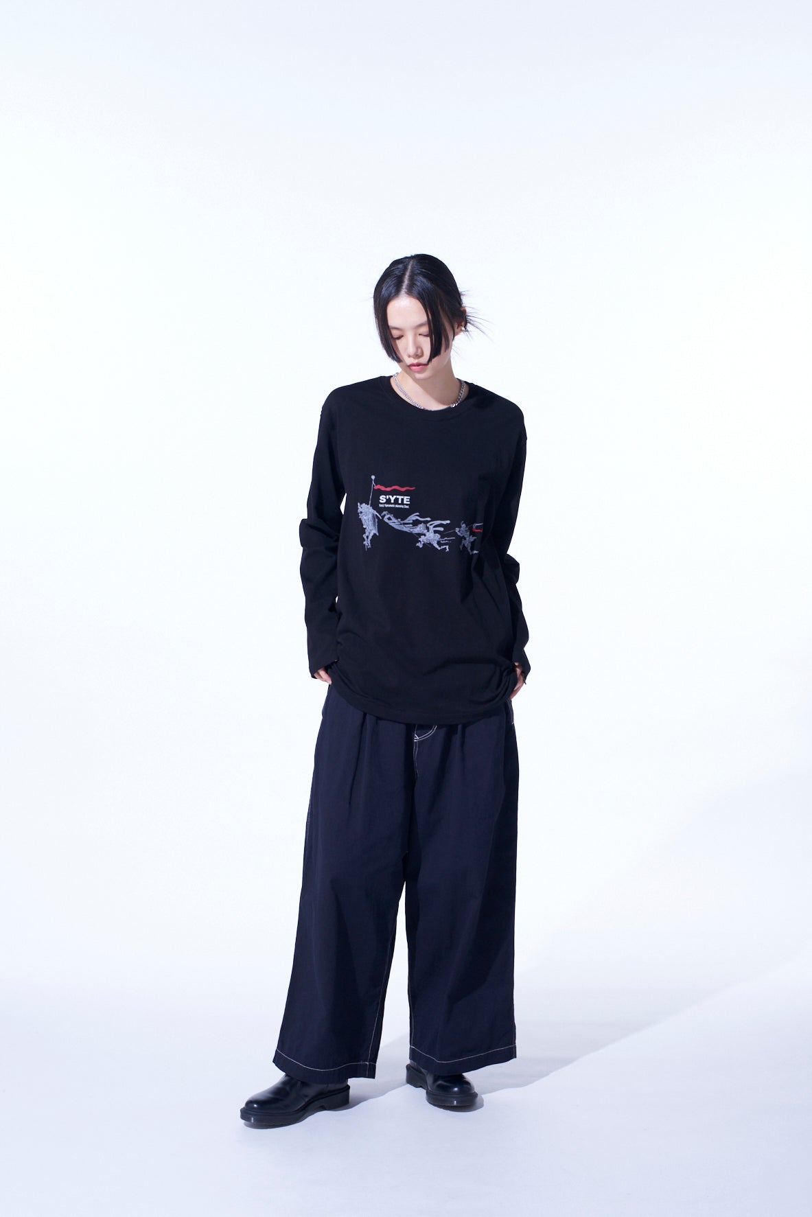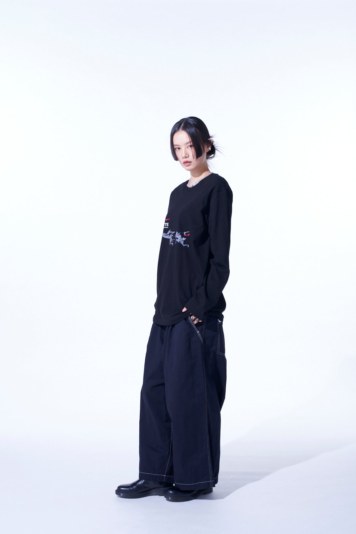 This graphic top uniquely blends the spirit of Hyakki Yako with playful, exaggerated imagery. Featuring grayish-toned prints on a black body, the T-shirt adds flair to any outfit, whether worn alone or as inner wear. Crafted in collaboration with Kume Sen-i Co.,Ltd., it boasts comfort and a better fit over time.