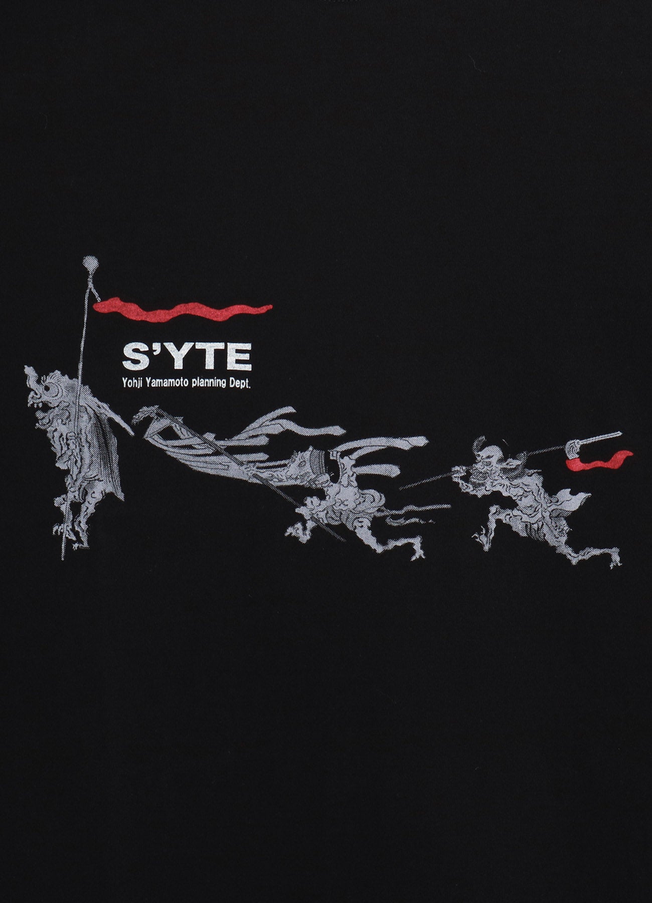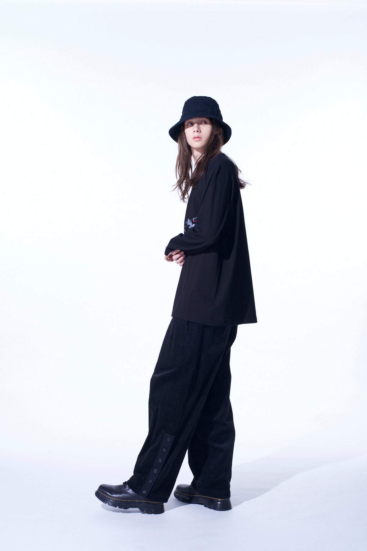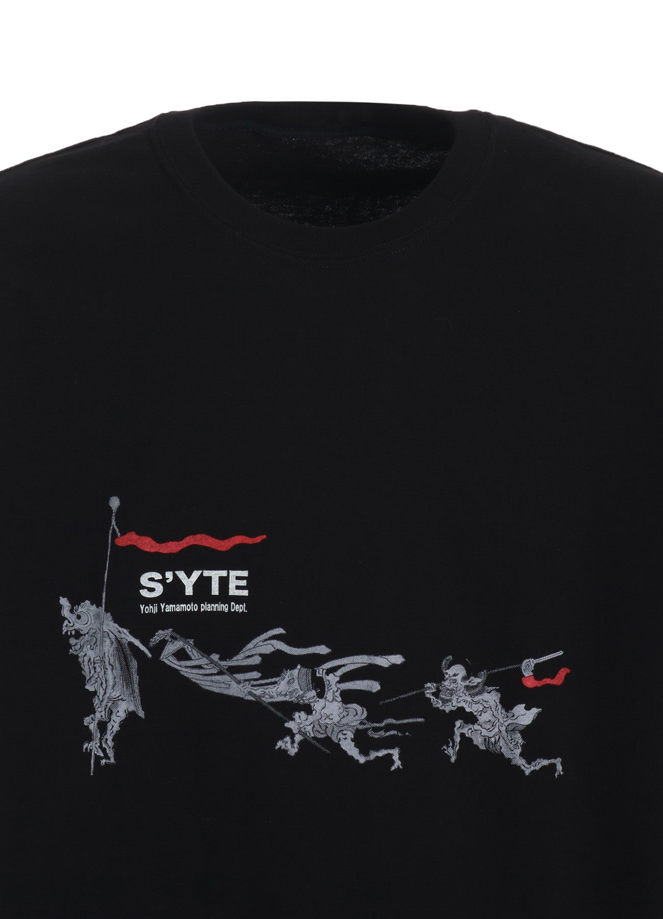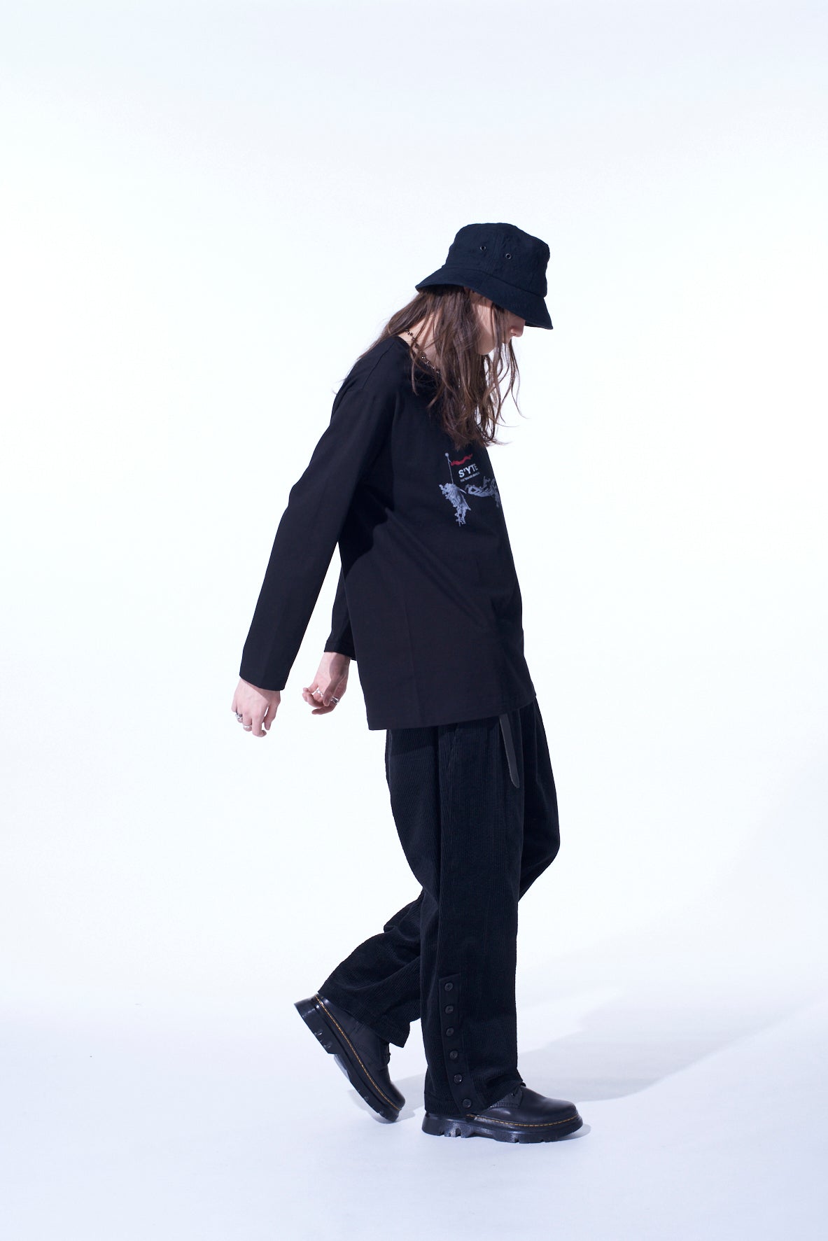 This graphic top uniquely blends the spirit of Hyakki Yako with playful, exaggerated imagery. Featuring grayish-toned prints on a black body, the T-shirt adds flair to any outfit, whether worn alone or as inner wear. Crafted in collaboration with Kume Sen-i Co.,Ltd., it boasts comfort and a better fit over time.