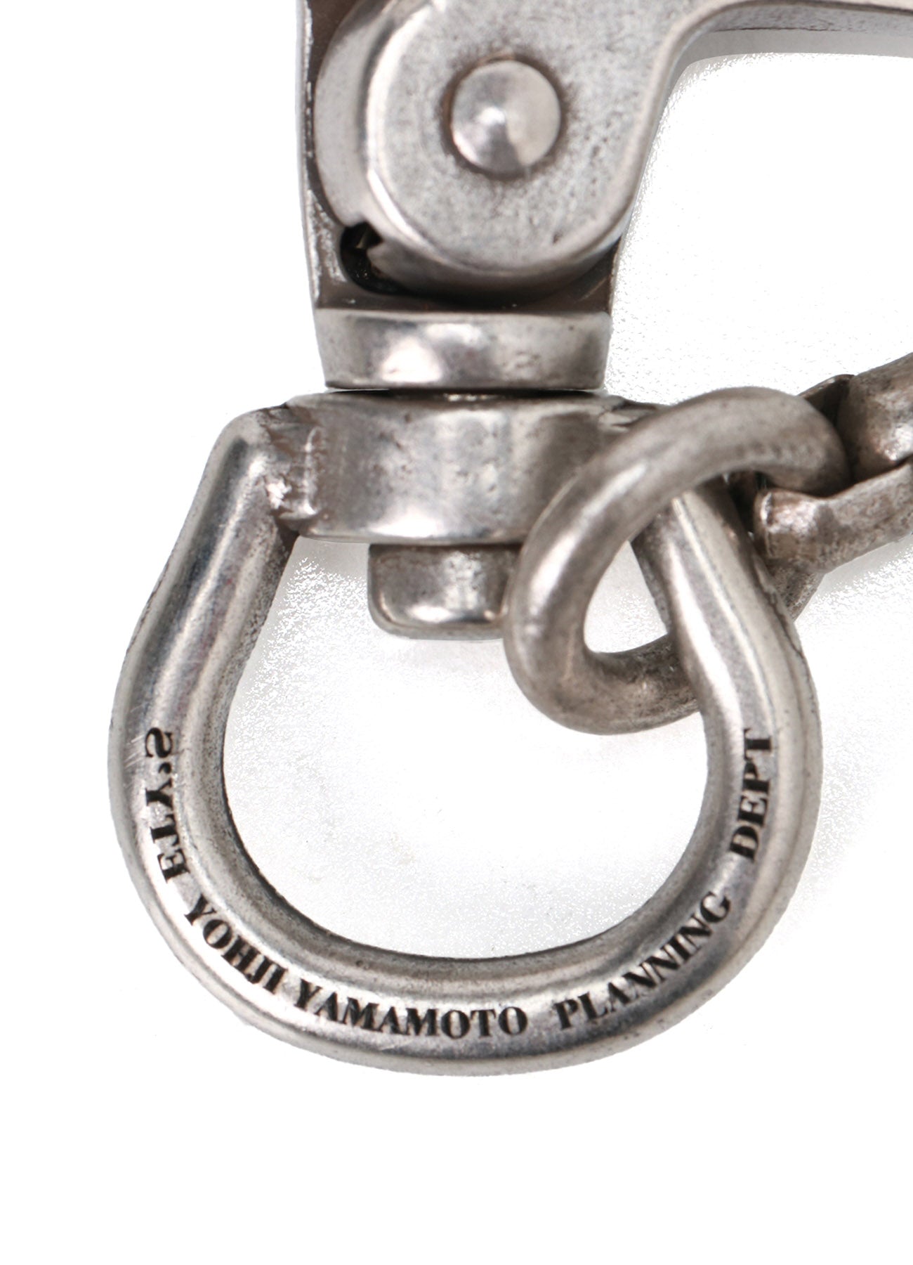 This Venetian chain wallet cord features alternating square parts in vertical and horizontal combinations. It has a lever-style snap hook and a screw-style carabiner for an intricate design. With a subdued, antique-like shine and modern volume, it pairs well with dressy pants, while the S’YTE logo adds a subtle accent.