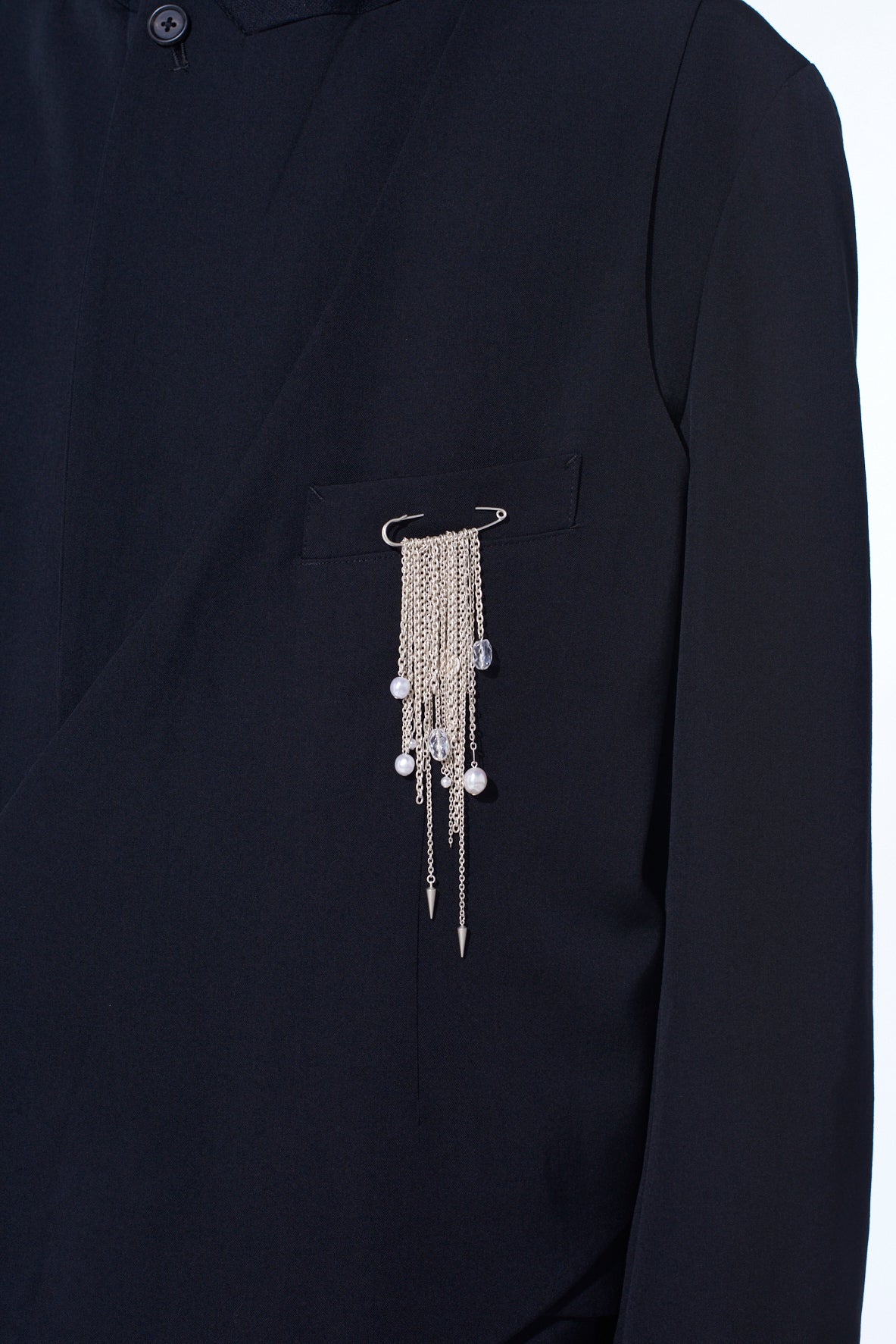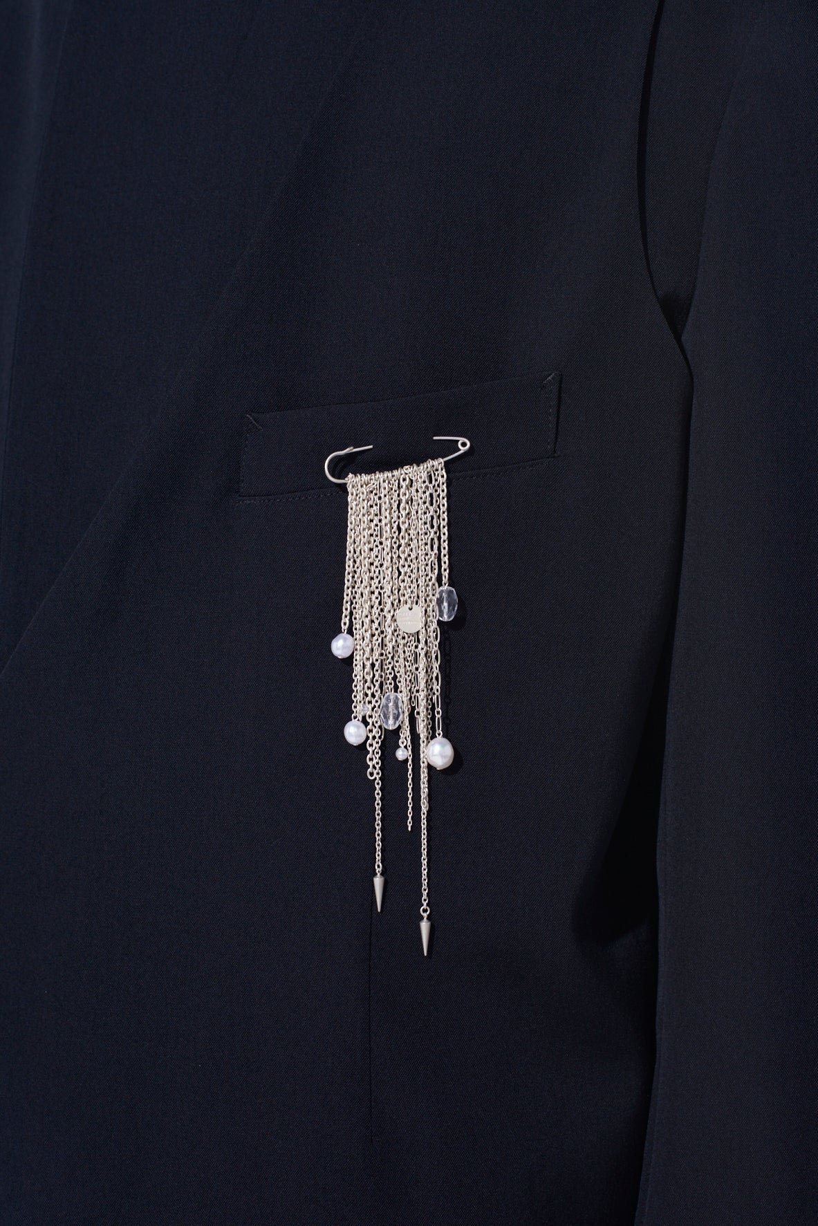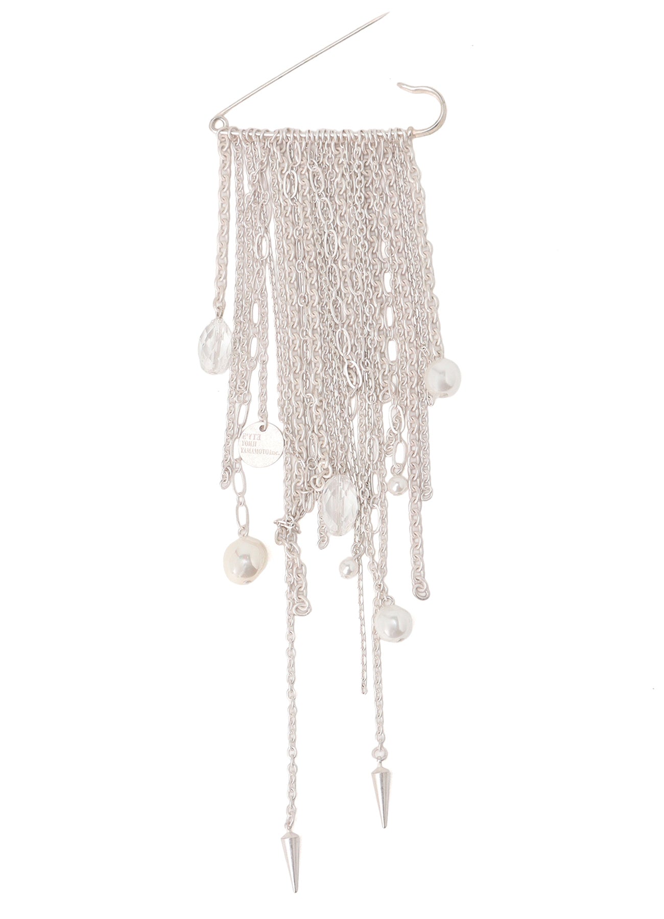 This striking chain brooch features a soft silver plating on brass, combining various chains with crystals and plastic pearls for a fusion of classic and modern design. It adds individuality and elegance to any outfit with a simple touch; versatile enough for jackets or bags.