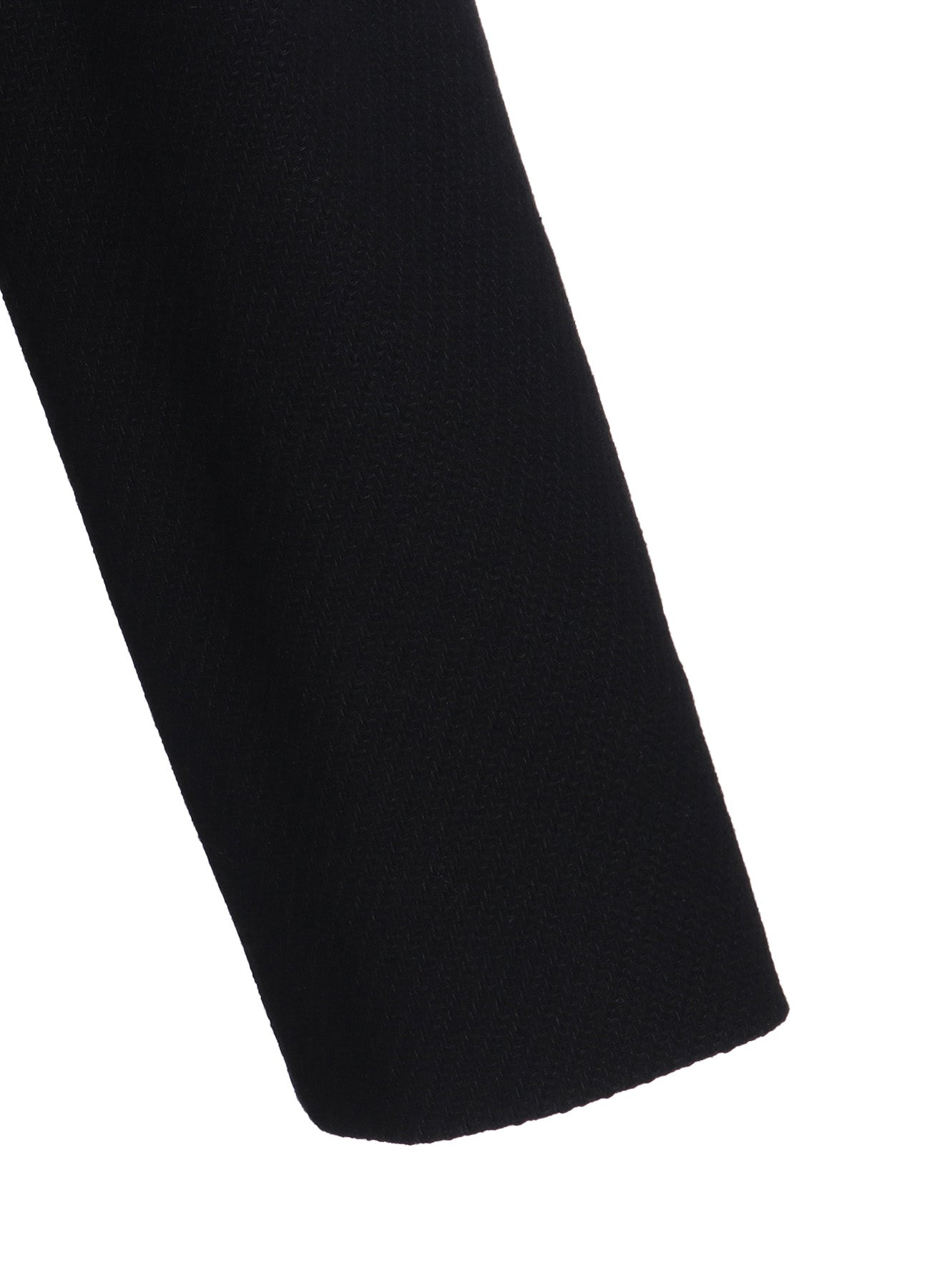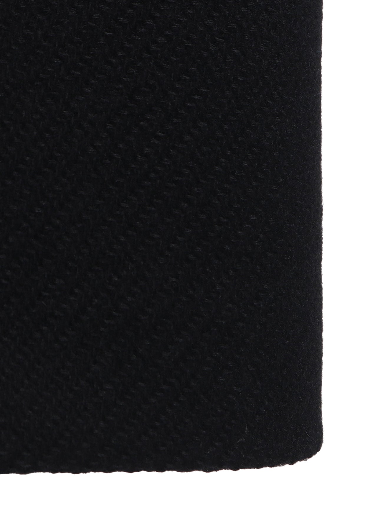 "This double-breasted long coat offers a soft appearance, featuring British kersey fabric with a textured and firm quality. Made by intertwining wool threads through a dobby twill weave for a three-dimensional effect, it has a cylindrical collar and lapel that gently hug the neck, snap-button front, and accentuating large outer pockets.