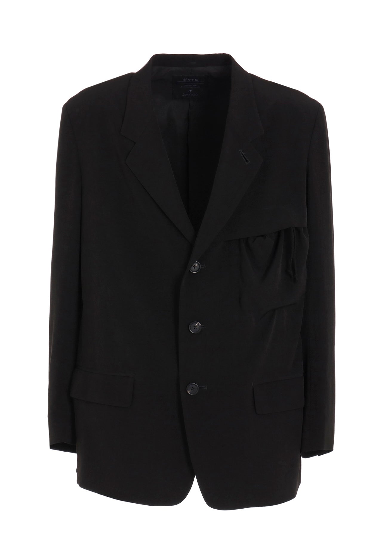 This tailored jacket by Yohji Yamamoto features a unique three-button design made with their signature material, offering a beautiful silhouette with movement. Décor includes a drawstring pouch pocket on the left chest and right back hem. The structured yet sophisticated design is an elegant fusion of classic and modern elements.