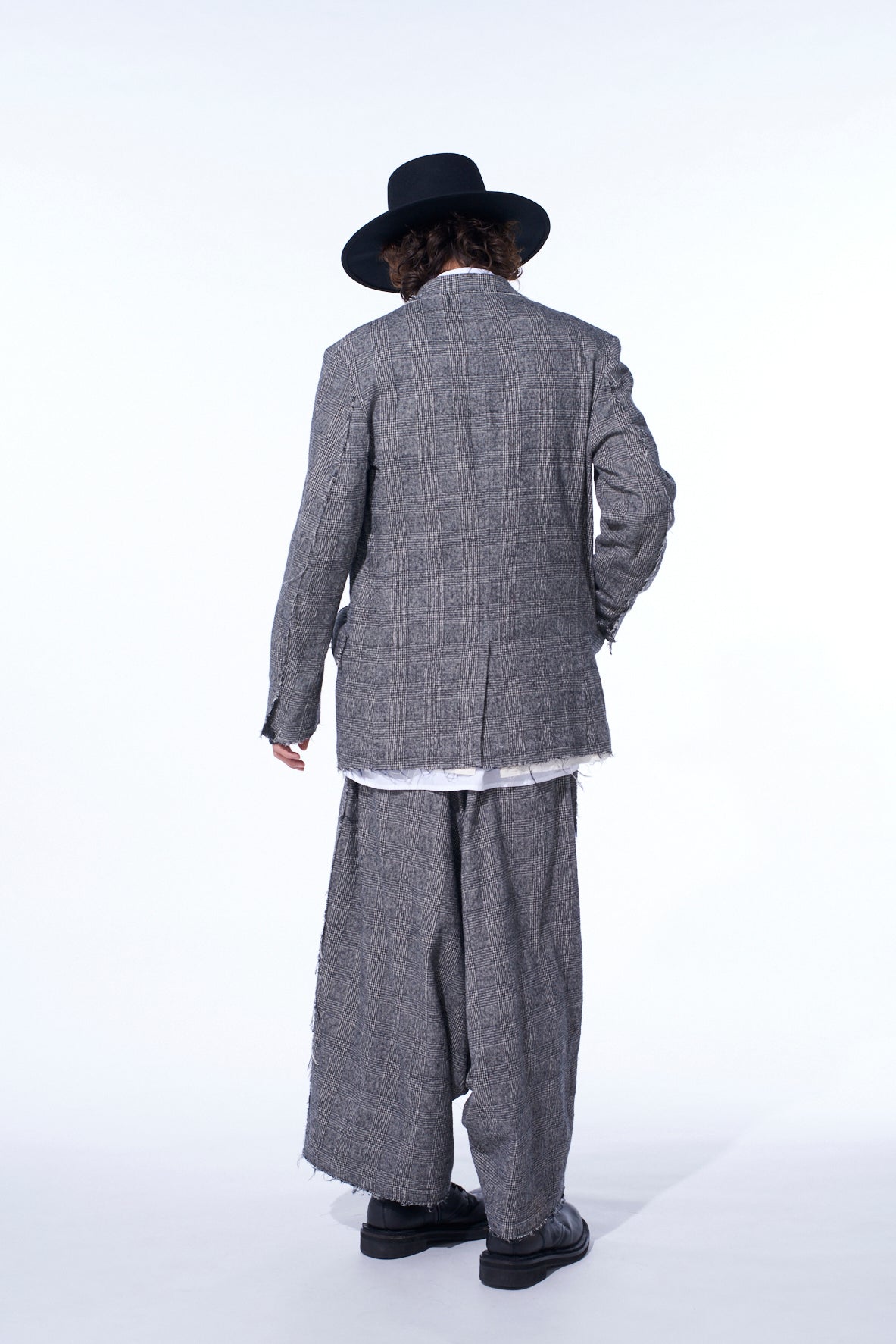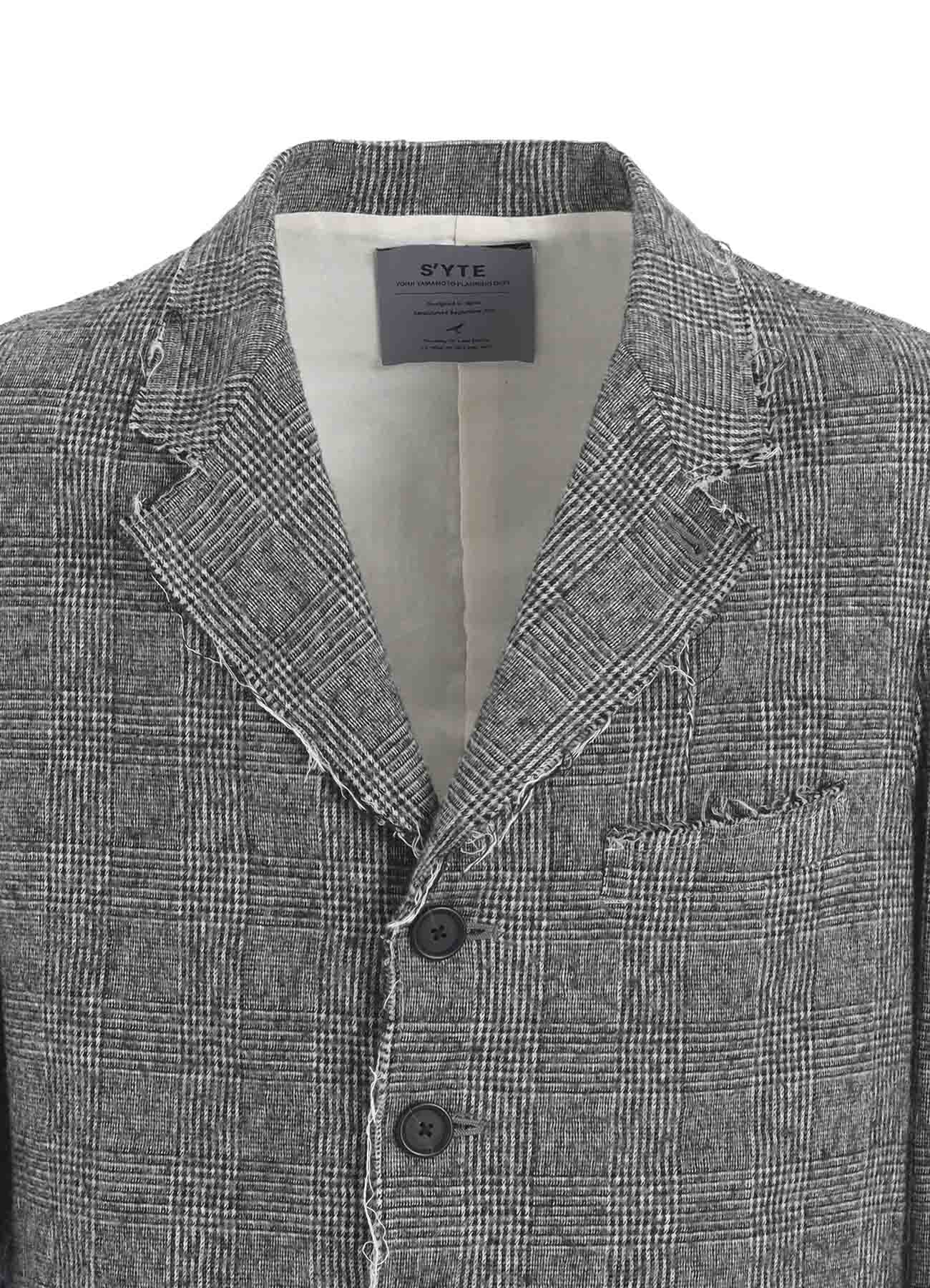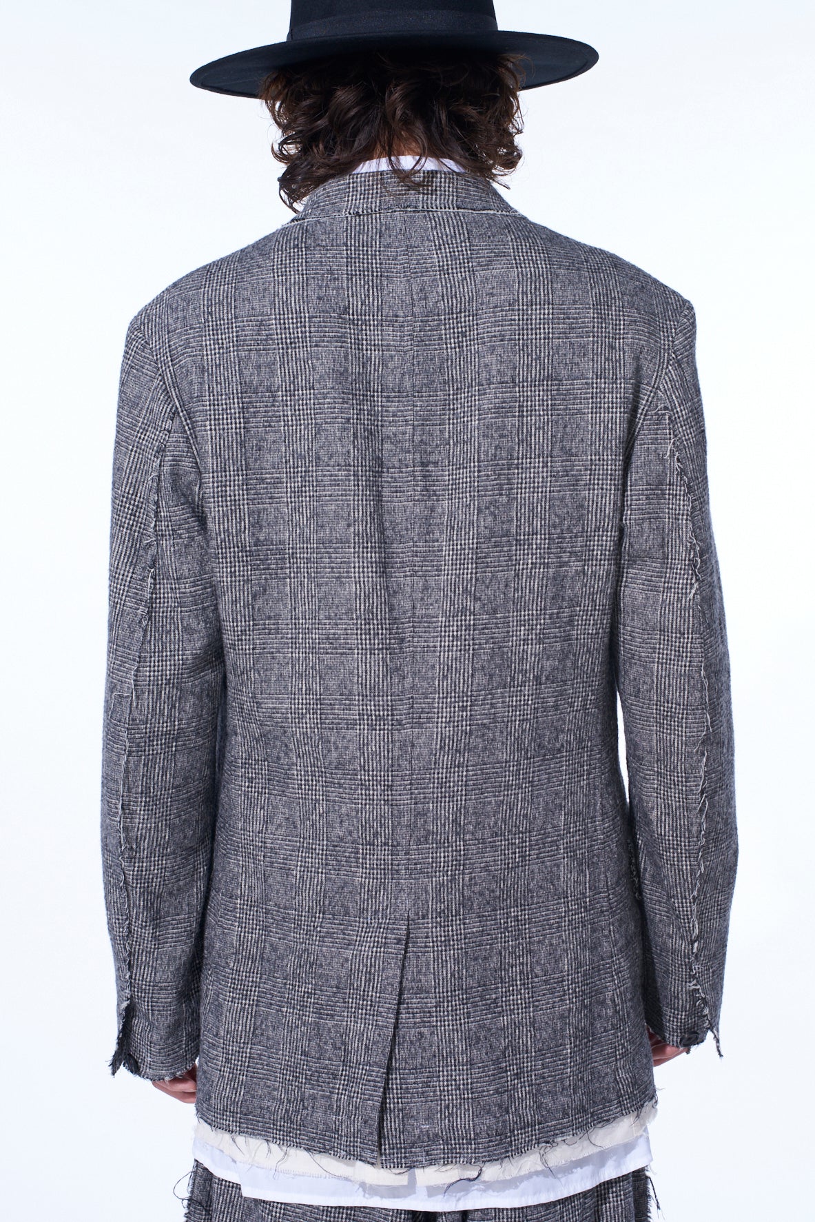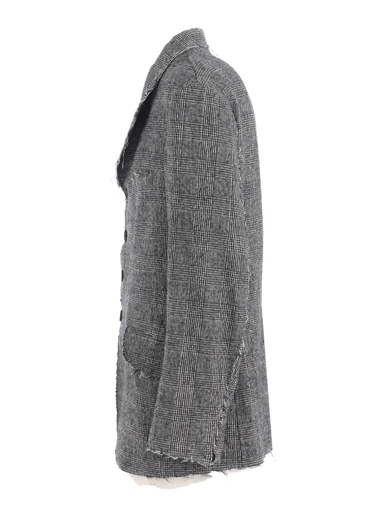 This tailored jacket is made with cotton warp and wool weft and features a fulled process for a unique texture. It includes a full lining with a subtly visible floating hem design. The raw edge details on the front and sleeves give the classic Glen plaid pattern a modern twist.